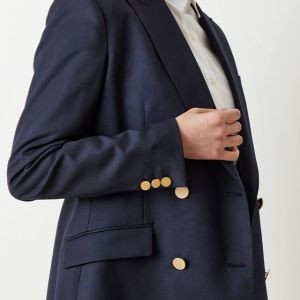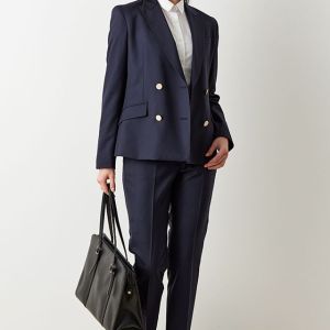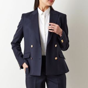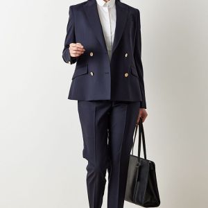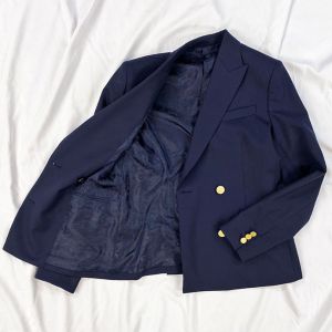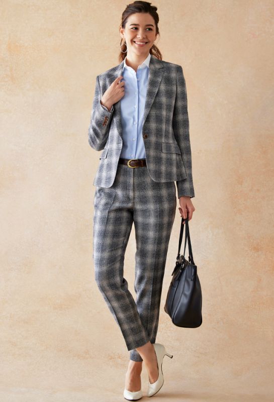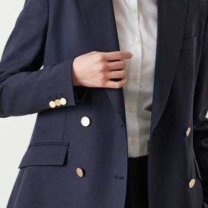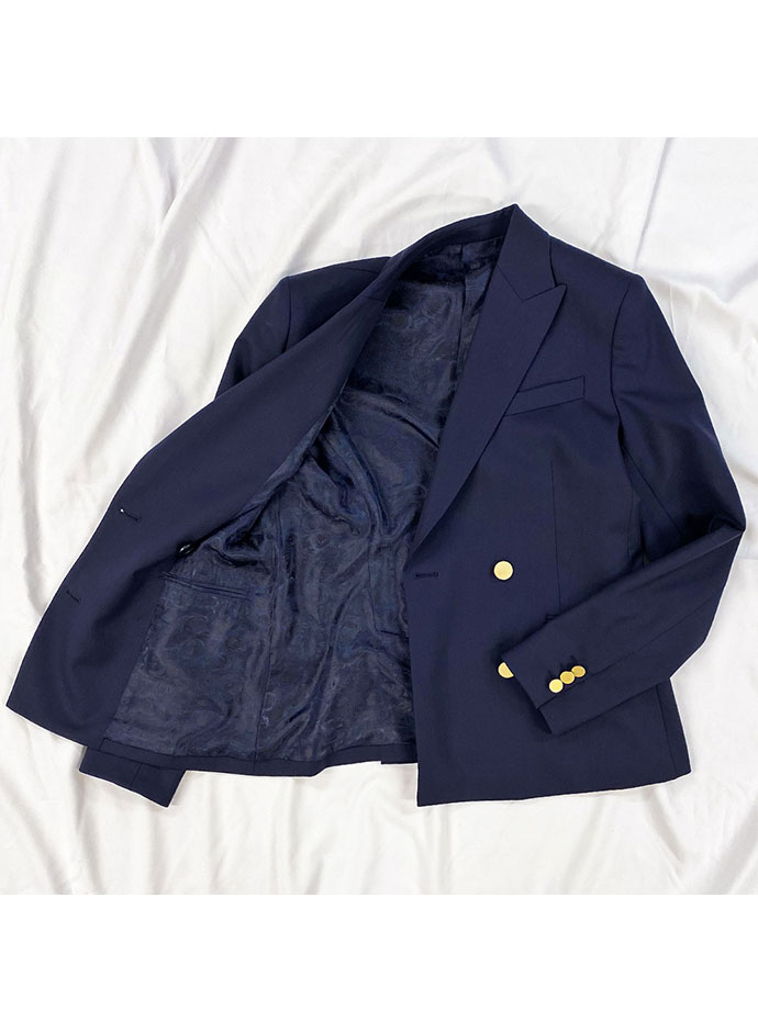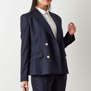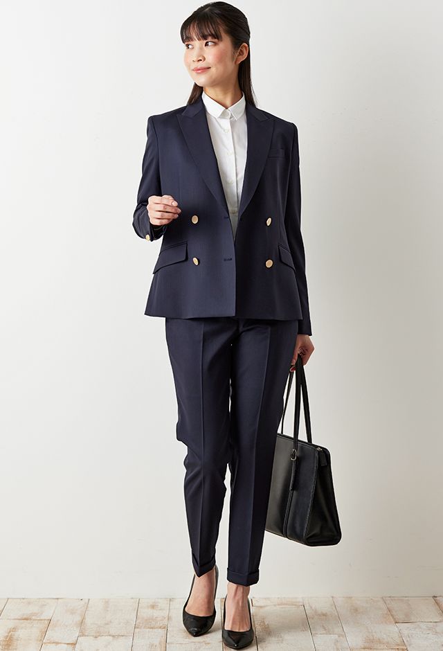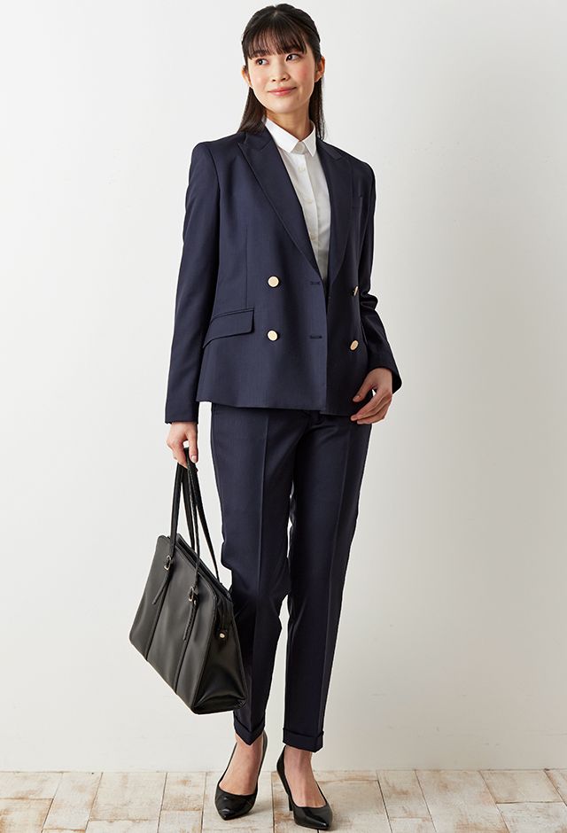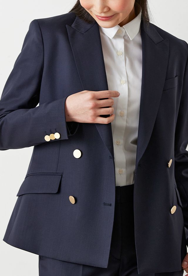 防シワ性やストレッチ性に優れ、出張・外回りの際にも美しいシルエットと着心地を実現できるオリジナルブランド「トラベルウール」で仕立てたスーツです。人気のダークネイビーにしっとりとした生地感のスタイルで、オールシーズン着用していただけます。女性らしい優美なラインを演出しながら、スマートな雰囲気を出せるダブルジャケットで仕立てました。高級感のある優美なネイビーのバラ柄裏地を採用。特徴的なピークドラペルで存在感をプラスしました。いつものビジネスシーンに取り入れやすい1着に◎