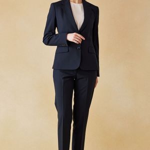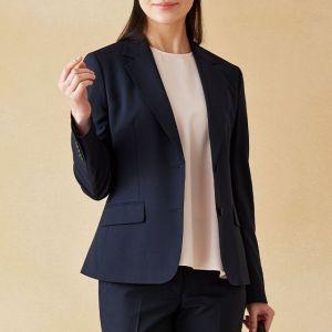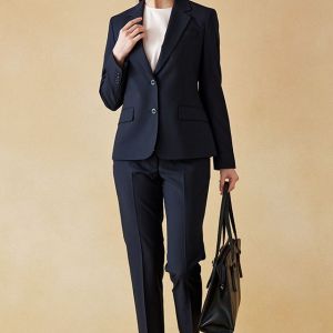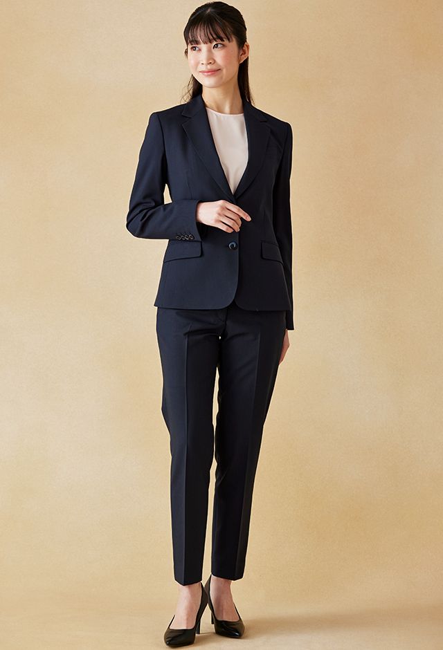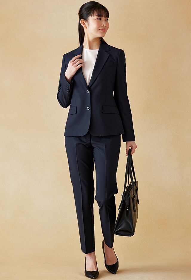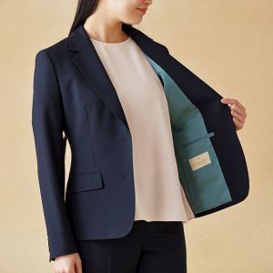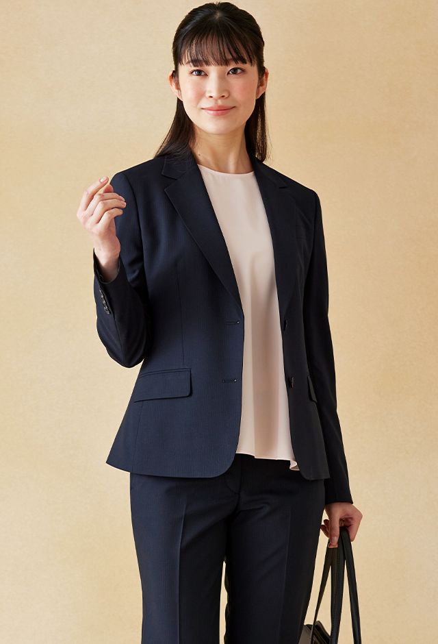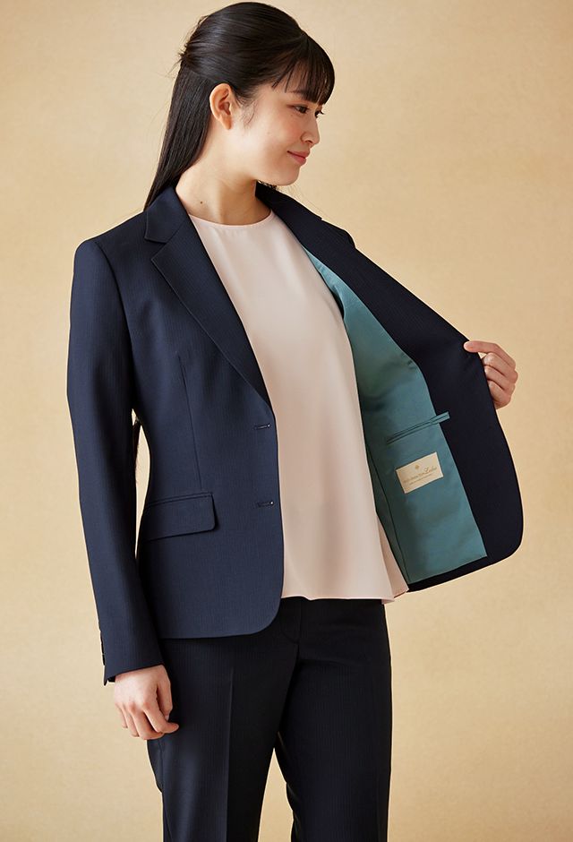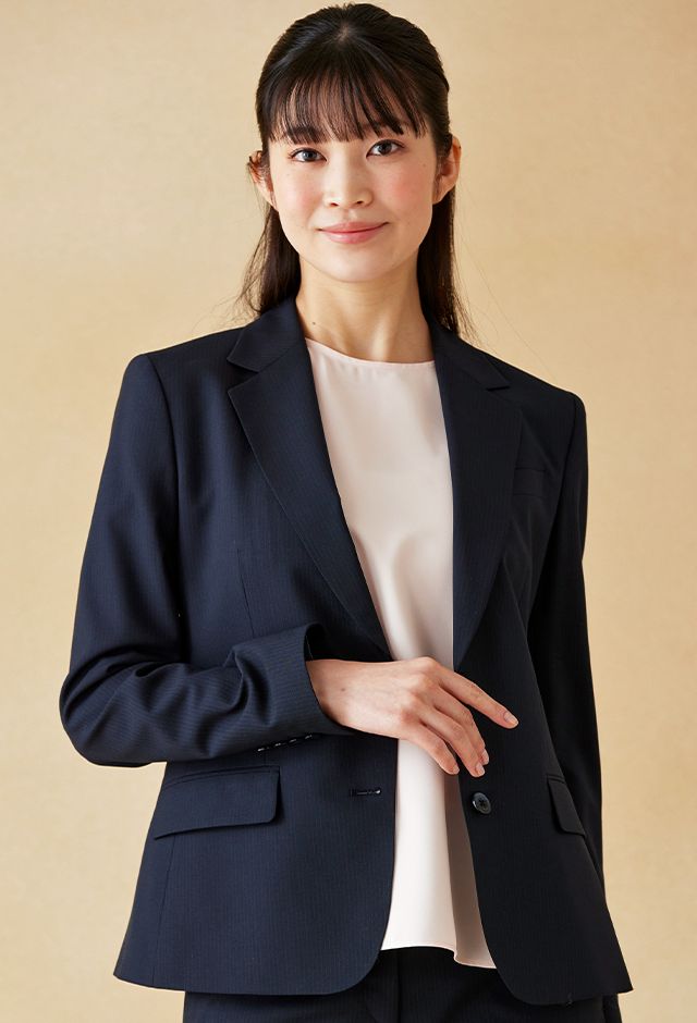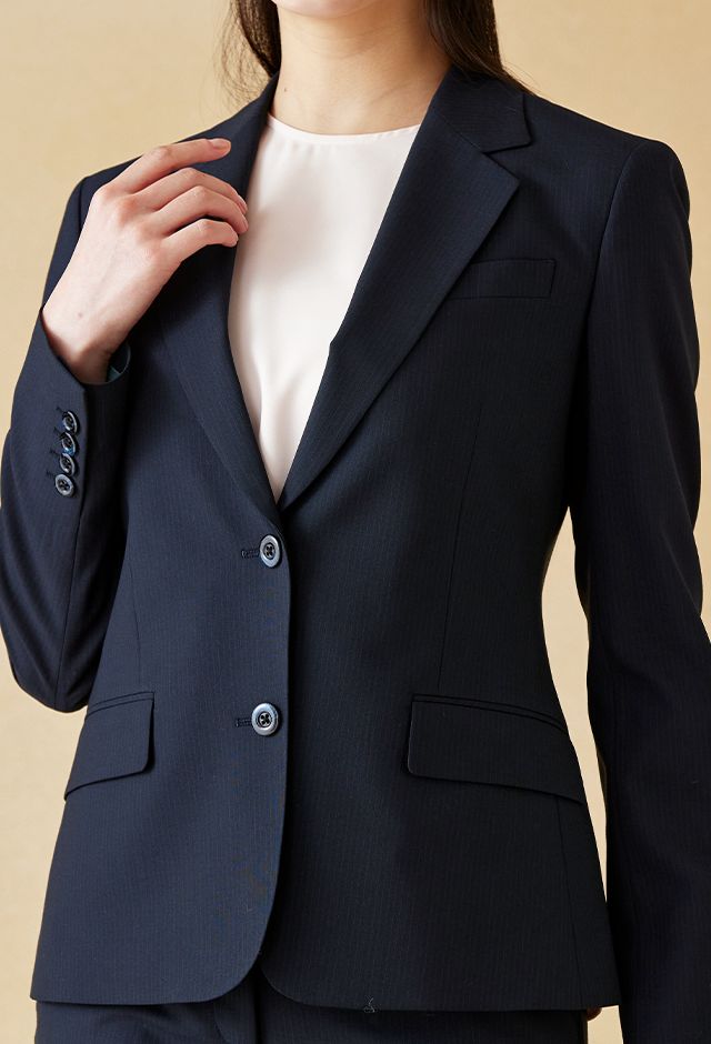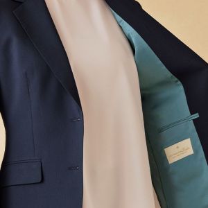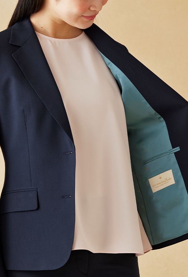耐久性とコストパフォーマンスに優れた「テクニカル・ウーステッド」で仕立てたスーツです。定番のネイビーカラーにシャドーストライプ柄の入ったクールなスタイルで、春夏シーズンの生地になります。ジャケットはテーラーギビングモデル(2つボタン)、ボトムスは人気のテーパードパンツで仕立てました。スーツよりトーンを落としたムラ感のあるボタンに、ライトブルーの裏地をチョイス。薄っすらとピンクのインナーで軽やかさを演出。全体的にシンプルなコーディネートでビジネスに最適な1着に。