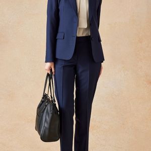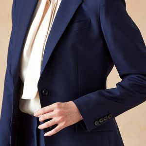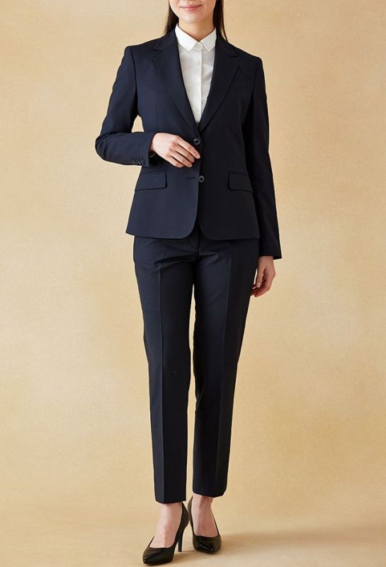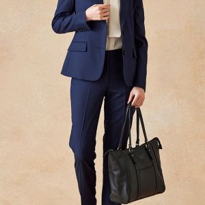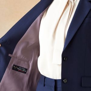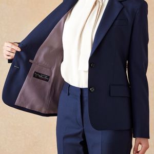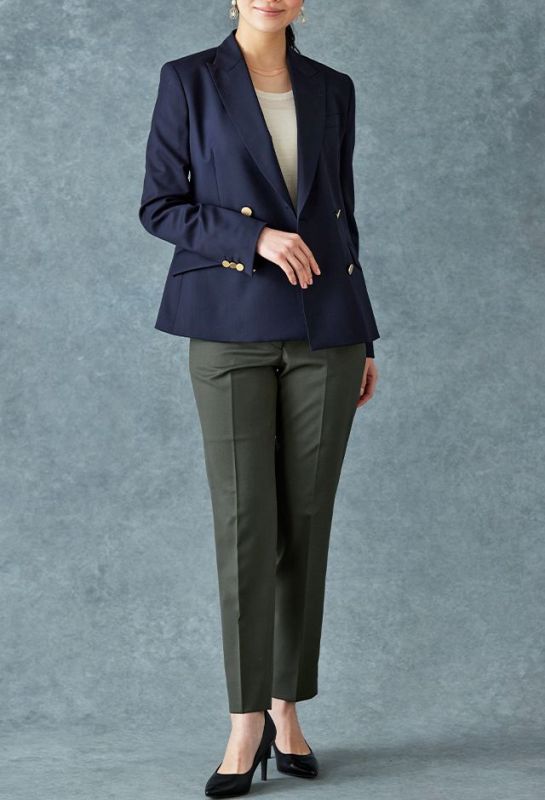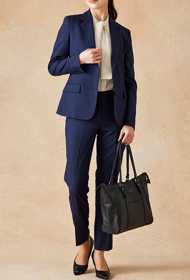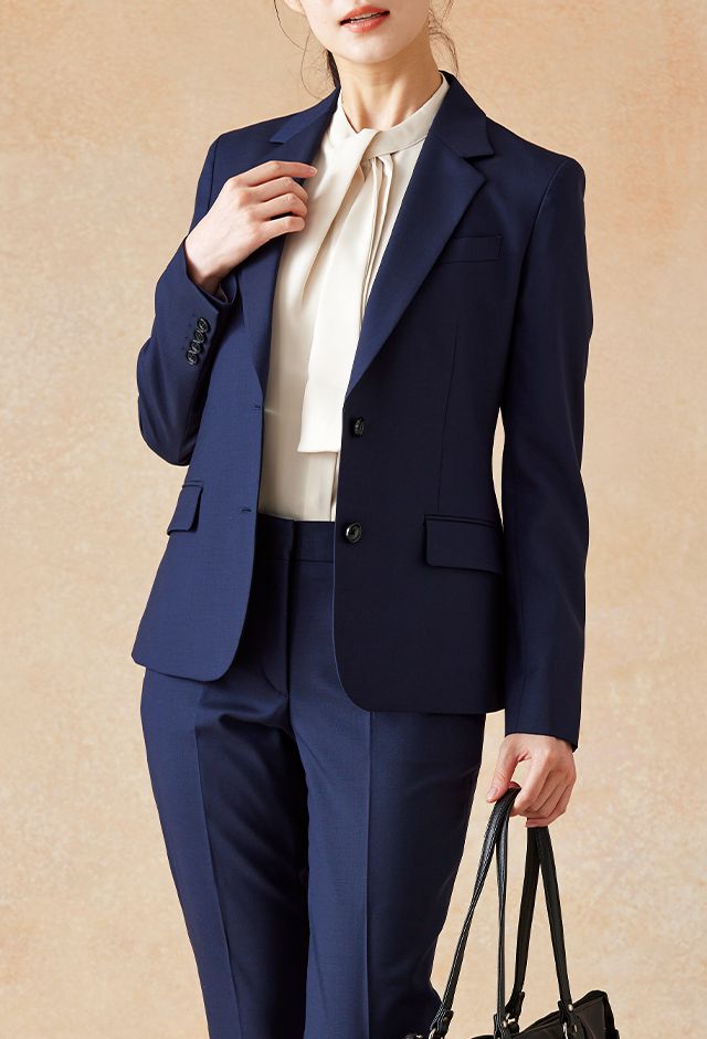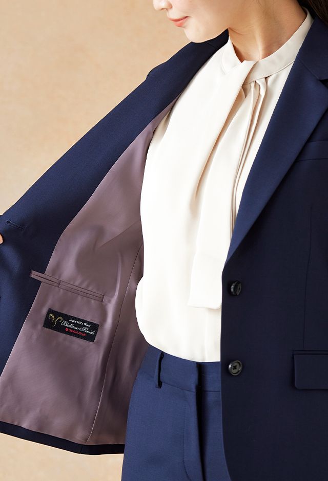 イタリアのノウハウを採用し、コストパフォーマンスに優れた「ビエラーノフィニッシュ」で仕立てたスーツです。定番のネイビーカラーに上品で汎用性のある無地スタイルで、オールシーズン着用していただけます。ジャケットはテーラーギビングデザイン(2つボタン)、ボトムスは人気のテーパードパンツで仕立てました。裏地にはラベンダーカラーを採用し、ネイビースーツに華やかさをプラス。ブラウスのリボンがフェミニンさを加え、堅くなりすぎない雰囲気に。さまざまなシーンで着用しやすい一着です。※生地在庫、生地入荷時期などは変動いたしますのでご了承くださいませ。