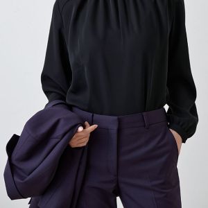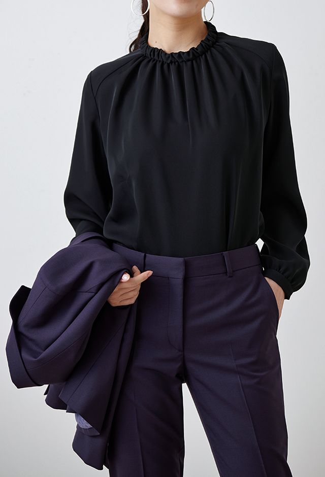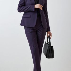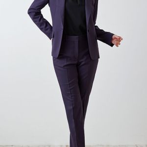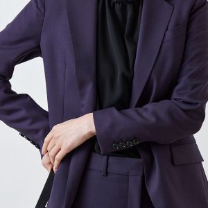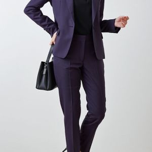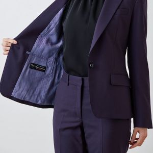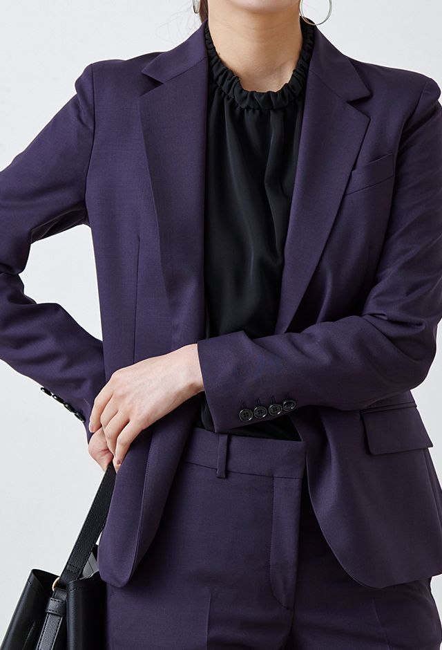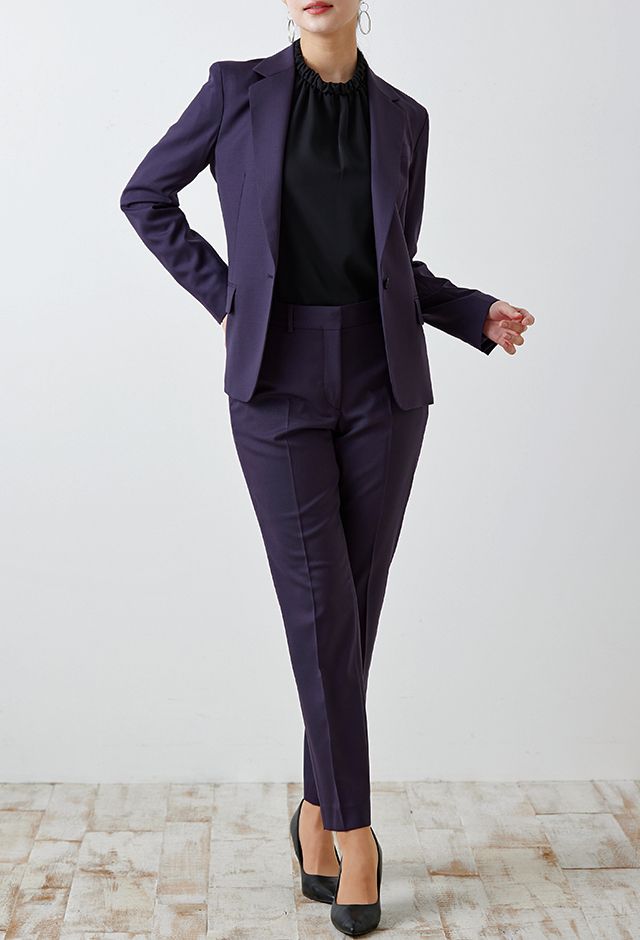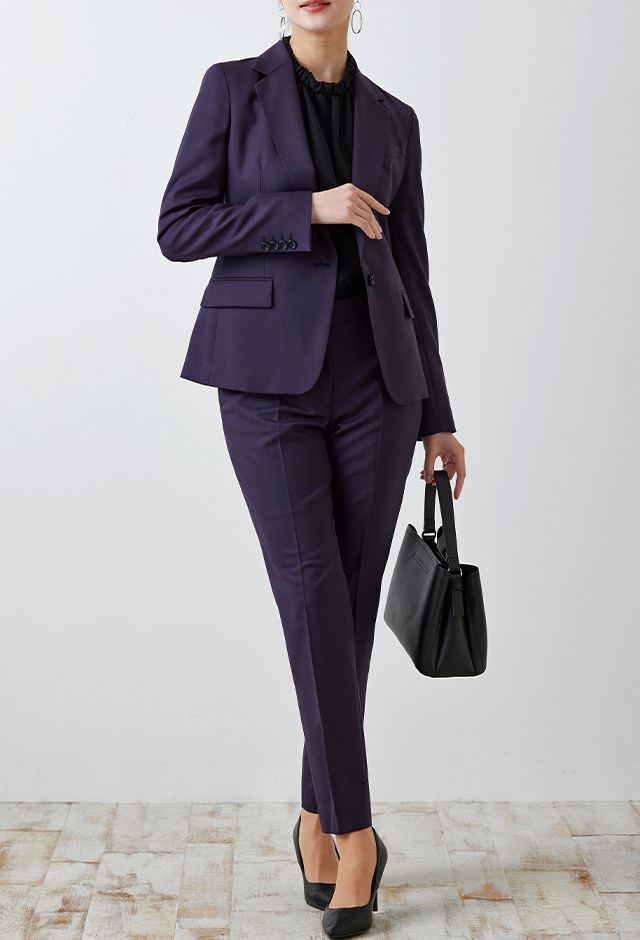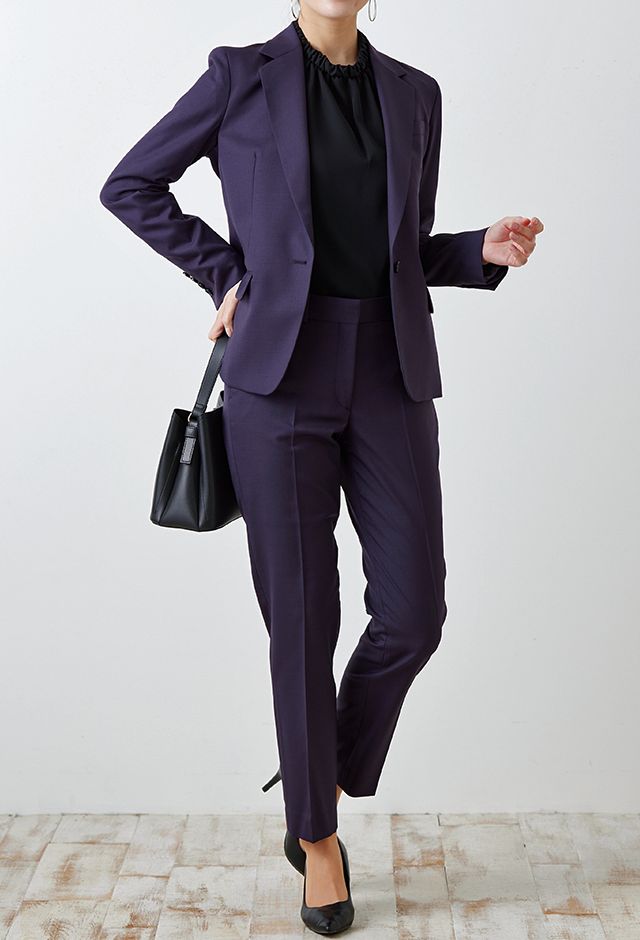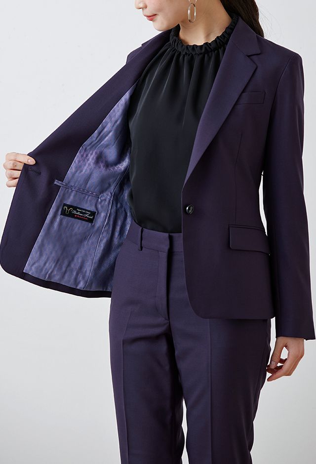 イタリアのノウハウを採用し、コストパフォーマンスに優れた「ビエラーノフィニッシュ」で仕立てたスーツです。落ち着きのある色合いのパープルスタイルで、オールシーズン着用していただけます。ジャケットはテーラーギビングデザイン(1つボタン)、ボトムスは人気のテーパードパンツで仕立てました。スーツの生地に合わせた鮮やかなライトブルーのダイヤ柄裏地を採用し統一感を演出。首元が華やかな黒のブラウスを組み合わせることで、かっこよさの中にさり気ない可愛さをプラスした甘辛コーデとなります。※生地在庫、生地入荷時期などは変動いたしますのでご了承くださいませ。