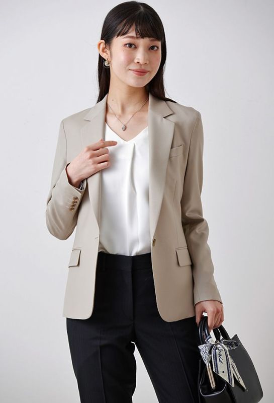 100年の歴史を誇る手作業に近い方法で丹念に織り上げられた、グローバルスタイルオリジナルの「織技」で仕立てたスーツです。モダンな印象を与えるグリーンのスタイルで、オールシーズン着用していただけます。ジャケットはテーラーギビングモデル(2つボタン)、ボトムスは人気のテーパードパンツで仕立てました。ブルーの花柄裏地にすることで、隠れたお洒落を楽しめる仕様に。ベージュのボウタイブラウスを合わせることで、カーキの持つシャープさやクールさが中和された女性らしい雰囲気に仕上げました。※生地在庫、生地入荷時期などは変動いたしますのでご了承くださいませ。
