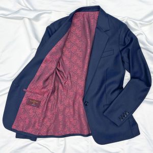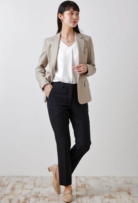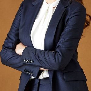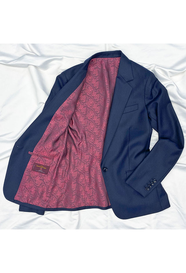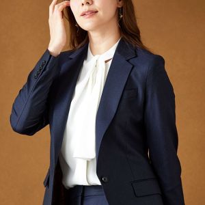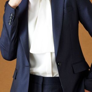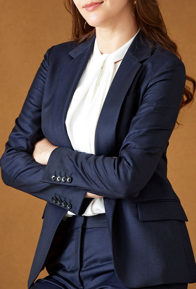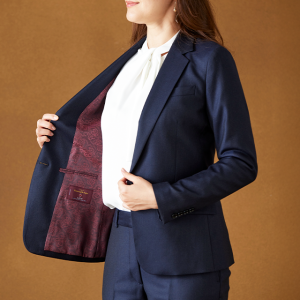 イタリアの高級生地ブランド「クロス エルメネジルド ゼニア」で仕立てたスーツです。知的かつ信頼感を与えるブルーグレーのスタイルで、オールシーズン着用していただけます。ジャケットはテーラーギビングモデル(1つボタン)、ボトムスは人気のテーパードパンツで仕立てました。レッドのペイズリー柄の裏地を採用。脱いだ時にも高級感と個性が感じられるデザインに。白のボウタイブラウスを合わせることで、女性らしい柔らかさと清潔感をプラスしたコーデです。※生地在庫、生地入荷時期などは変動いたしますのでご了承くださいませ。