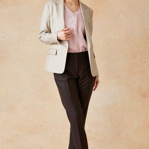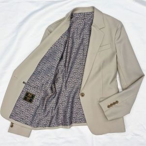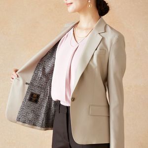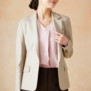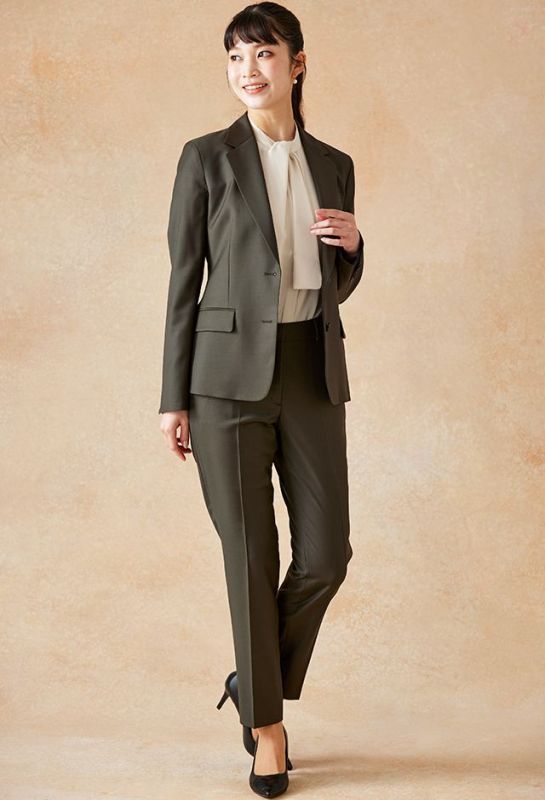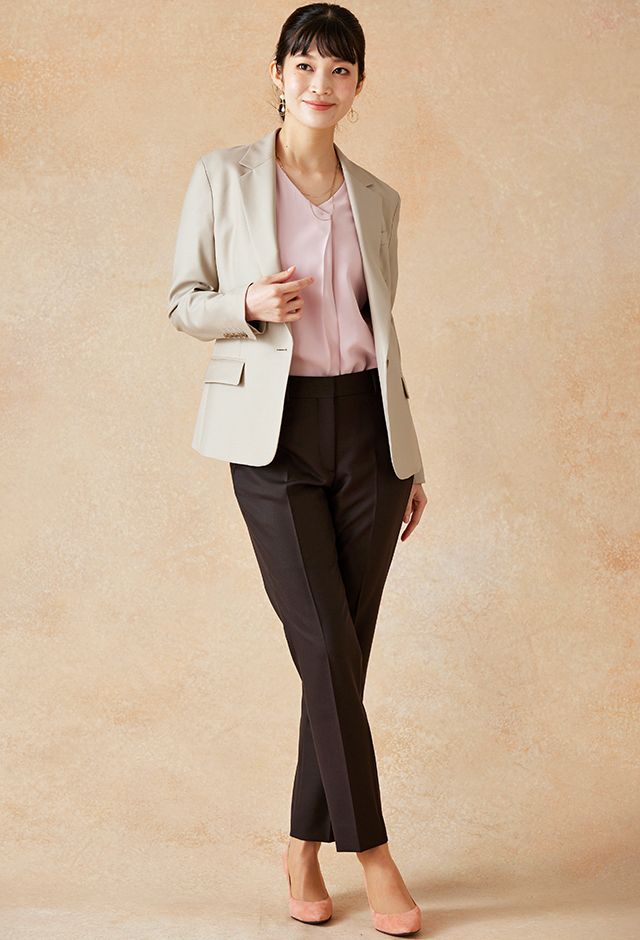 100年の歴史を誇る手作業に近い方法で丹念に織り上げられた、グローバルスタイルオリジナルの「織技」で仕立てたスーツです。洗練された雰囲気を漂わせるベージュスタイルで、オールシーズン着用していただけます。ジャケットはテーラーギビングモデル(1つボタン)、ボトムスは人気のテーパードパンツで仕立てました。表地のベージュと馴染む同系色のボタンを採用。ブラウンのパンツを合わせることで、明るいジャケットやピンクのブラウスを引き締め、全体をバランスよくまとめます。ビジネスシーンでも堅すぎず、親しみやすさと華やかさをバランス良く表現できるコーデです。※生地在庫、生地入荷時期などは変動いたしますのでご了承くださいませ。