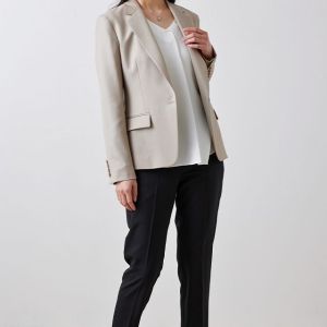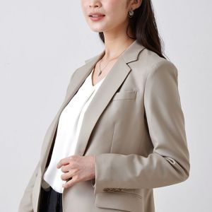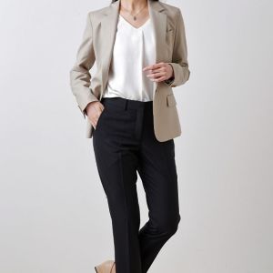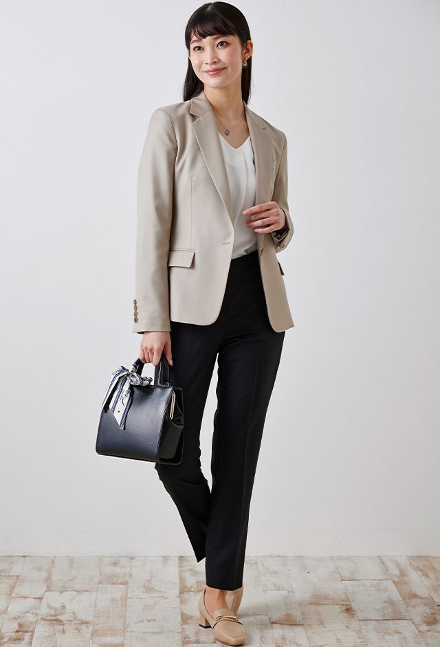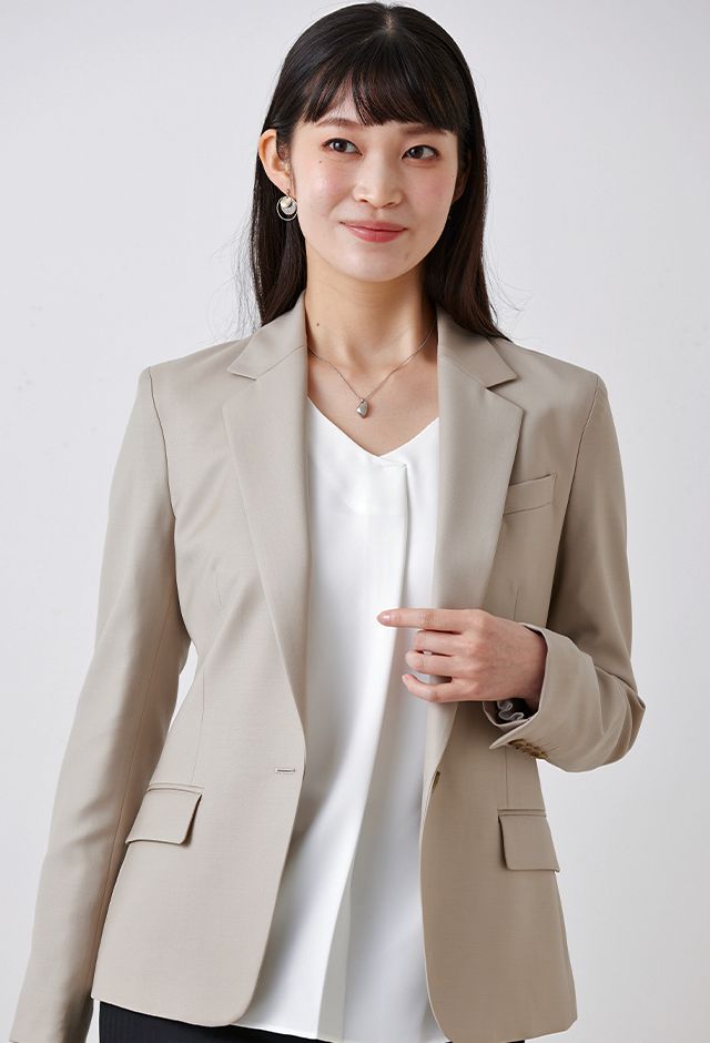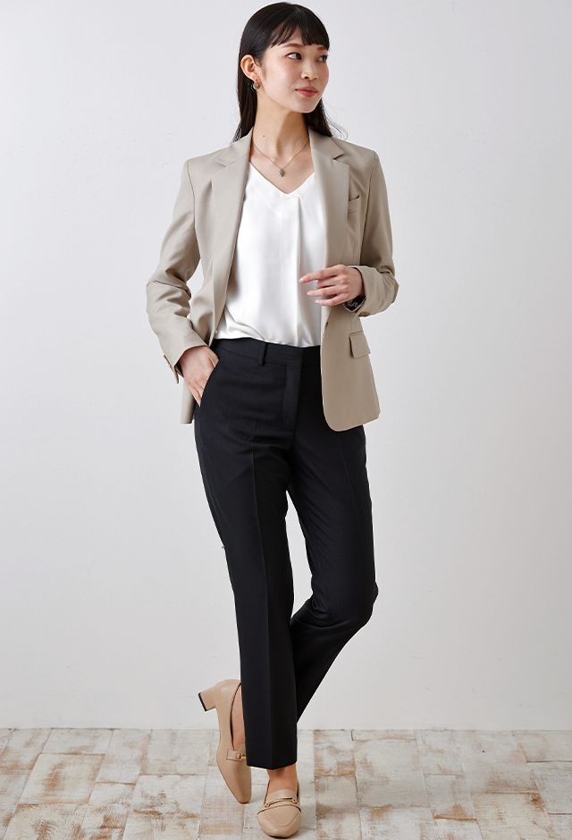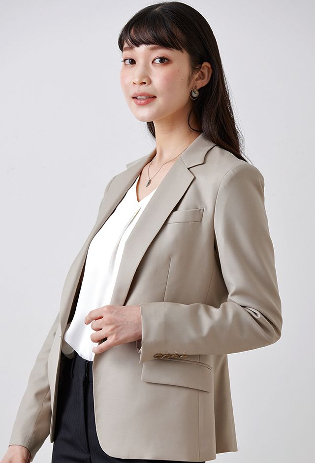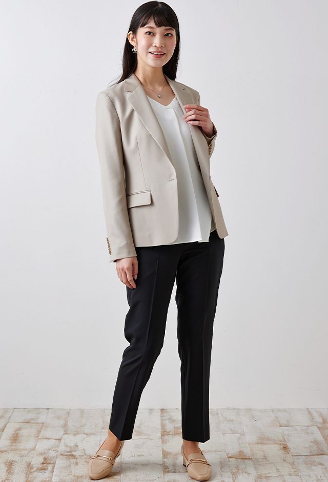 100年の歴史を誇る手作業に近い方法で丹念に織り上げられた、グローバルスタイルオリジナルの「織技」で仕立てたスーツです。知的で女性らしい印象を添えるベージュスタイルで、オールシーズン着用していただけます。ジャケットはテーラーギビングモデル(1つボタン)、ボトムスは人気のテーパードパンツで仕立てました。ジャケットは標準仕様の胸ポケットありをチョイス。ブラックのパンツを合わせることで、ベージュジャケットの柔らかさにメリハリを与えます。ベーシックカラーでまとめた、ビジネスシーンやオフィスカジュアルにぴったりのきちんと感のある着こなしに。※生地在庫、生地入荷時期などは変動いたしますのでご了承くださいませ。