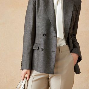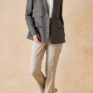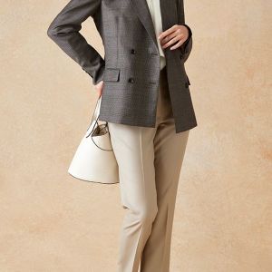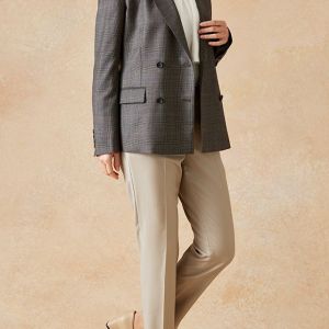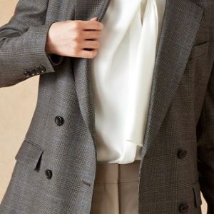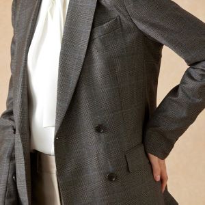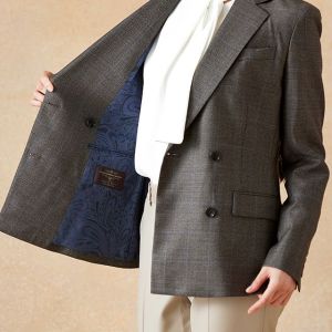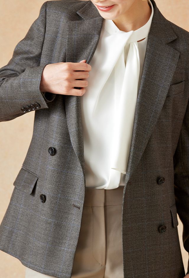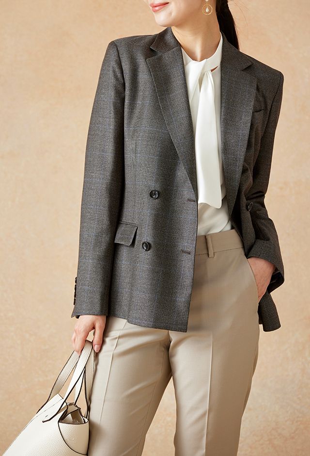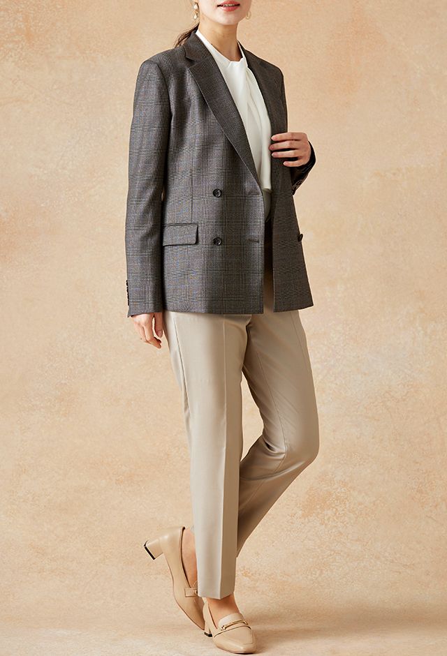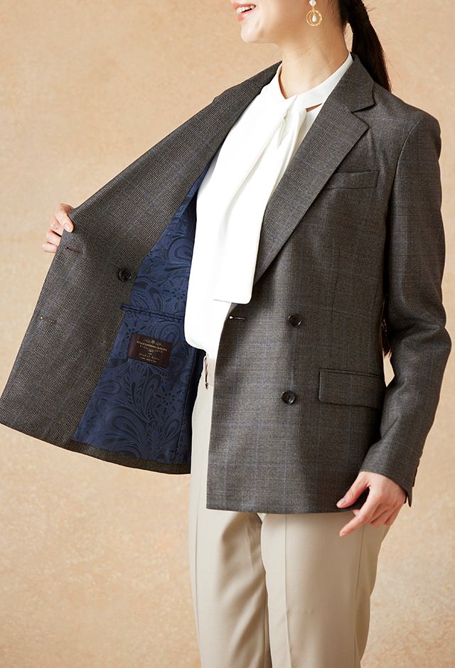 高品質でコストパフォーマンスに優れたイタリアブランド「カノニコ」で仕立てたスーツです。落ち着いたブラウンにさりげなくブルーのチェックを効かせた上品なスタイルで、オールシーズン着用していただけます。女性らしい優美なラインを演出しながら、スマートな雰囲気を出せるダブルジャケットで仕立てました。表地のブラウンと馴染む同系色のボタンを採用。ベージュのパンツを合わせることで、全体に柔らかさを加え、女性らしい軽やかさをプラス。ニュートラルな色合いでまとめた、ビジネスにも休日にも合う万能な着こなしに。※生地在庫、生地入荷時期などは変動いたしますのでご了承くださいませ。