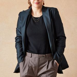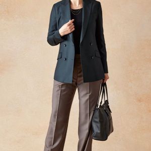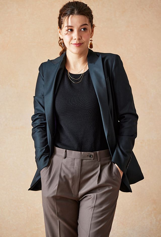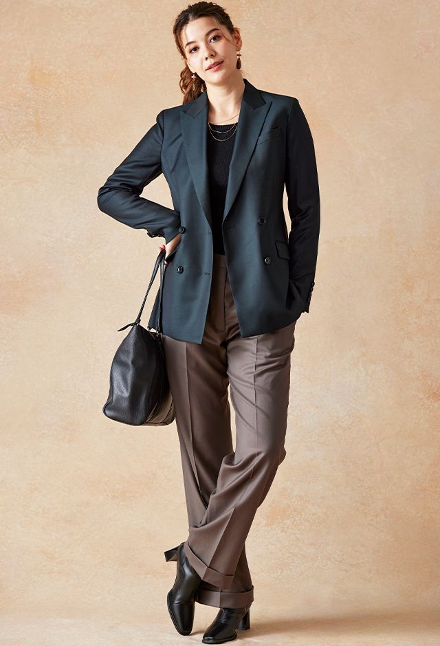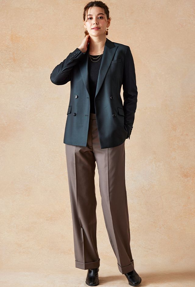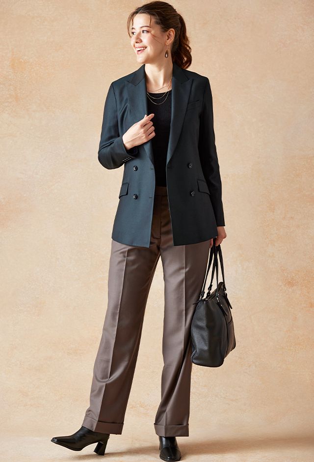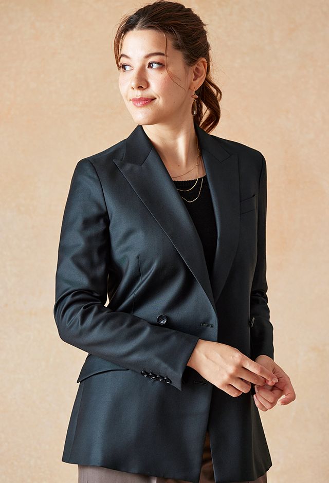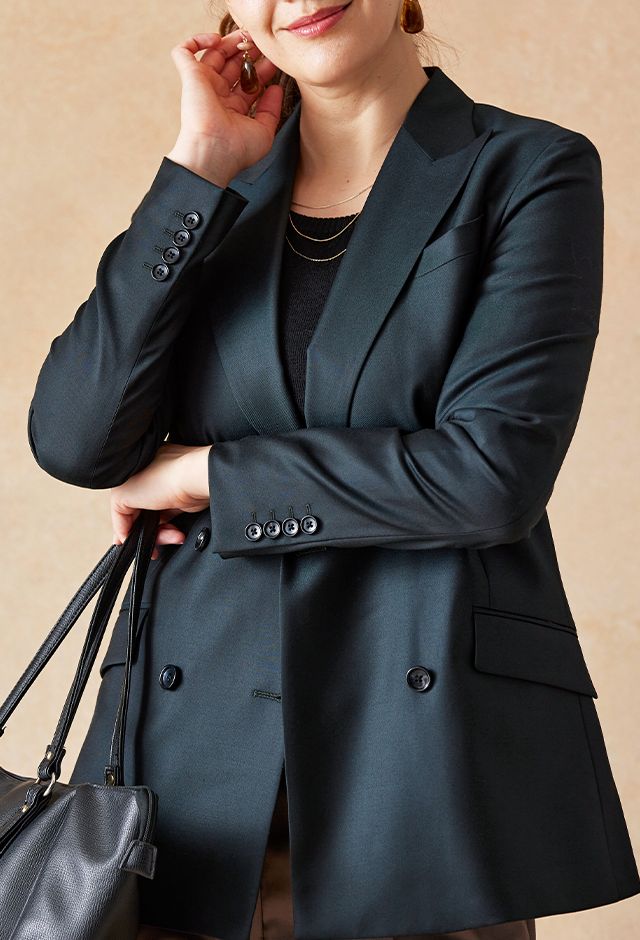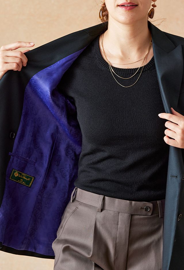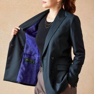 世界中のセレブリティから支持を得ているラグジュアリーブランド「ロロ・ピアーナ」で仕立てたスーツです。着用するだけで都会的なお洒落を演出しやすい、ダークグリーンのスタイルで、オールシーズン着用していただけます。女性らしい優美なラインを演出しながら、スマートな雰囲気を出せるダブルジャケットで仕立てました。裏地にはパープルのペイズリー柄を採用し、鮮やかな配色でギャップを演出。パンツはブラウン系で、自然を思わせるアースカラーを組み合わせました。落ち着きと温かみを両立させ、垢抜けた印象に仕上がります。※パンツはメンズモデルからさらにワイドパンツ風にアレンジしたものになります。※生地在庫、生地入荷時期などは変動いたしますのでご了承くださいませ。