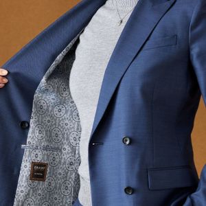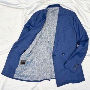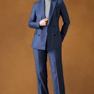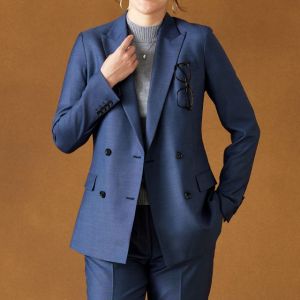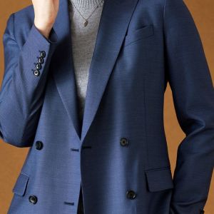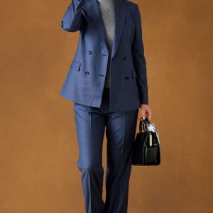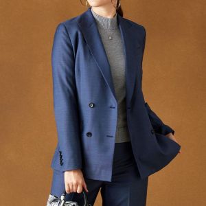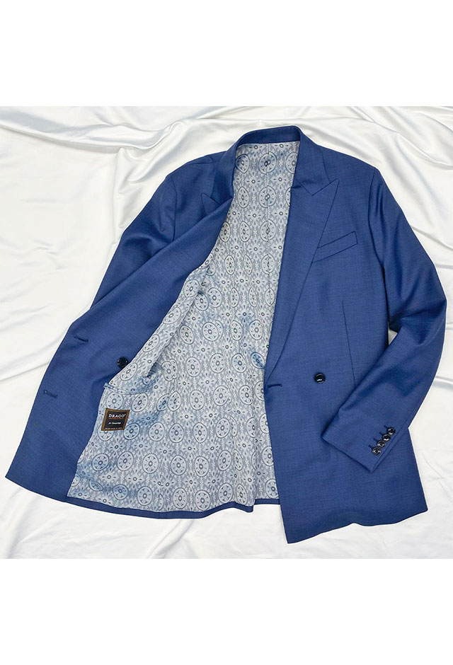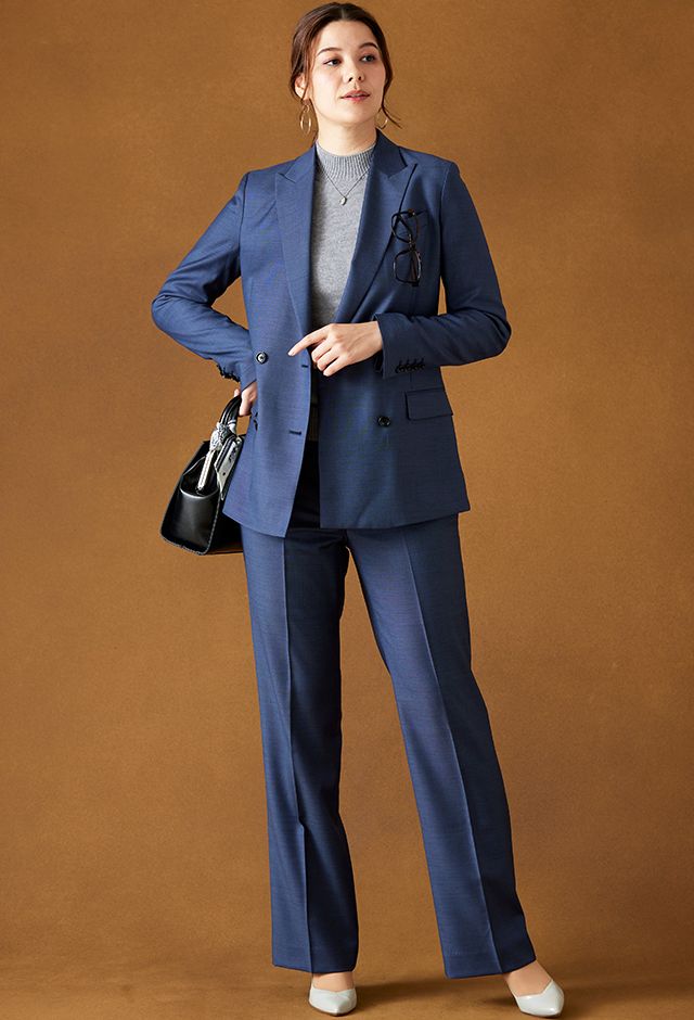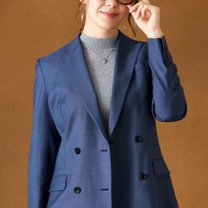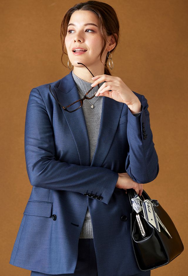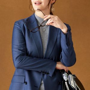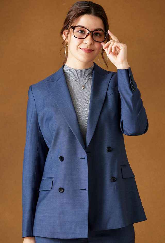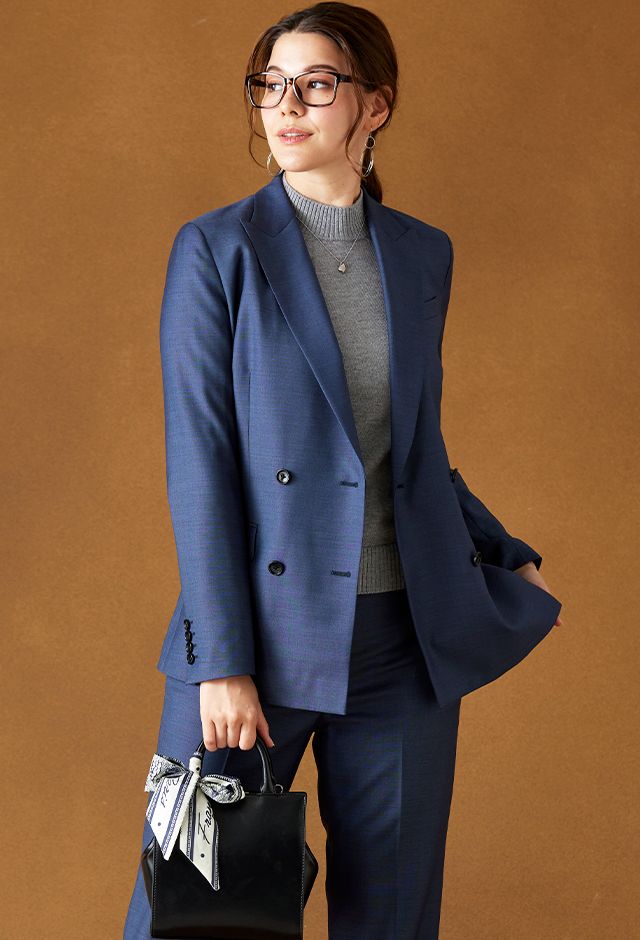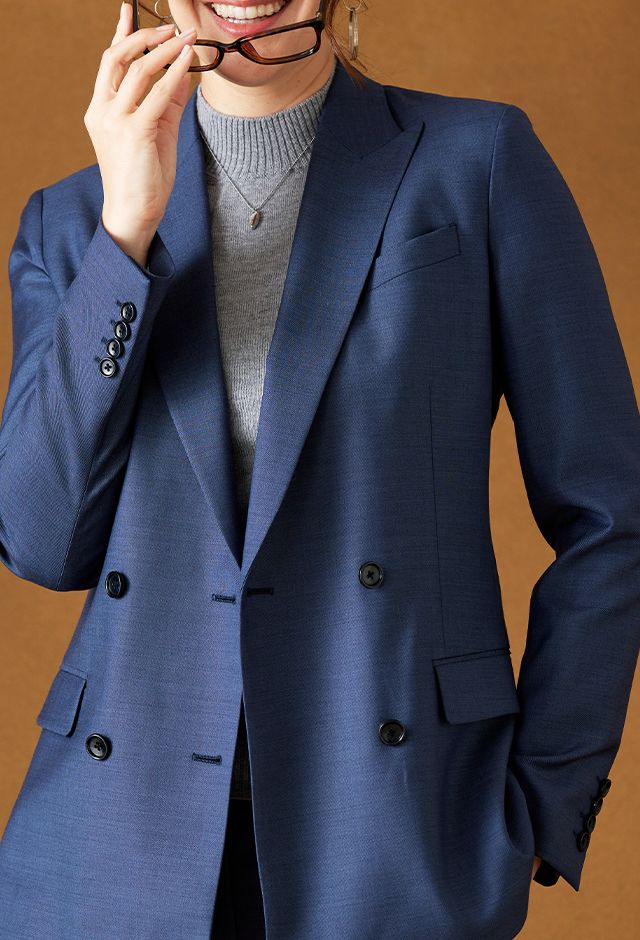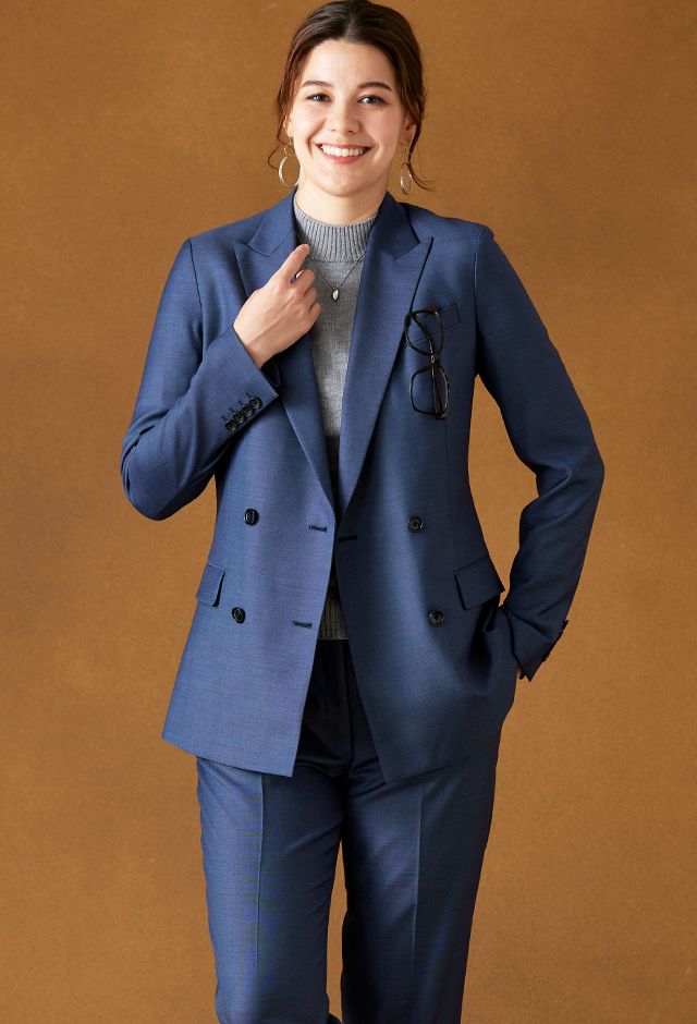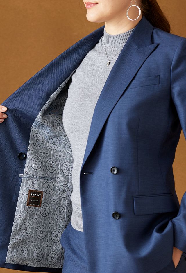雨が多く多湿な気候を有する市場においても絶大な評価を獲得している「ドラゴ」で仕立てたスーツです。黒やネイビーのスーツよりも柔らかい印象になるブルーグレーのスタイルで、オールシーズン着用していただけます。女性らしい優美なラインを演出しながら、スマートな雰囲気を出せるダブルジャケットで仕立てました。ブラックのボタンをアクセントに、全体をキュッと引き締めた印象に。シルバーアクセサリーとグレーインナーで、ワンランク上の垢抜けスタイルに仕上げました。※生地在庫、生地入荷時期などは変動いたしますのでご了承くださいませ。