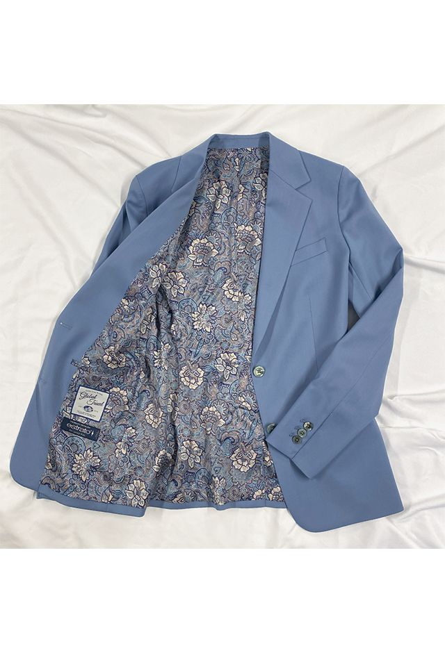 ストレッチ性の高い生地が大好評のイタリアブランド「トラバルド・トーニャ」で仕立てたスーツです。トレンド感のある、くすみカラーのブルーのスタイルで、春夏シーズンの生地になります。ジャケットはテーラーギビングデザイン(2つボタン)、ボトムスはクールなセミフレアパンツで仕立てました。ジャケットはシルエットの優雅さを際立たせるため、あえて着丈を長めに調整。ホワイトを取り入れた爽やかな着こなしで、上品さもありながら親しみやすい大人の綺麗めコーディネートです。