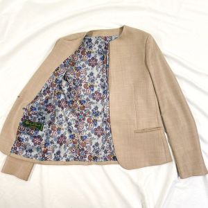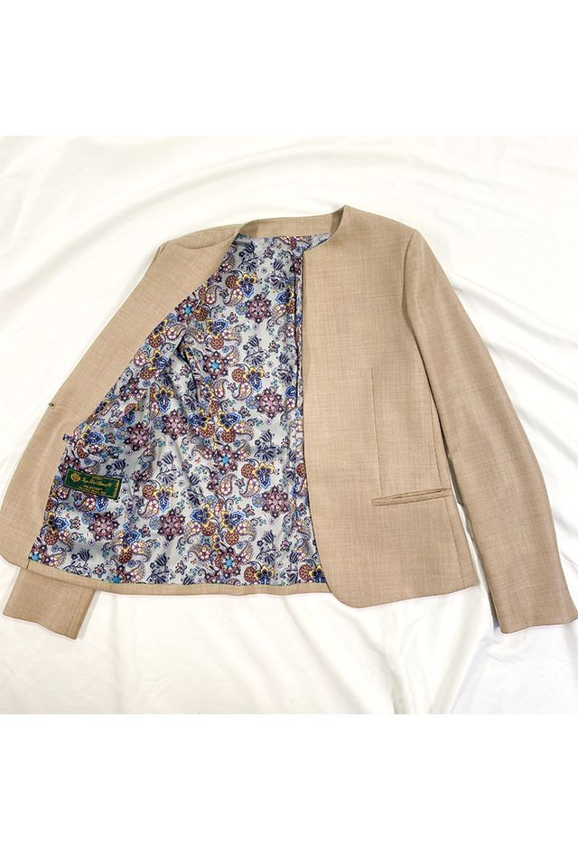 世界中のセレブリティから支持を得ているラグジュアリーブランド「ロロ・ピアーナ」で仕立てたスーツです。肌なじみの良いベージュのスタイルで、春夏シーズンの生地になります。ジャケットはノーカラーデザイン(クルーネック/ホック)ボトムスはクールなメンズデザインのストレートパンツで仕立てました。袖口はスリットが入り、手元に抜け感とシャープな印象に。ボウタイブラウスとワイドパンツの柔らかな組み合わせを、ジャケットでピシッと引き締めて、動きやすさと美しさを両立し、仕事帰りにプライベートを楽しむ日にも便利な一着です。