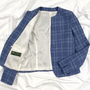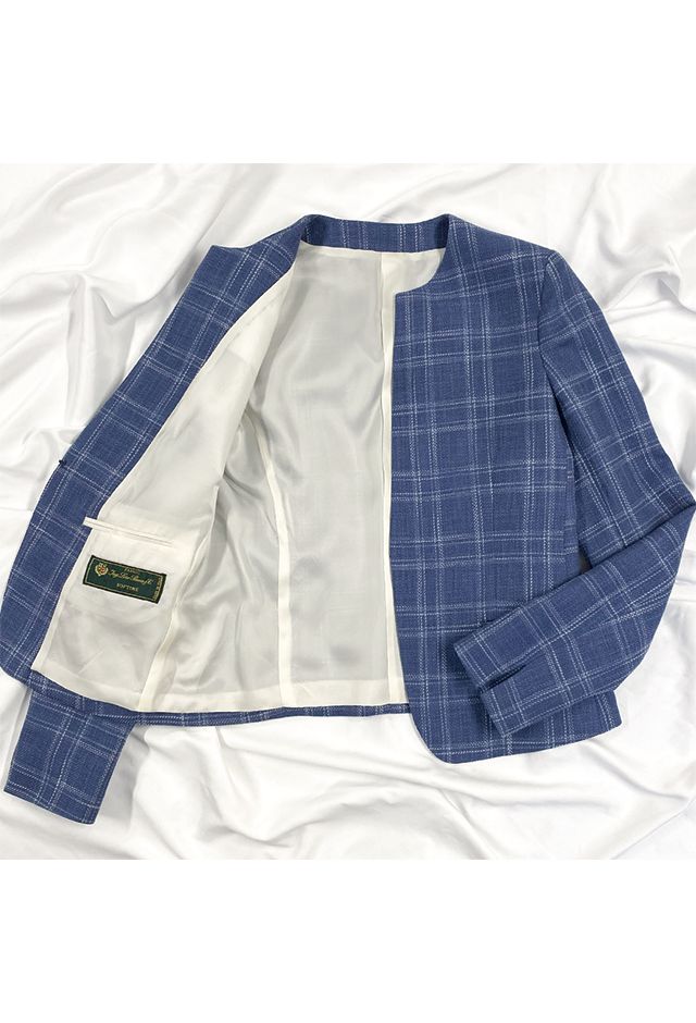 世界中のセレブリティから支持を得ているラグジュアリーブランド「ロロ・ピアーナ」で仕立てたスーツです。清潔感のあるブルーにホワイトのチェックを効かせた上品なスタイルで、春夏シーズンの生地になります。ジャケットはノーカラーデザイン(クルーネック/丸襟)ボトムスはクールなセミフレアパンツで仕立てました。裏地には、インナーのブラウスと同じ華やかなホワイトを採用して女性らしい雰囲気に。オフの日の食事会から入学式や卒業式などのセレモニーシーンにも活躍する大人かわいいコーデです。※生地在庫、生地入荷時期などは変動いたしますのでご了承くださいませ。