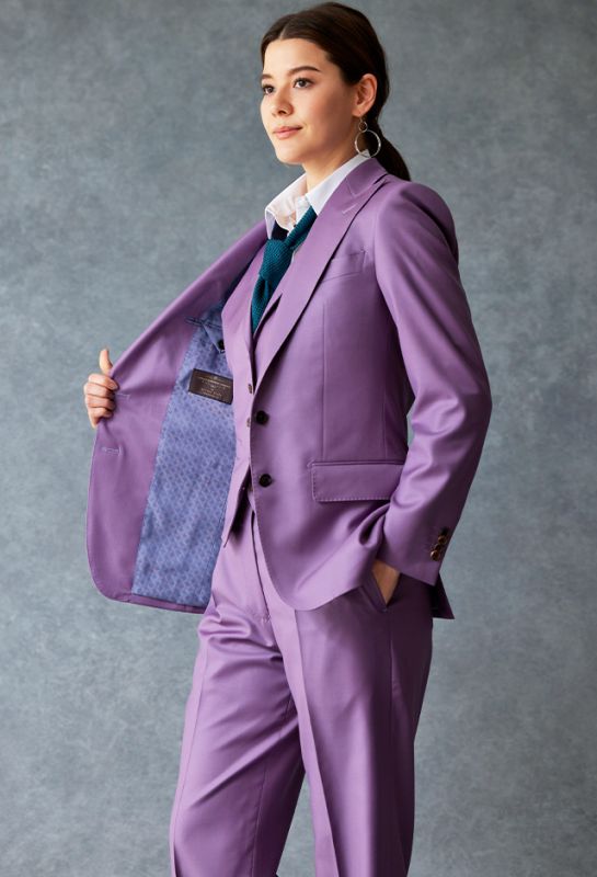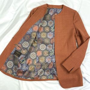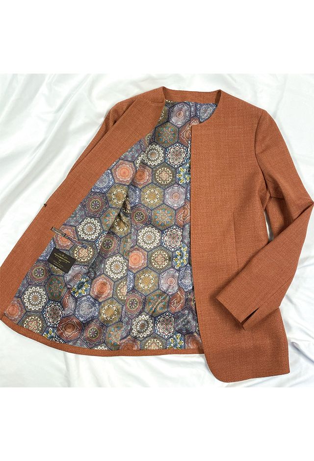 高品質でコストパフォーマンスに優れたイタリアブランド「カノニコ」で仕立てたスーツです。女性らしく軽やかなオレンジのスタイルで、春夏シーズンの生地になります。ジャケットはノーカラーデザイン(クルーネック/ホック)ボトムスはクールなメンズデザインのストレートパンツで仕立てました。ジャケットは通常よりも長め丈で縦のラインを美しく見せ、すっきりとした印象に。スリット袖が軽やかさをプラスします。明るいカラーのジャケットを主役に、ベージュやホワイトでまとめることで、プライベートやショッピングに行く時にも重宝するコーデです。