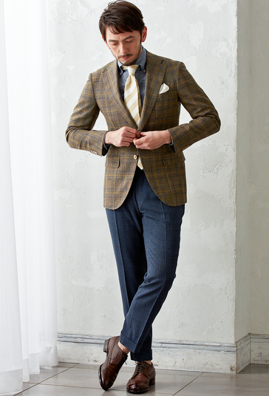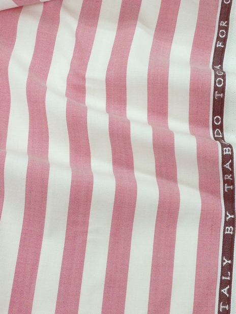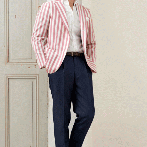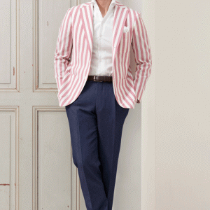 ストレッチ性の高い生地が大好評のイタリアブランド「トラバルド・トーニャ」で仕立てたスーツです。珍しいピンク×ホワイトの太ストライプ柄がお洒落なスタイルで、春夏シーズンの生地になります。ミケランジェロレジェロモデルで、一度羽織ると手放せなくなる軽い着心地を感じていただけます。カジュアルな印象のジャケットと相性が良いアウトポケットオプションで軽やかな印象に。ネイビーのパンツとセットにした、遊び心のあるこなれたジャケパンコーデです。※生地在庫は変動いたしますのでご了承くださいませ。