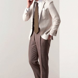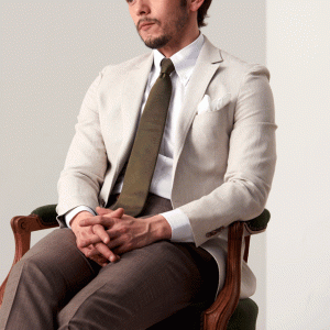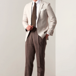 イタリアの高級生地ブランド「ゼニア」で仕立てたスーツです。トレンドの淡いベージュカラーに涼しげな素材が印象的な無地のスタイルで、春夏シーズンの生地になります。肩パットや芯地を極力排したアンコンモデルでジャケットを仕立てました。見る角度で輝きの変わる貝ボタン。重ねボタンにすることで手元に立体感を持たせてくれます。ブラウンのパンツや小物を組み合わせた、オンだけでなくオフでも映えるハイセンスなジャケパンコーデです。※生地在庫は変動いたしますのでご了承くださいませ。