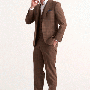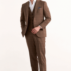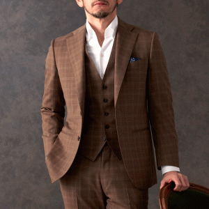 生地本来の持つ雰囲気にこだわるイタリアのブランド「グアベロ」で仕立てたスーツです。トレンドのブラウンカラーに同系色の上品なチェック柄が入ったスタイルで、オールシーズン着用していただけます。最高峰グレードの「サルトリアモデル」で極上の着心地を味わうことが出来ます。ベストもセットのスリーピースでフォーマル感や重厚感をプラス。ブルーのチーフをアクセントに白シャツで清潔感を持たせたコーデです。ノーネクタイでも映えます。※生地在庫は変動いたしますのでご了承くださいませ。