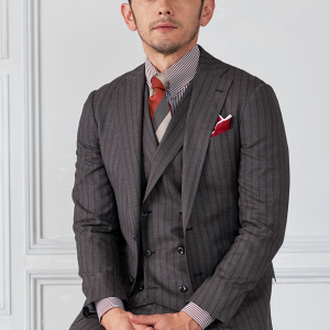 ファッション性が高くお洒落な生地が豊富な「アリストン」で仕立てたスーツです。シックなグレーにブラウンのストライプ柄が入ったスタイルで、オールシーズン着用していただけます。ミケランジェロレジェロモデルで、一度羽織ると手放せなくなる軽い着心地を感じていただけます。ダブルベストでスリーピースにすることでフォーマル感をアップ。ジャケットを脱いでもきちんとした印象に。スーツ柄と揃えたストライプのシャツでより存在感を持たせたコーデです。※生地在庫は変動いたしますのでご了承くださいませ。