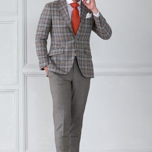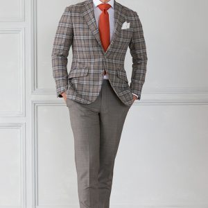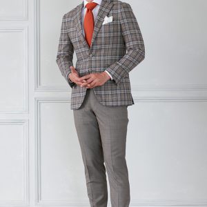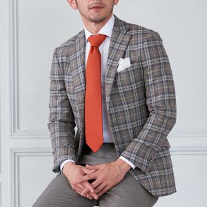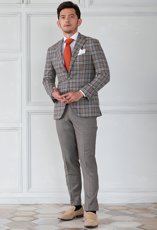世界中のセレブリティから支持を得ているラグジュアリーブランド「ロロ・ピアーナ」で仕立てたスーツです。トレンドのブラウンカラーにブルーやベージュのチェック柄が入ったスタイルで、秋冬シーズンの生地になります。ミケランジェロレジェロモデルで、一度羽織ると手放せなくなる軽い着心地を感じていただけます。ボタンはスーツの生地柄と揃えたお洒落なタイプで遊び心をプラス。オレンジのネクタイをアクセントに同系色でまとめた統一感のあるジャケパンコーデです。※生地在庫は変動いたしますのでご了承くださいませ。