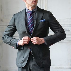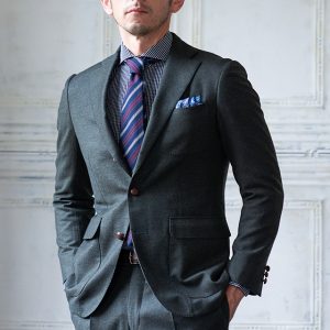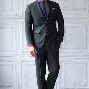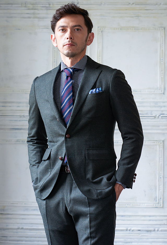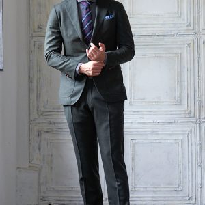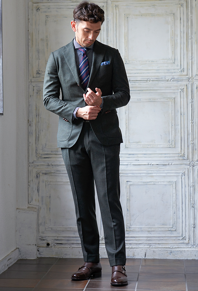 ベストもセットのスリーピースでフォーマル感や重厚感をプラス。流行のカーキ(グリーン)に起毛感のある生地が印象的なスタイルで、秋冬シーズンの生地になります。ミケランジェロレジェロモデルで、一度羽織ると手放せなくなる軽い着心地を感じていただけます。カジュアルな雰囲気のジャケットと相性が良いアウトポケットオプションで軽やかな印象に。柄モノのシャツやネクタイをプラスした、カーキカラーの映えるコーデです。