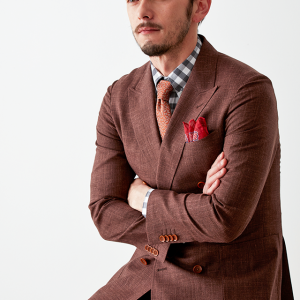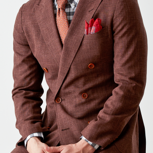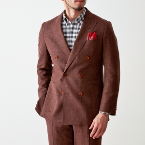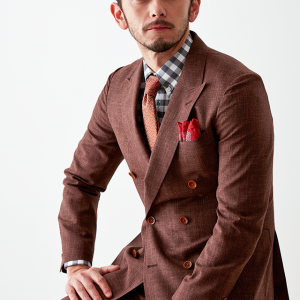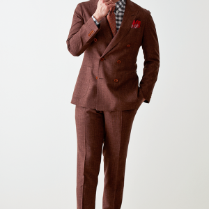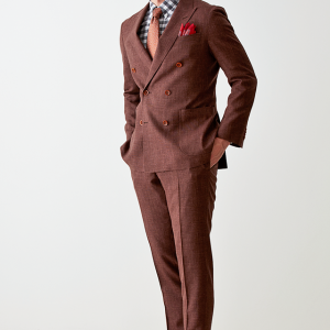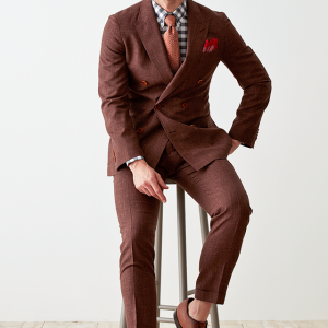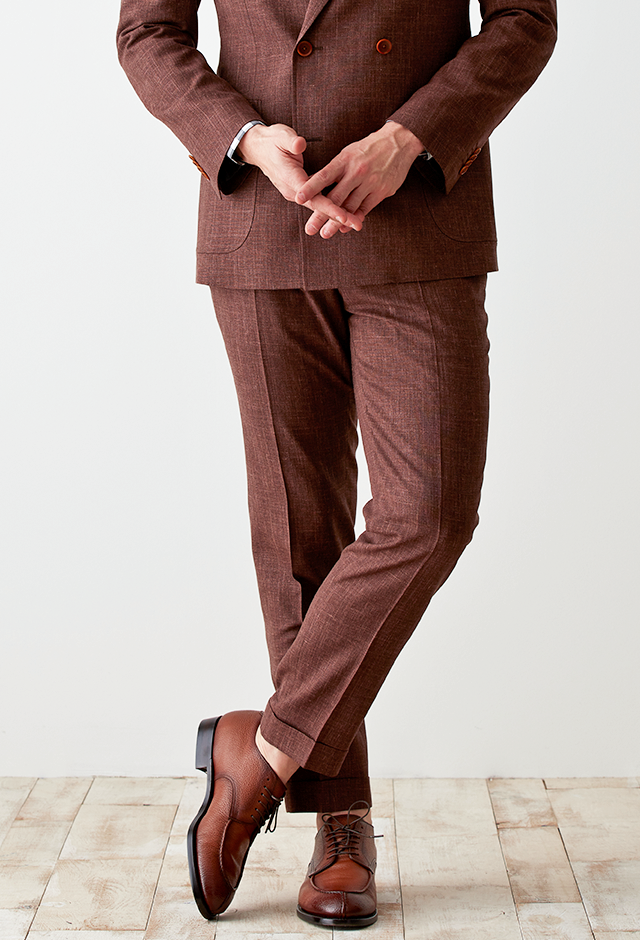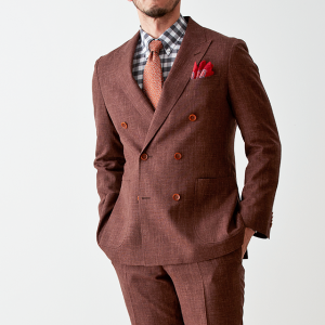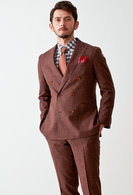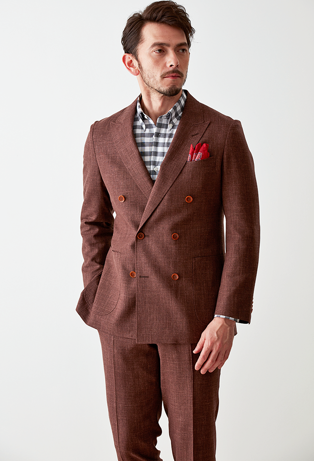 世界中のセレブリティから支持を得ているラグジュアリーブランド「ロロ・ピアーナ」で仕立てたスーツです。サラッとした素材と赤み強めなブラウンを組み合わせたスタイルで、春夏シーズンの生地になります。肩パットや芯地を極力排したアンコンモデルで仕立てました。カジュアルな雰囲気のジャケットと相性が良いアウトポケットオプションで軽やかな印象に。存在感のあるチェックシャツと組み合わることでモードで個性あるコーデに仕上げました。※生地在庫は変動いたしますのでご了承くださいませ。
