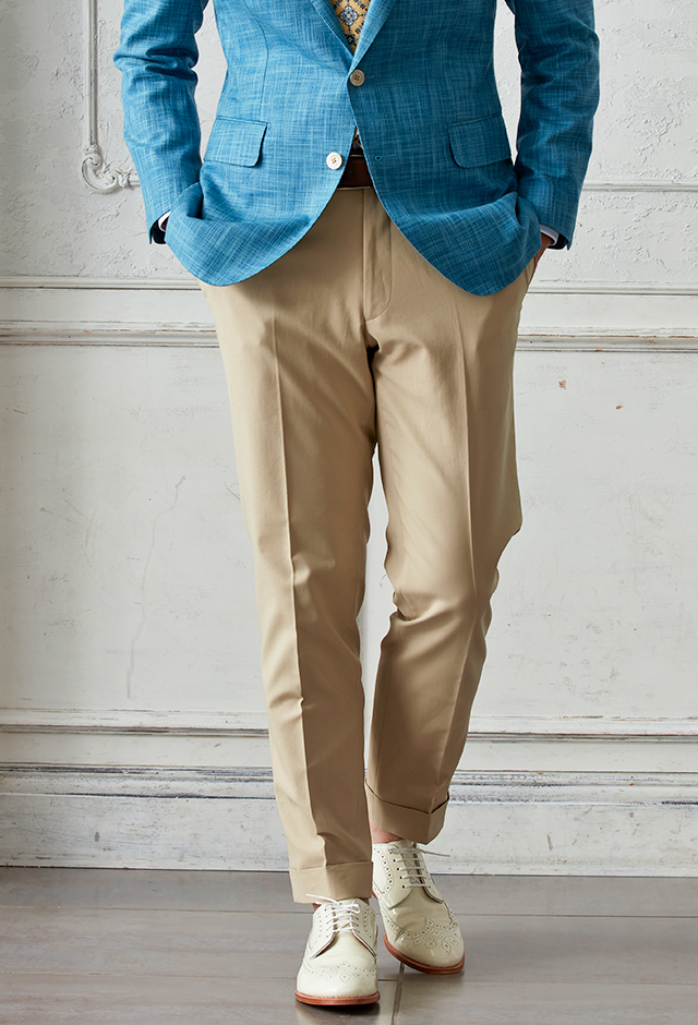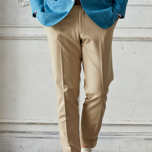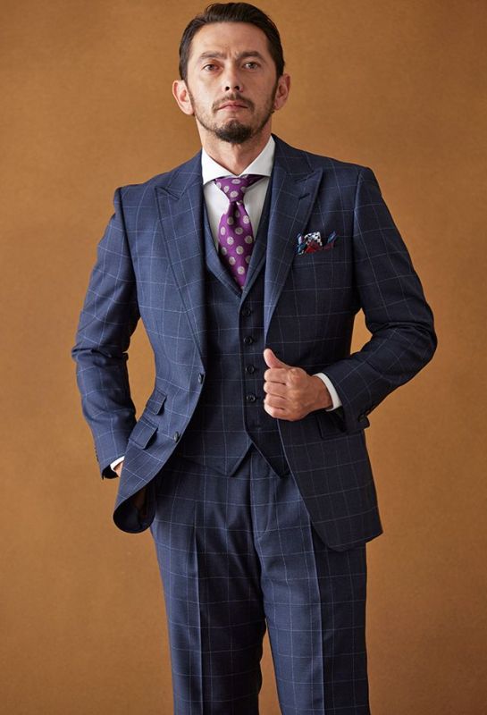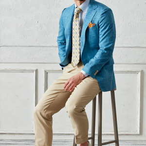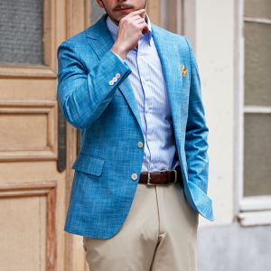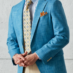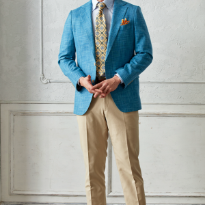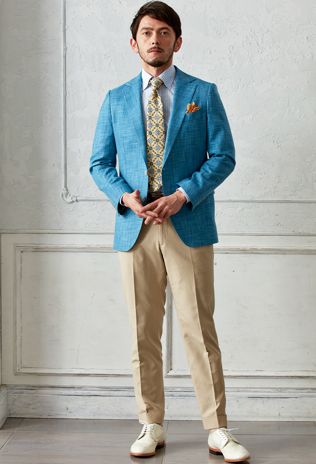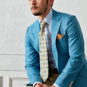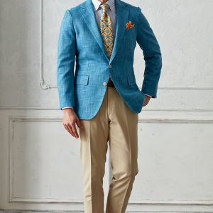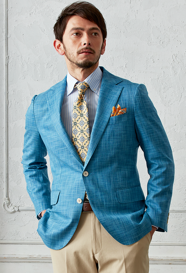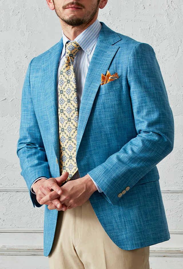 世界中のセレブリティから支持を得ているラグジュアリーブランド「ロロ・ピアーナ」で仕立てたスーツです。無地ながら独特な織り模様が入ったブルー系ネイビーカラーのスタイルで、春夏シーズンの生地になります。肩パットや芯地を極力排したアンコンモデルでジャケットを仕立てました。ボタンはパンツとあわせたベージュカラー、数は3個にすることでより軽やかに。イエローを差し色に、室内でも屋外でも華やかに見えるジャケパンコーデに仕上げました。※生地在庫は変動いたしますのでご了承くださいませ。