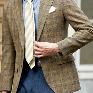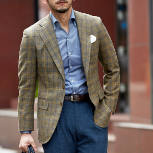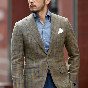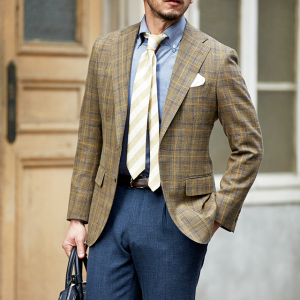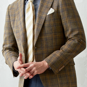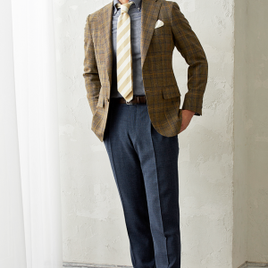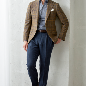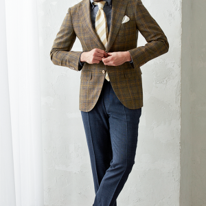 世界中のセレブリティから支持を得ているラグジュアリーブランド「ロロ・ピアーナ」で仕立てたスーツです。ブラウン系カラーにイエローやブルーのチェックが入ったお洒落なスタイルで、春夏シーズンの生地になります。ミケランジェロレジェロモデルで、一度羽織ると手放せなくなる軽い着心地を感じていただけます。ボタンはジャケットとあわせたブラウンカラー、数は3個にすることでより軽やかに。チェック柄にも入っているイエローやネイビーを使いバランス良くまとめたコーデです。※生地在庫は変動いたしますのでご了承くださいませ。