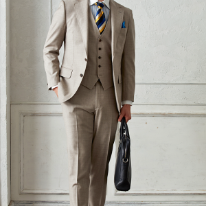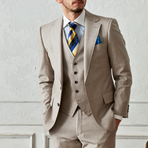 世界中のセレブリティから支持を得ているラグジュアリーブランド「ロロ・ピアーナ」で仕立てたスーツです。トレンドのベージュカラーが絶妙な風合いを醸し出すスタイルで、オールシーズン着用していただけます。クラシックな部分とセクシーさを融合したモダンクラシックモデルで仕立てました。ベストもセットのスリーピースでフォーマル感や重厚感をプラス。裏地には落ち着きのあるブラウンを。ブルー、イエロー、ベージュカラーをバランス良く配置したお洒落なコーデです。※生地在庫は変動いたしますのでご了承くださいませ。