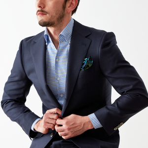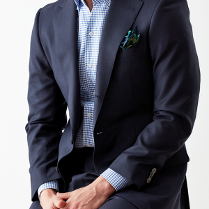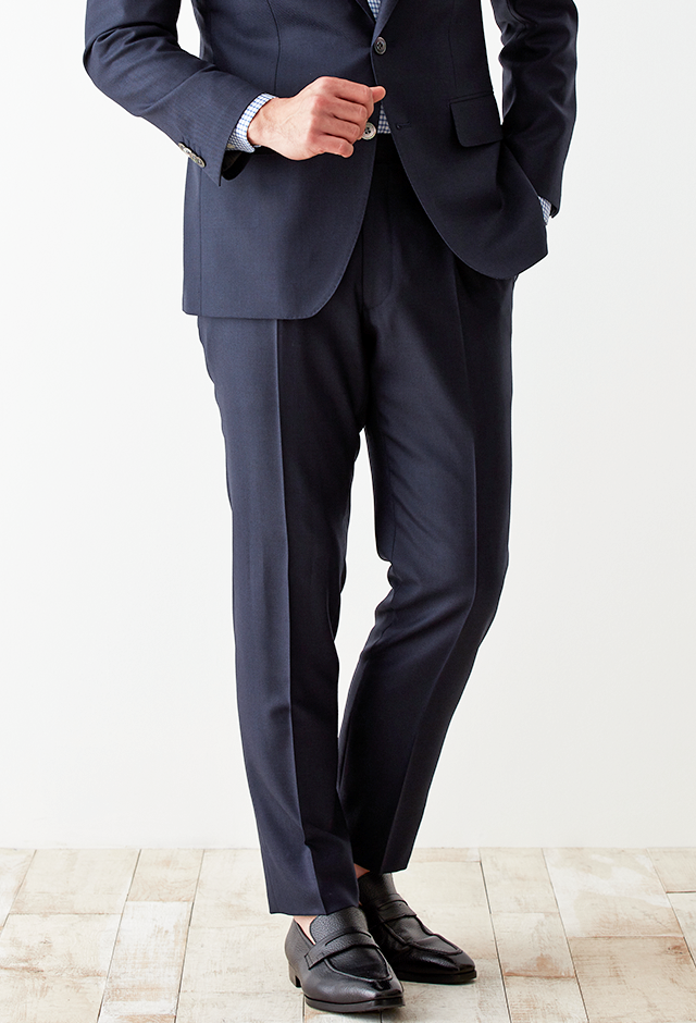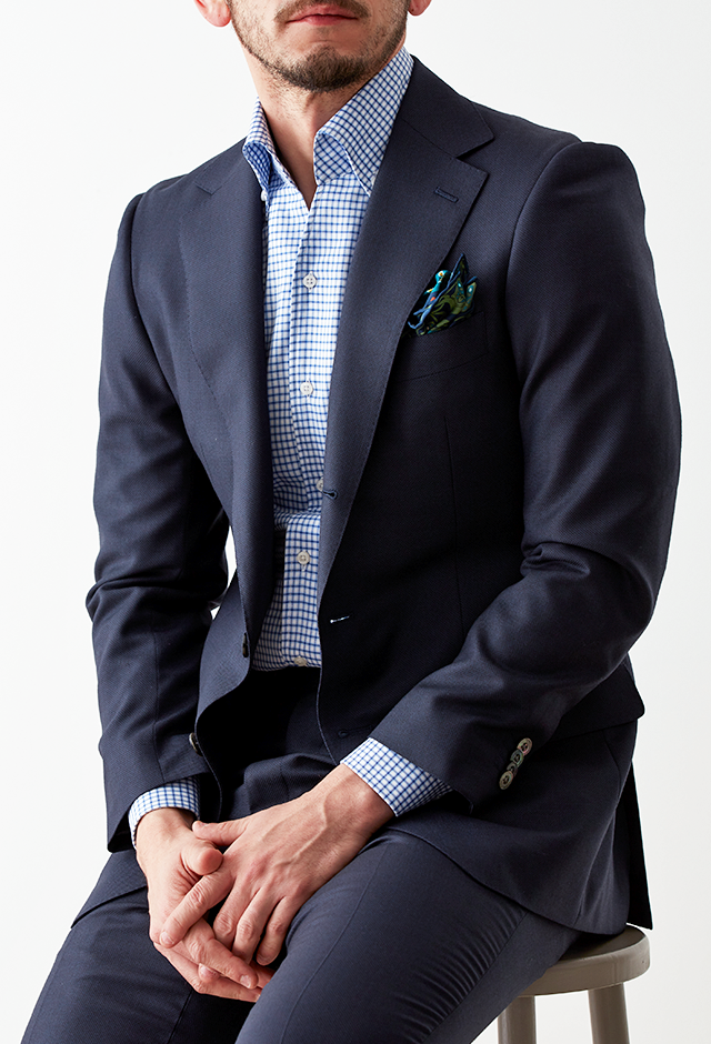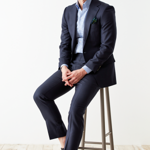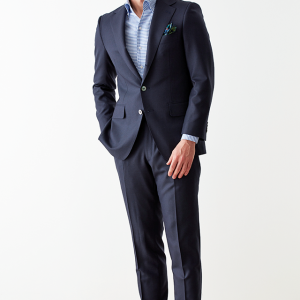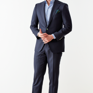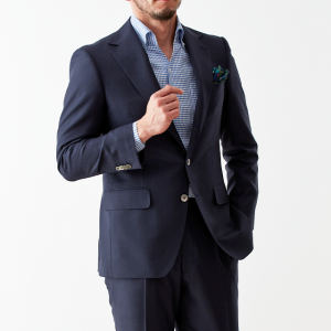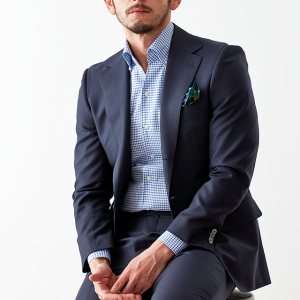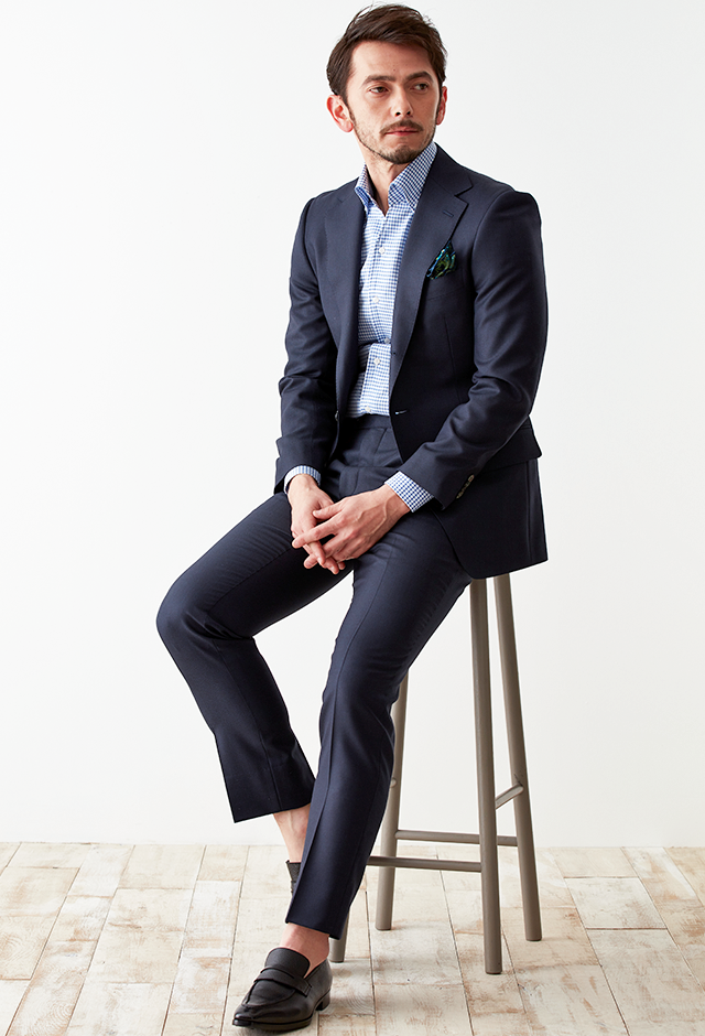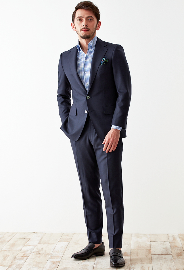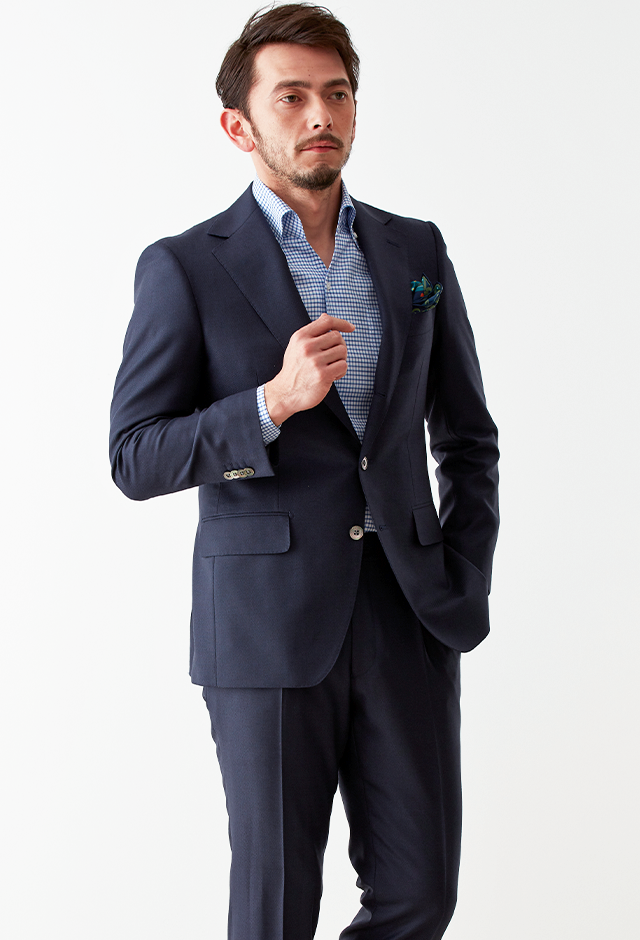 英国の伝統とモダンな感性を生地に落とし込む「バウアーローバック」で仕立てたスーツです。艶感が美しく肌なじみの良いシンプルなネイビースタイルで、オールシーズン着用していただけます。クラシックな部分とセクシーさを融合したモダンクラシックモデルで仕立てました。パンツの裾はスッキリとしたシングルタイプで、ビジネスシーンに最適です。チェック柄のシャツをアクセントに、同系色でまとめたノーカラーコーデで仕上げました。※生地在庫は変動いたしますのでご了承くださいませ。