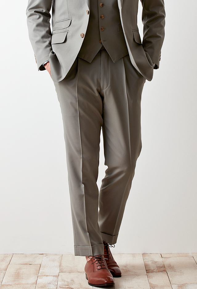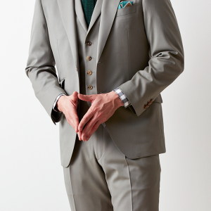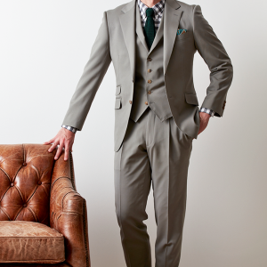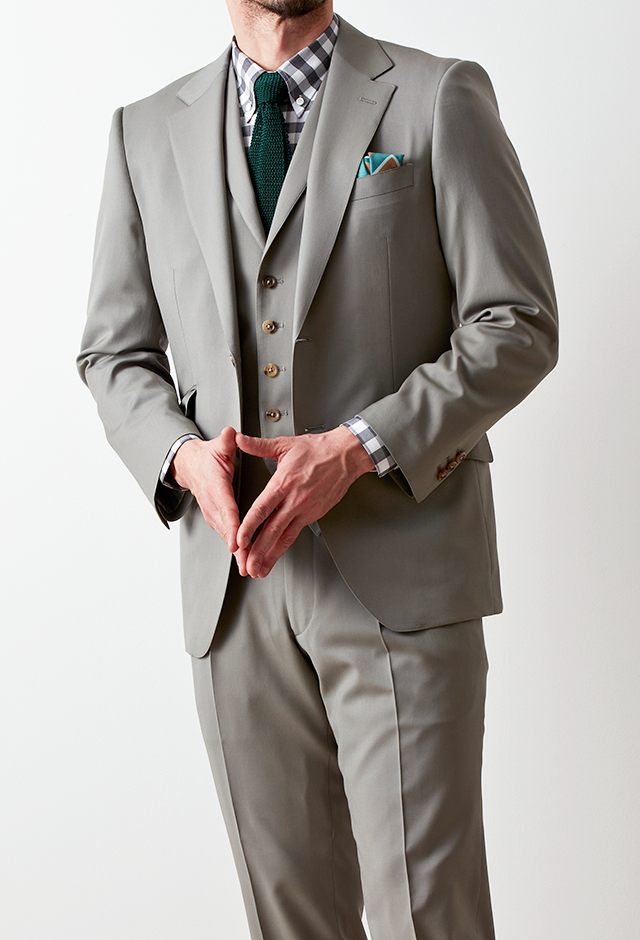 80ケ国以上にファンを持つ世界的なイギリスブランド「ドーメル」で仕立てたスーツです。グレーにも見える独特なカーキカラーと滑らかな質感が印象的な生地で、オールシーズン着用していただけます。コンパクトな着丈とシャープなフロントのカッタウェイラインが特徴のニュービスポークモデルで仕立てました。同系色の裏地には大人気のペイズリー柄をチョイスして華やかな印象に。ネクタイにもグリーン要素を入れて統一感のあるきれいめコーデに仕上げました。※生地在庫は変動いたしますのでご了承くださいませ。