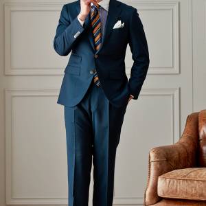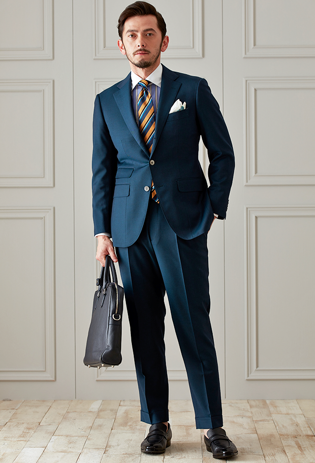 ストレッチ性の高い生地が大好評のイタリアブランド「トラバルド・トーニャ」で仕立てたスーツです。流行のグリーンカラーと滑らかな生地感が印象的なスタイルで、オールシーズン着用していただけます。最高峰グレードの「サルトリアモデル」で極上の着心地を味わうことが出来ます。小さいポケットが追加されたチェンジポケットオプションで、オーダーならではのお洒落を。イエローやブルーを差し色に、グリーンカラーをより美しく魅せるコーデです。※生地在庫は変動いたしますのでご了承くださいませ。