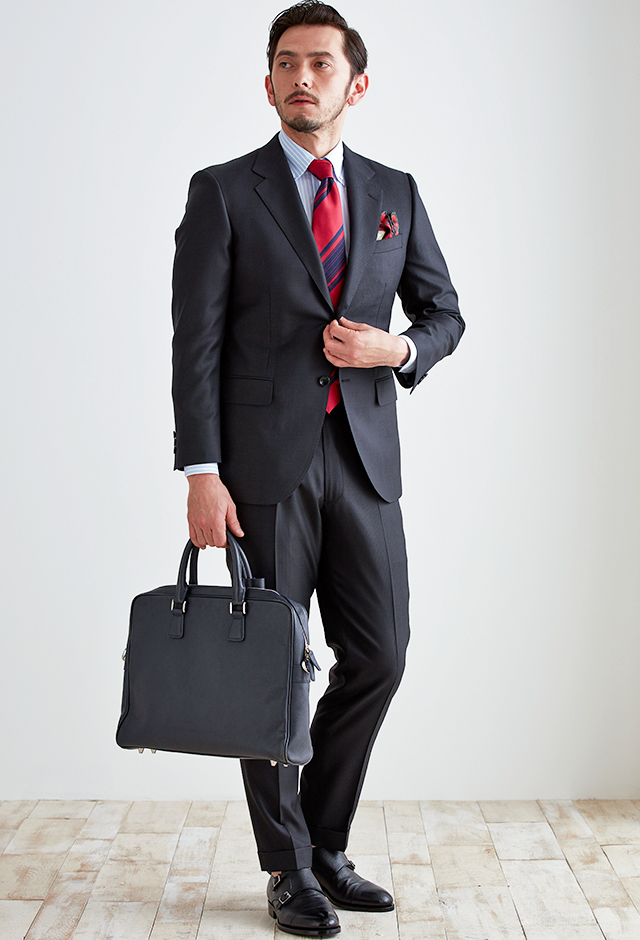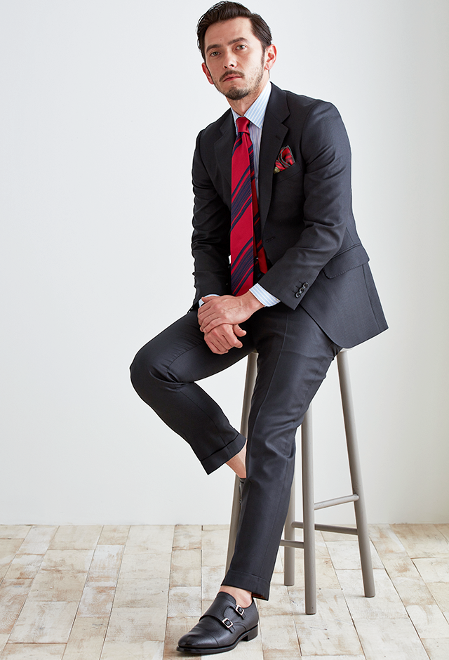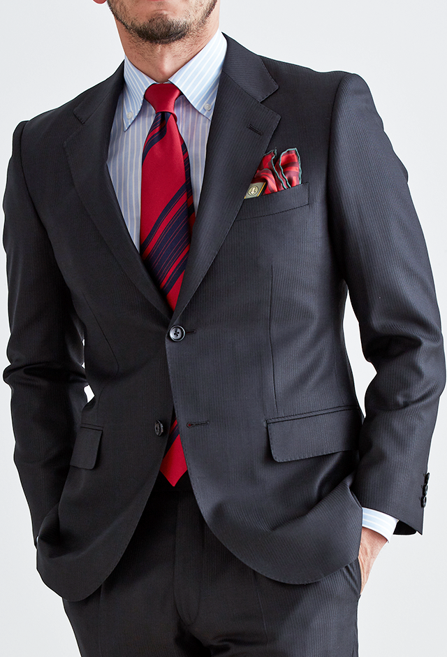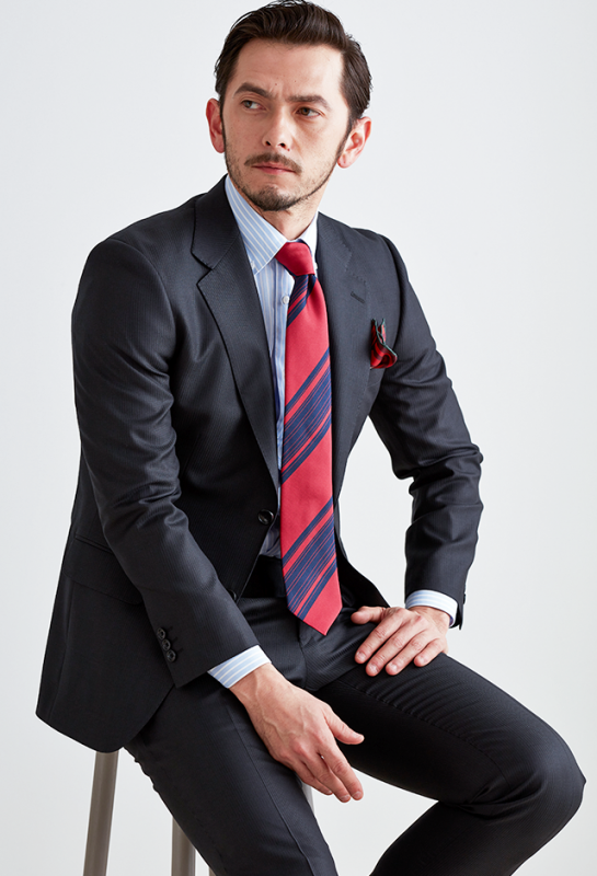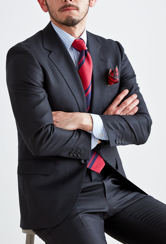 イタリア独自の風合いを活かした織り方に定評のある「タッリア・ディ・デルフィノ」で仕立てたスーツです。ブラックの生地に入った繊細なストライプが大人の雰囲気を醸し出すスタイルで、オールシーズン着用していただけます。人気の英国系モデル・モダンブリティッシュモデルで仕立てました。ボタンには同系色のブラックを使用して統一感をプラス。ストライプの入った赤ネクタイとチーフを差し色にしたコントラストの美しいコーデになります。※生地在庫は変動いたしますのでご了承くださいませ。