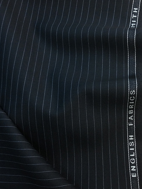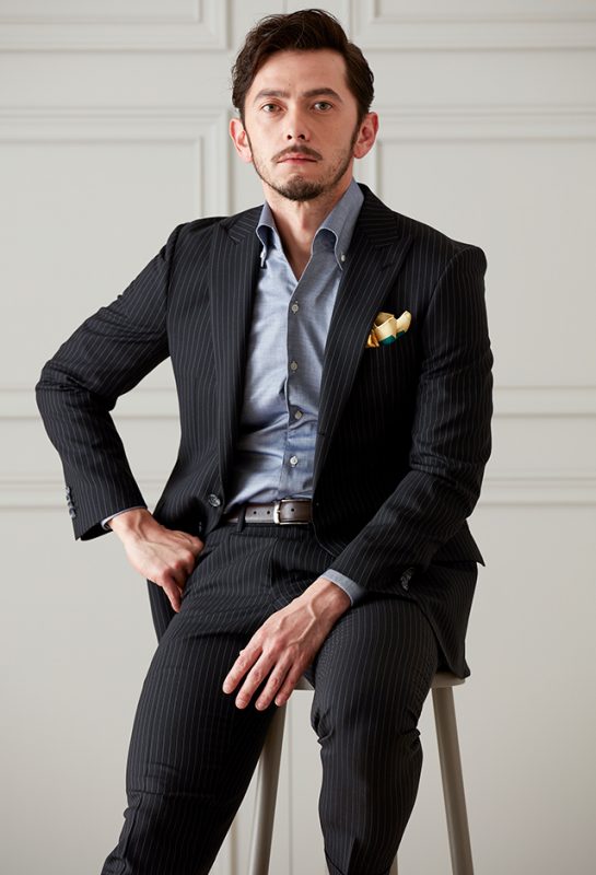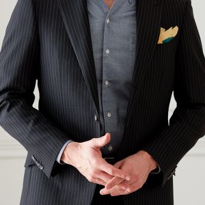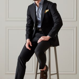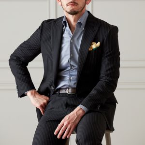英国生地らしいハリコシが強くしっかりとした生地が人気の「スミス&ウィルソン」で仕立てたスーツです。どんなシーンでも使えるブラックカラーにスタイリッシュなストライプ柄が入ったスタイルで、春夏シーズンの生地になります。クラシックな部分とセクシーさを融合したモダンクラシックモデルで仕立てました。ポケットは斜め(スラント)にすることでよりシャープな印象に仕上がります。イエローのチーフを差し色に、ブラックのシャツでまとめたワントーンコーデです。※生地在庫は変動いたしますのでご了承くださいませ。