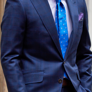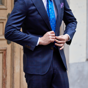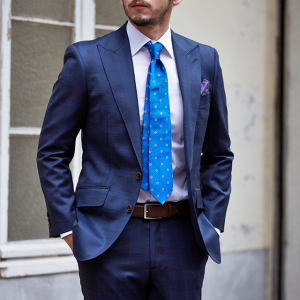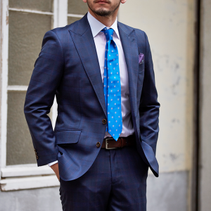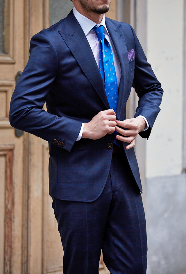 英国的な生地を作りだす知る人ぞ知る高級ブランド「サヴィル・クリフォード」で仕立てたスーツです。ネイビーにさり気ないチェック柄を組み合わせたビジネスシーンにも最適なスタイルで、オールシーズン着用していただけます。人気の英国系モデル・モダンブリティッシュモデルで仕立てました。ジャケットの襟は、存在感のあるピークドラペルをチョイス。シンプルながらもネクタイやチーフでアクセントを持たせたコーデです。※生地在庫は変動いたしますのでご了承くださいませ。
