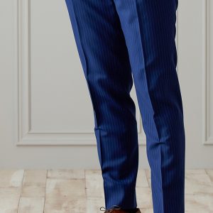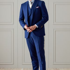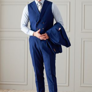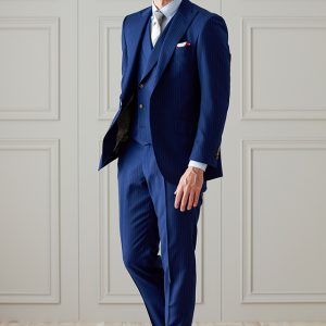 コストパフォーマンスの高さもからも支持されている「アンジェリコ」でお仕立てしたスーツです。鮮やかなブルー系ネイビーとストライプを組み合わせたクールなスタイルで、オールシーズン着用していただけます。クラシックな部分とセクシーさを融合したモダンクラシックモデルで仕立てました。ダブルベストでスリーピースにすることでフォーマル感をアップ。ジャケットを脱いでもきちんとした印象に。統一感のあるネイビーカラーでビジネスシーンにもおすすめのコーデです。※生地在庫は変動いたしますのでご了承くださいませ。