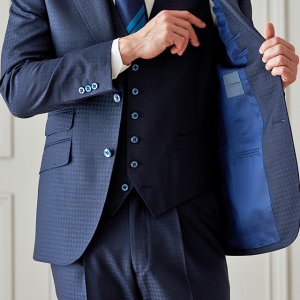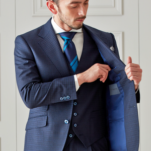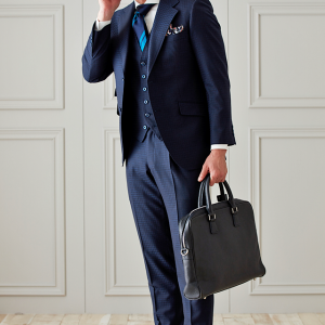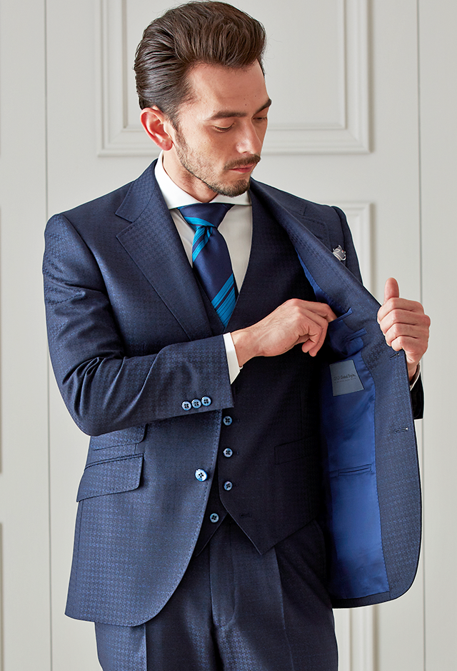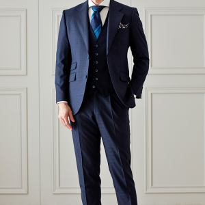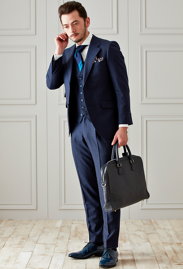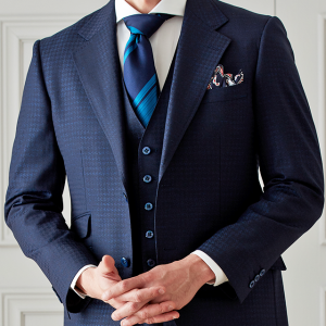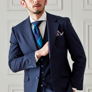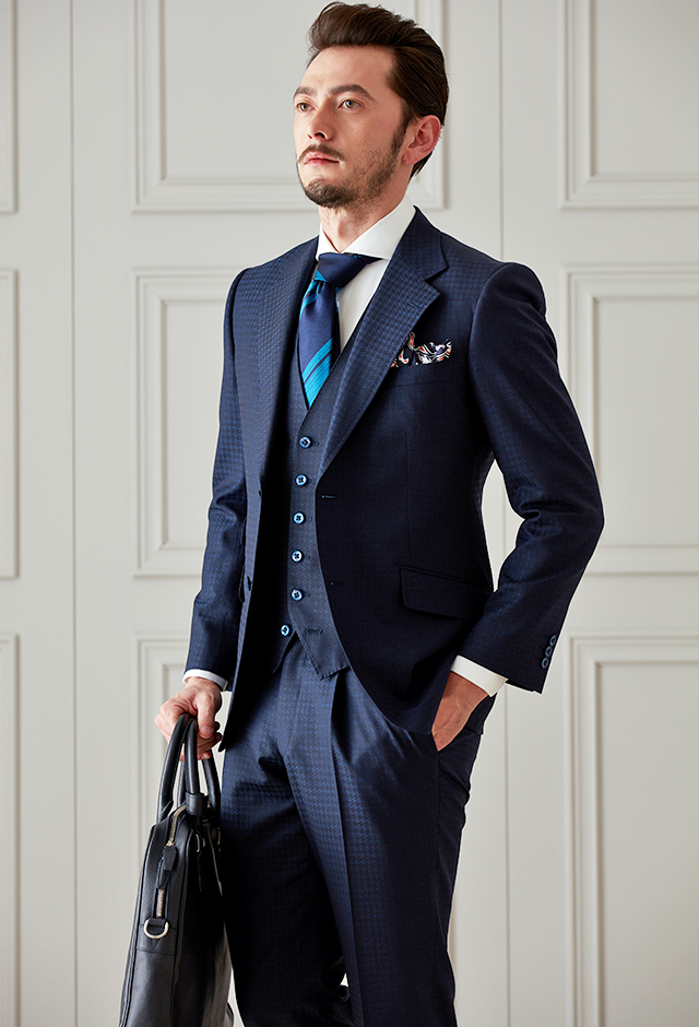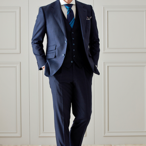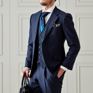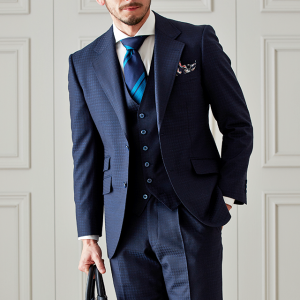 ファッション性が高くお洒落な生地が豊富な「アリストン」で仕立てたスーツです。人気のネイビーカラーに千鳥格子柄を加えた上品なスタイルで、オールシーズン着用していただけます。人気の英国系モデル・モダンブリティッシュモデルで仕立てました。小さいポケットが追加されたチェンジポケットオプションで、オーダーならではのお洒落を。裏地は同系色で統一感をプラス。ネクタイやシューズも同系色のネイビーカラーでまとめ、洗練された雰囲気に仕上げました。※生地在庫は変動いたしますのでご了承くださいませ。