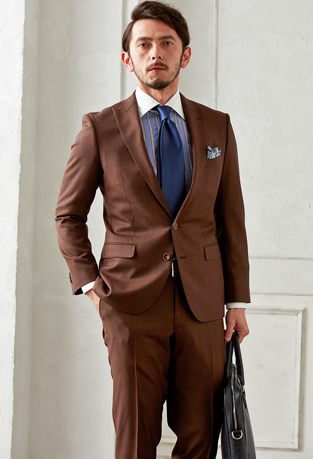 ファッション性が高くお洒落な生地が豊富な「アリストン」で仕立てたスーツです。トレンドのブラウンカラーと生地の滑らかな質感が印象的なスタイルで、オールシーズン着用していただけます。モードな空気感を醸し出すことが出来るスリムフィットモデルでお仕立てしました。同系色の裏地には大人気のペイズリー柄をチョイスして華やかな印象に。ブラウンと相性の良い、青みが強いブルーを組み合わせたハイセンスな2色コーデです。※生地在庫は変動いたしますのでご了承くださいませ。