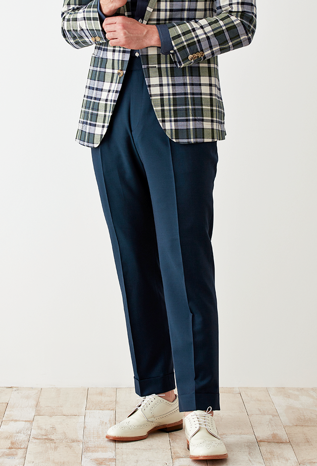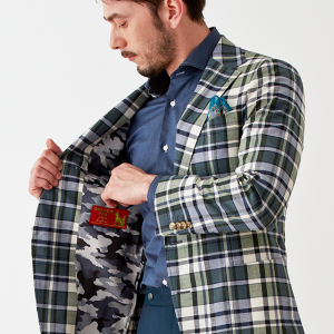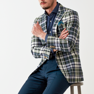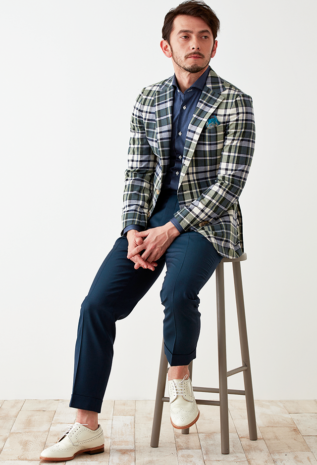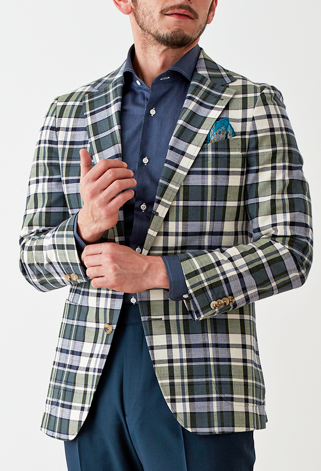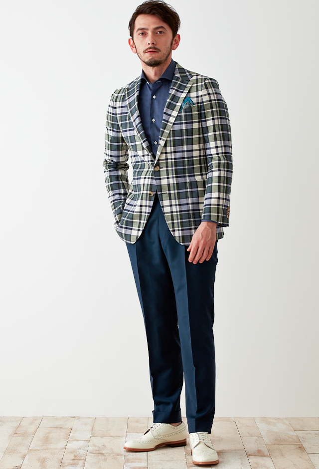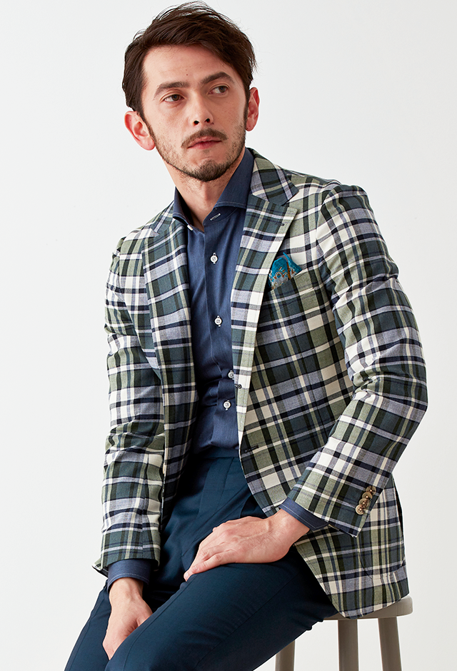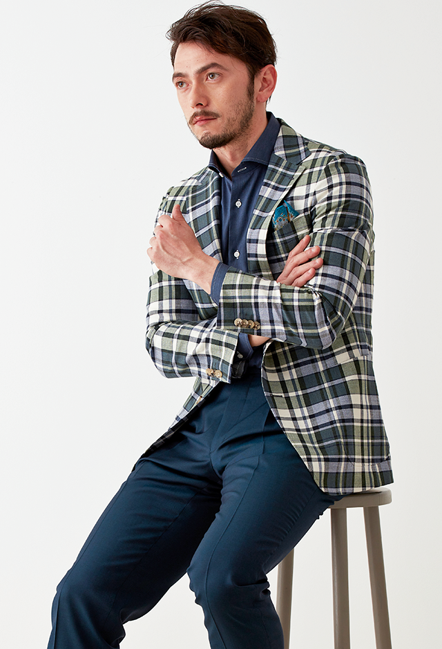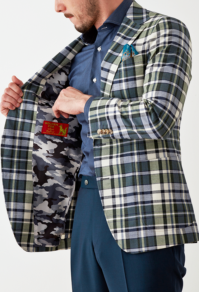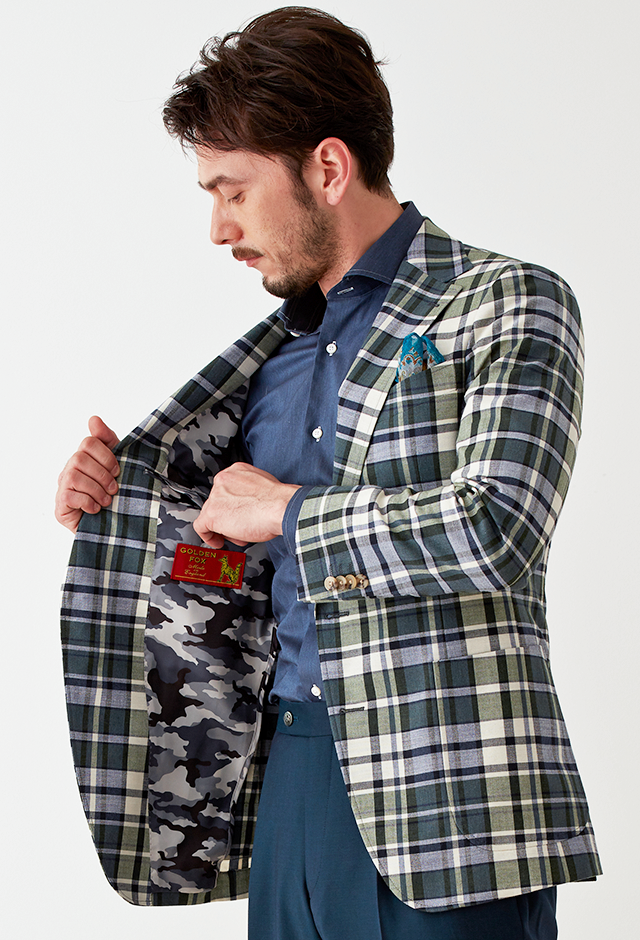 フランネルの創設者として公認されているイギリスの高級ブランド「フォックスブラザーズ」で仕立てたスーツです。流行のカーキと存在感のあるチェック柄でお洒落なスタイルで、春夏シーズンの生地になります。肩パットや芯地を極力排したアンコンモデルでジャケットを仕立てました。裏地には迷彩柄をチョイス。オーダーならではの珍しい色柄です。シャツとパンツをシンプルなネイビーにすることで、全体のバランスを取ったジャケパンコーデです。※生地在庫は変動いたしますのでご了承くださいませ。