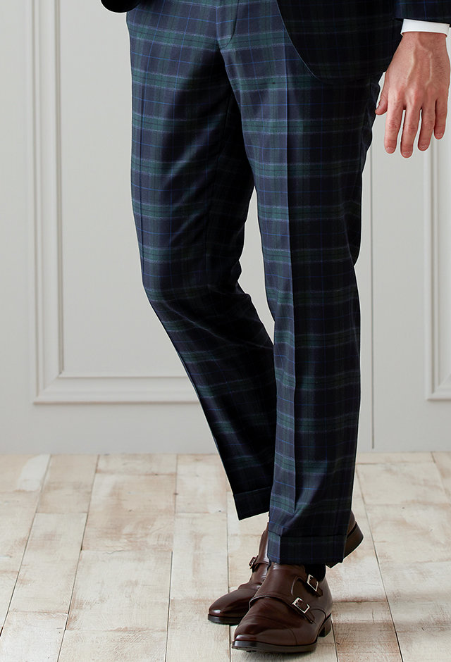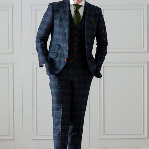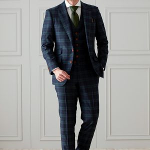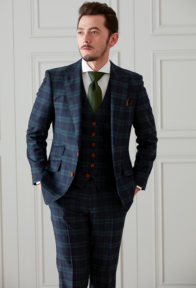 イタリアの老舗高級メーカー「イートーマス」で仕立てたスーツです。ネイビーに存在感のあるチェックが入ったインパクトあるスタイルで、オールシーズン着用していただけます。クラシックな部分とセクシーさを融合したモダンクラシックモデルで仕立てました。ボタンはグリーンと相性の良いキャラメルブラウン系をチョイス。ベストもセットのスリーピースでフォーマル感や重厚感をプラス。ネクタイをグリーンにすることでまとまりがありスッキリとした仕上がりです。※生地在庫は変動いたしますのでご了承くださいませ。