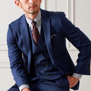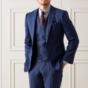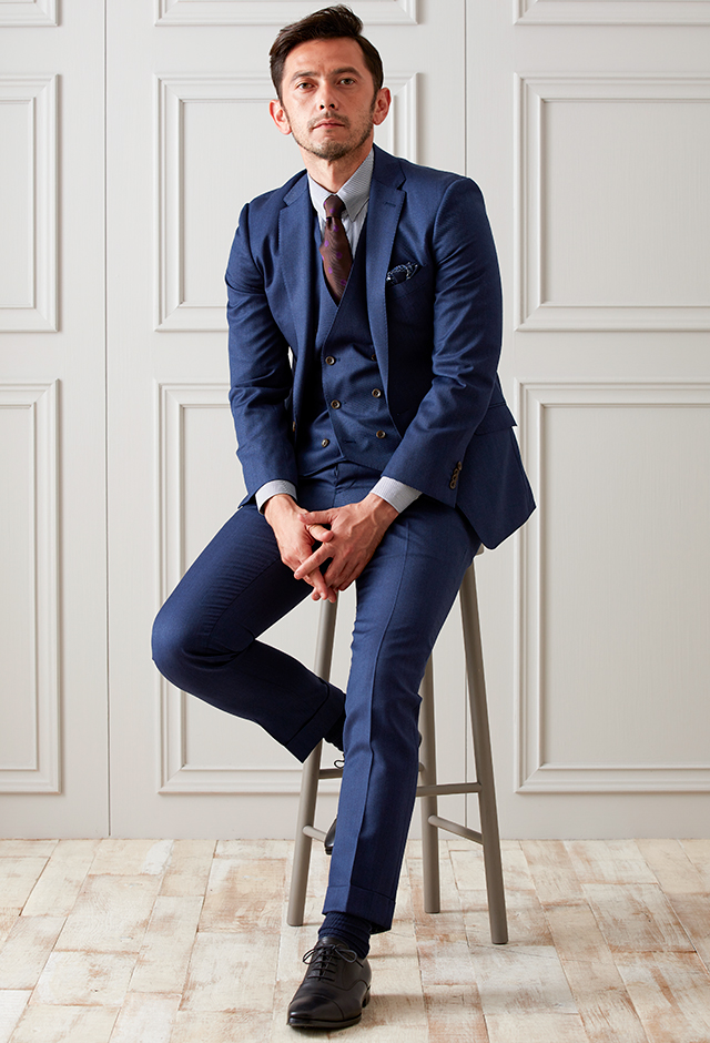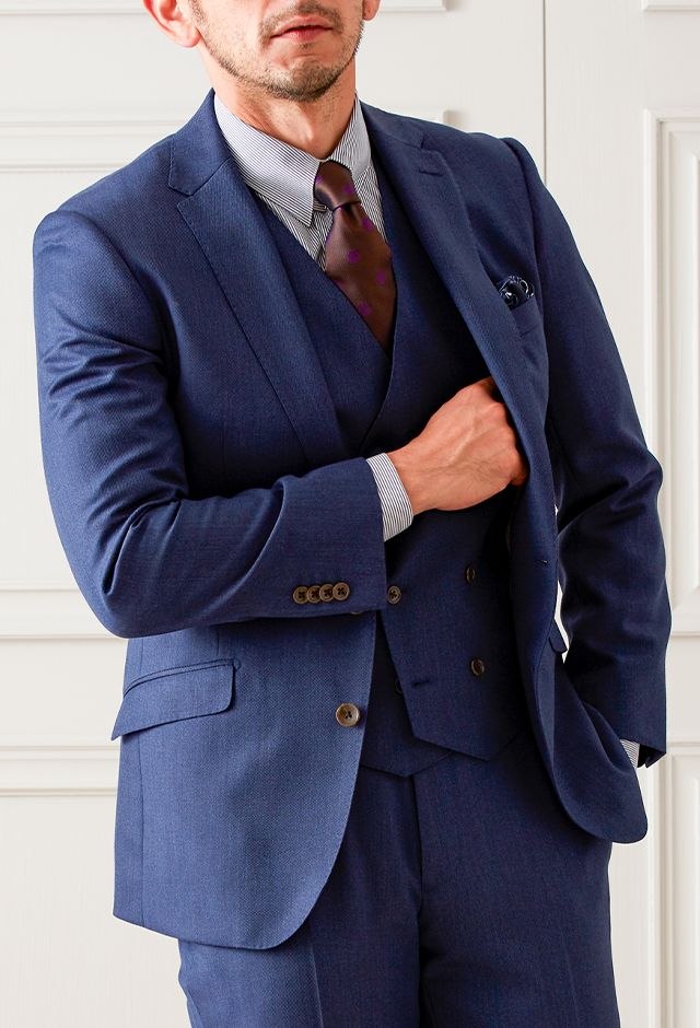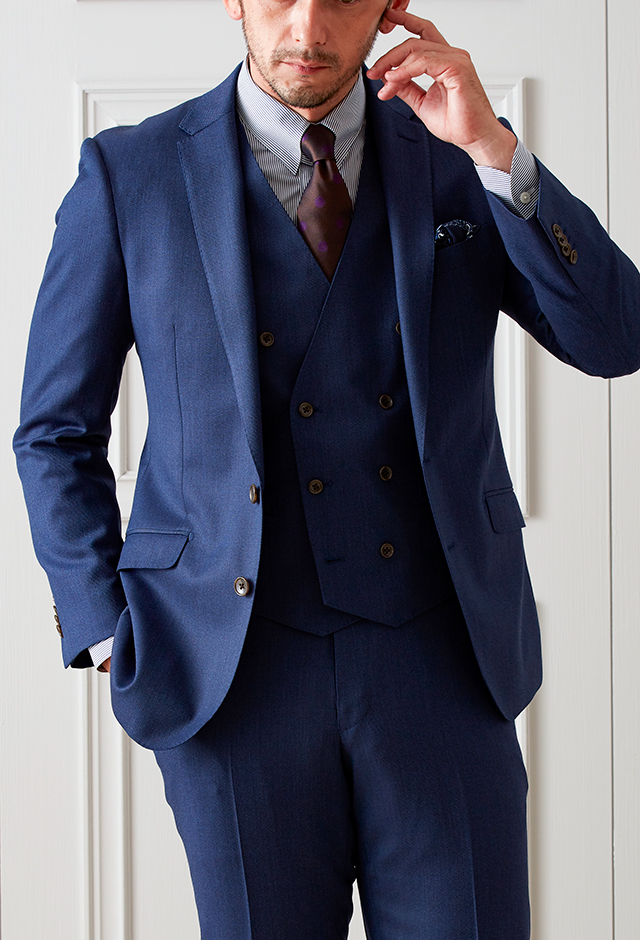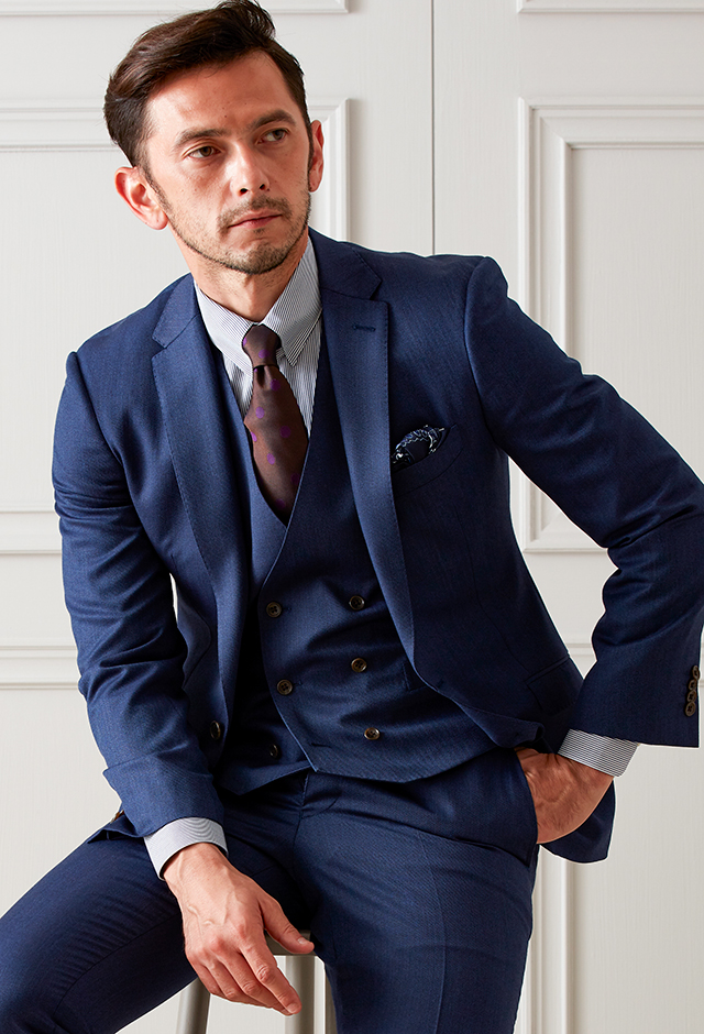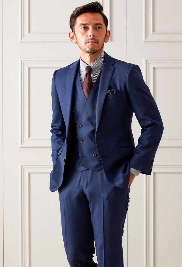 雨が多く多湿な気候を有する市場においても絶大な評価を獲得している「ドラゴ」で仕立てたスーツです。シンプルな無地が発色の綺麗なネイビーカラーを際立たせるスタイルで、オールシーズン着用していただけます。モードな空気感を醸し出すことが出来るスリムフィットモデルでお仕立てしました。ダブルベストでスリーピースにすることでフォーマル感をアップ。ジャケットを脱いでもきちんとした印象に。ネイビーのストライプシャツでスッキリとした印象に仕上げました。※生地在庫は変動いたしますのでご了承くださいませ。