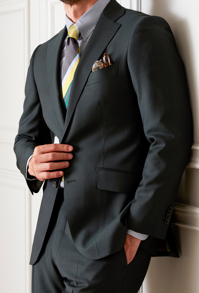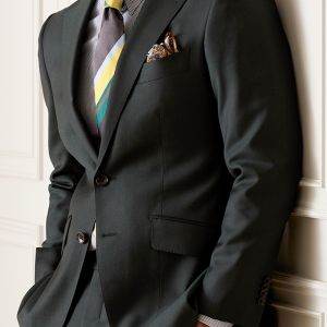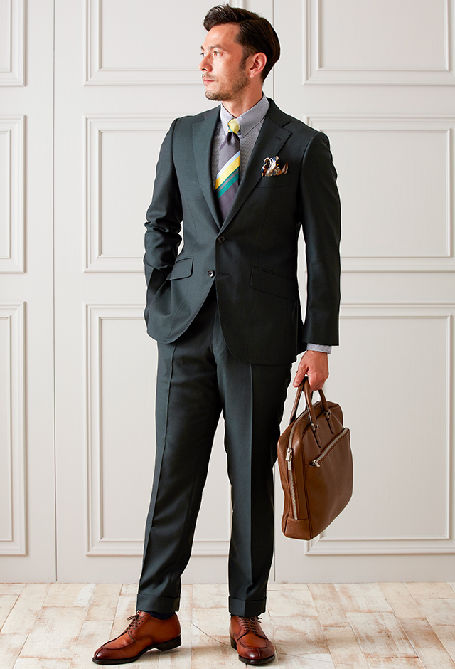 ストレッチ性の高い生地が大好評のイタリアブランド「トラバルド・トーニャ」で仕立てたスーツです。落ち着いたトーンのカーキカラーで流行色を自然に取り入れたスタイルで、オールシーズン着用していただけます。最高峰グレードの「サルトリアモデル」で極上の着心地を味わうことが出来ます。ポケットは斜め(スラント)にすることでよりシャープな印象に仕上がります。小物にイエローカラーを散りばめて、ヘルシーな雰囲気に仕上げました。※生地在庫は変動いたしますのでご了承くださいませ。