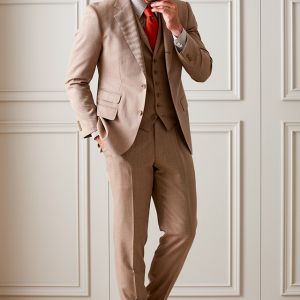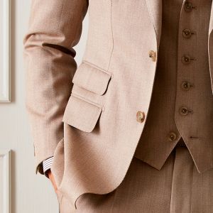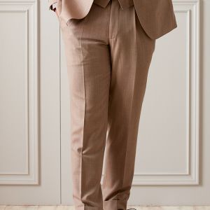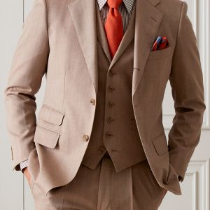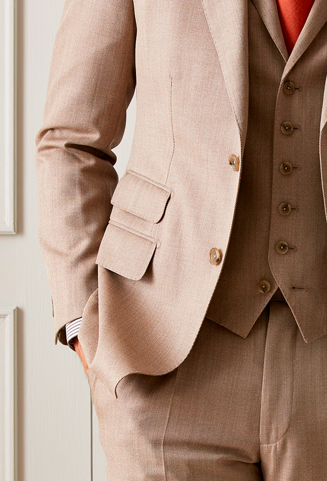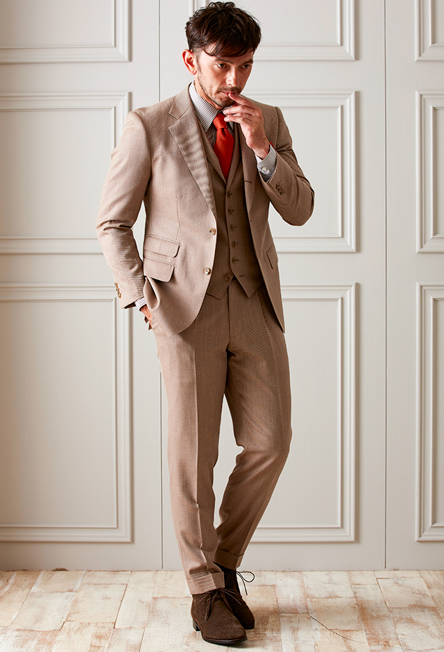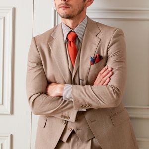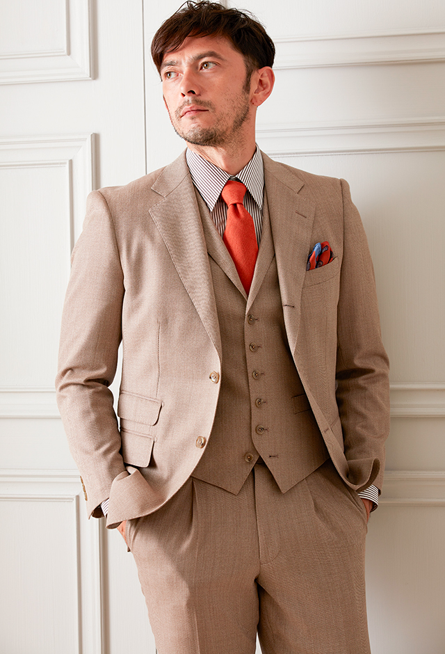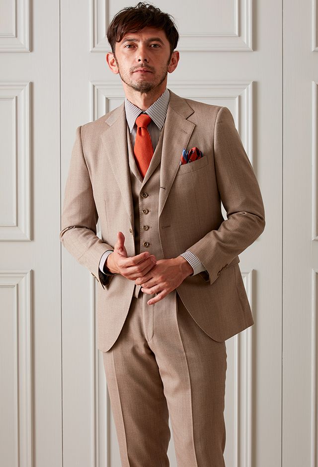 雨が多く多湿な気候を有する市場においても絶大な評価を獲得している「ドラゴ」で仕立てたスーツです。落ち着きのあるベージュカラーと無地を合わせたシンプルスタイルで、オールシーズン着用していただけます。人気の英国系モデル・モダンブリティッシュモデルで仕立てました。小さいポケットが追加されたチェンジポケットオプションで、オーダーならではのお洒落を。オレンジカラーをアクセントにして、暖かみのある雰囲気に仕上げました。※生地在庫は変動いたしますのでご了承くださいませ。