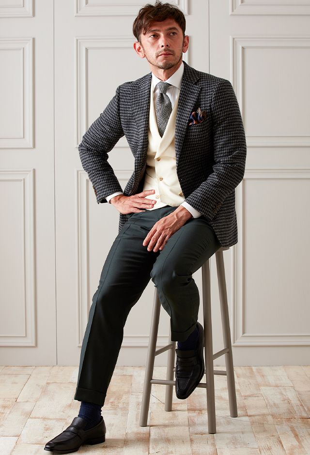 フランネルの創設者として公認されているイギリスの高級ブランド「フォックスブラザーズ」で仕立てたジャケットです。千鳥格子とグレーカラーを組み合わせたお洒落なスタイルで、秋冬シーズンの生地になります。最高峰グレードの「サルトリアモデル」で極上の着心地を味わうことが出来ます。ジャケットには、腰回りをすっきりと見せる効果のあるフラップ無しのポケットを採用。モノトーンコーデに、カーキのパンツを組み合わせて流行を取り入れました。※生地在庫は変動いたしますのでご了承くださいませ。