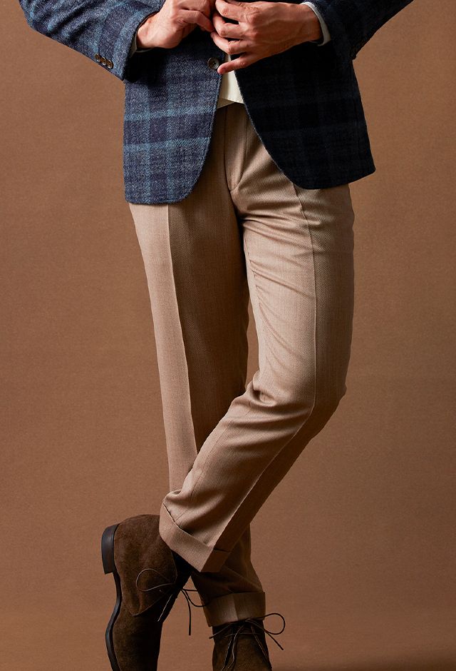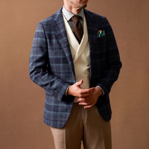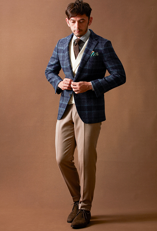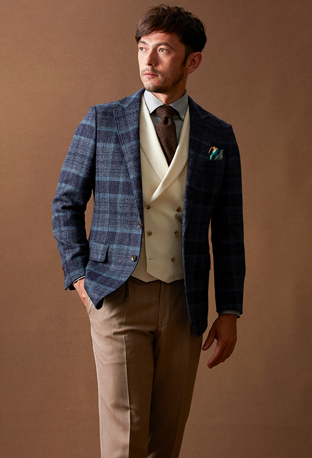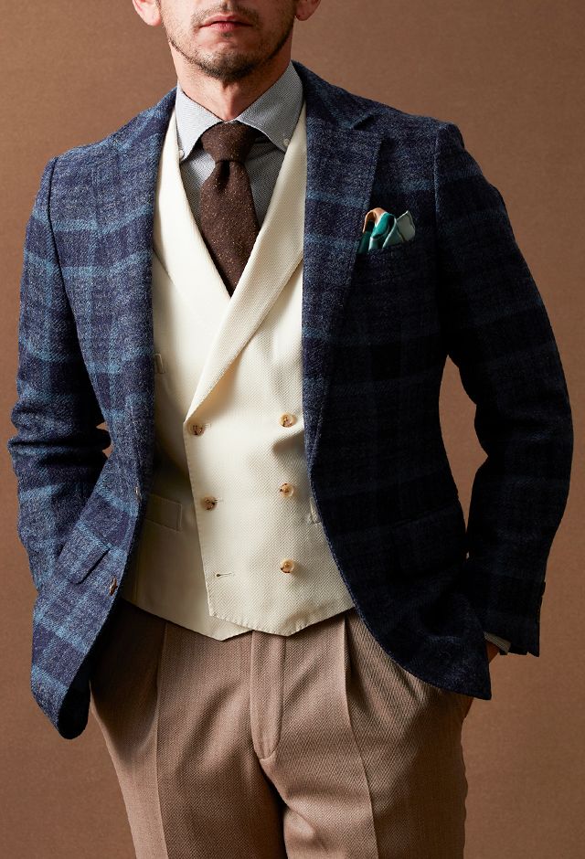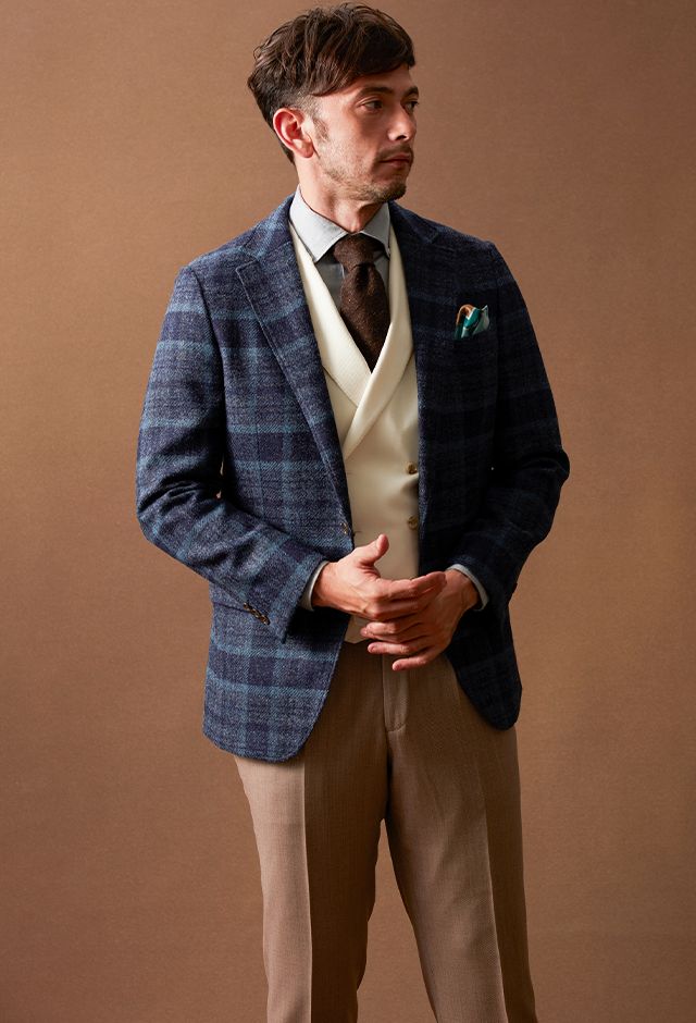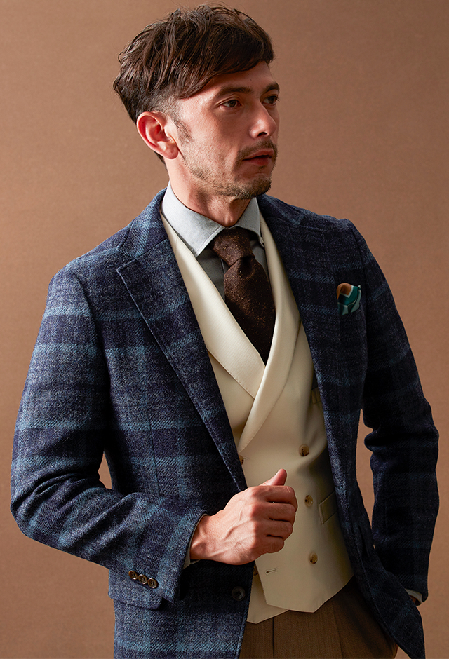 ファッション性の高い織柄と絶妙な色合いを醸し出す糸使いの生地が魅力の英国ブランド「ムーン」で仕立てたジャケットです。ネイビーカラーのベースに様々なトーンのブルーチェックが入ったお洒落なスタイルで、秋冬シーズンの生地になります。空気を纏うような着心地を楽しむアンコンモデルでジャケットを仕立てました。ジャケットにはミシンステッチを入れてステッチを強調。白のベストをアクセントに、ブラウンやネイビーでまとめた3色コーデです。※生地在庫は変動いたしますのでご了承くださいませ。