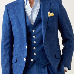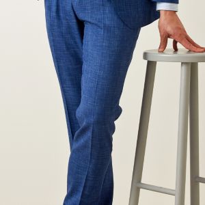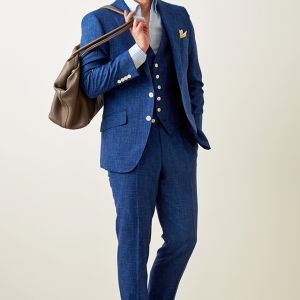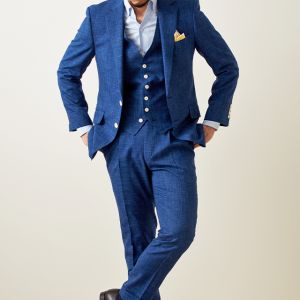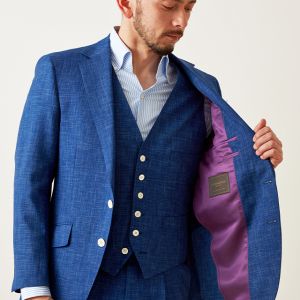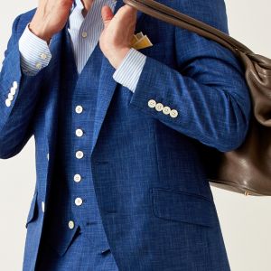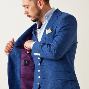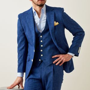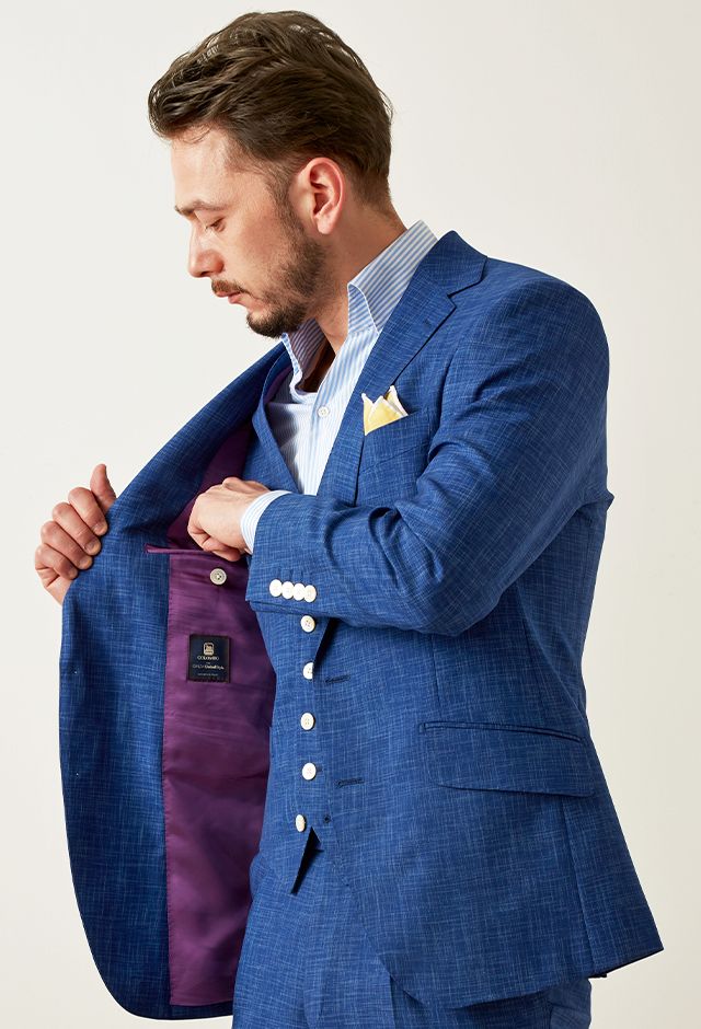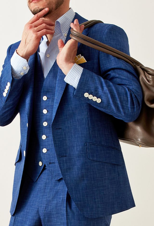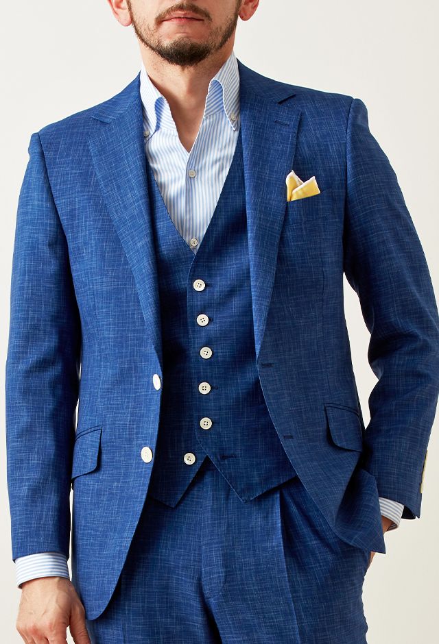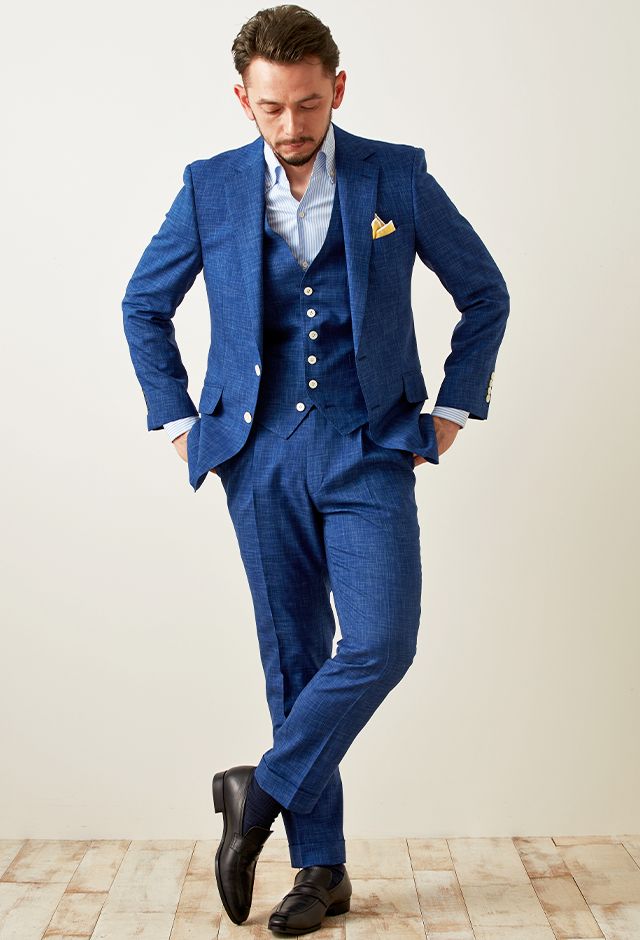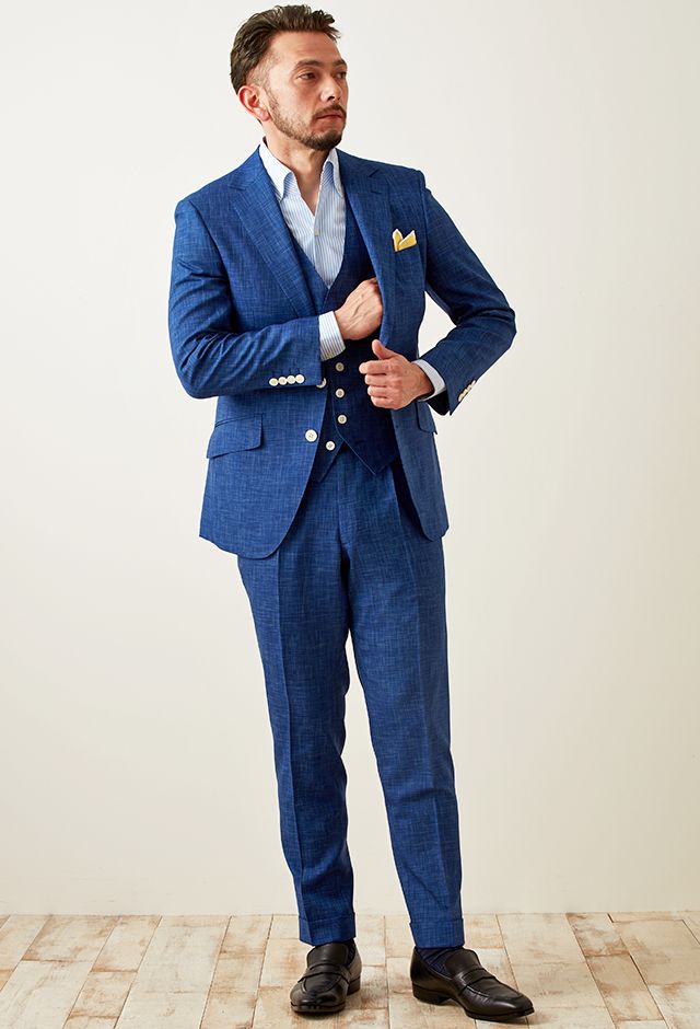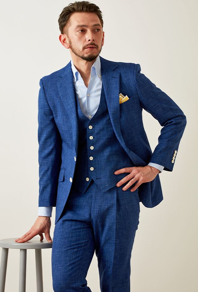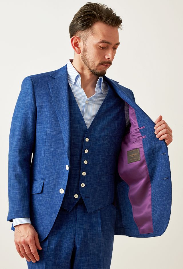最高級ブランドに使われる素材を生み出すイタリアブランド「ルイージ・コロンボ」で仕立てたスーツです。鮮やかなブルーカラーと独特な生地の織り模様が印象的なスタイルで、オールシーズン着用していただけます。クラシックな部分とセクシーさを融合したモダンクラシックモデルで仕立てました。裏地は色気のあるパープル。ベストもセットのスリーピースでフォーマル感や重厚感をプラス。チーフを差し色にブルーでまとめた清涼感のあるコーデです。※生地在庫は変動いたしますのでご了承くださいませ。