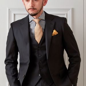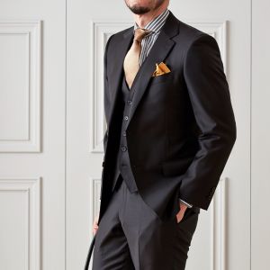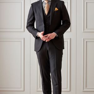 美しい発色と高級感溢れる光沢が特徴の「チェルッティ」で仕立てたスーツです。深みのあるブラックカラーに定番の無地を組み合わせたスタイルで、オールシーズン着用していただけます。コンパクトな着丈とシャープなフロントのカッタウェイラインが特徴のニュービスポークモデルで仕立てました。裏地にはグレーのペイズリー柄で華やかさをプラス。ゴールドのネクタイ・チーフとブラックスーツのコントラストが高級感のあるコーデです。※生地在庫は変動いたしますのでご了承くださいませ。