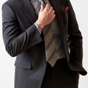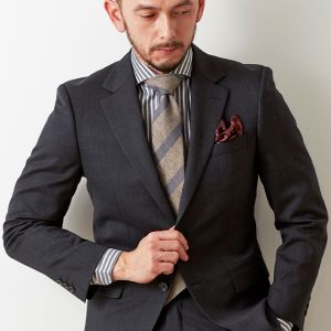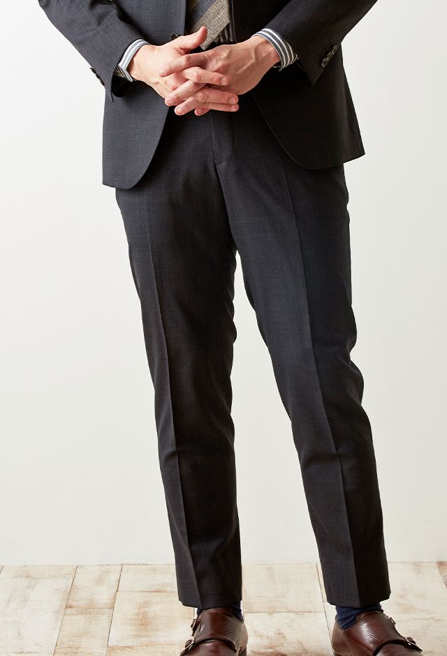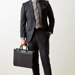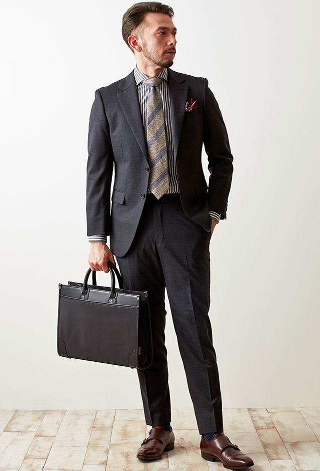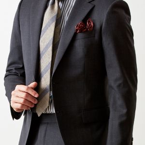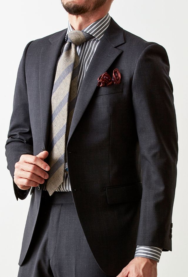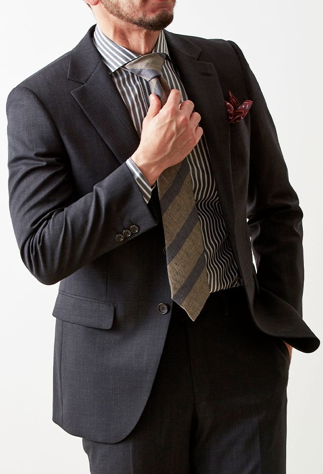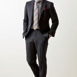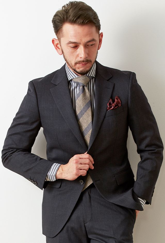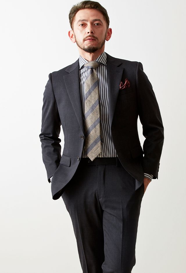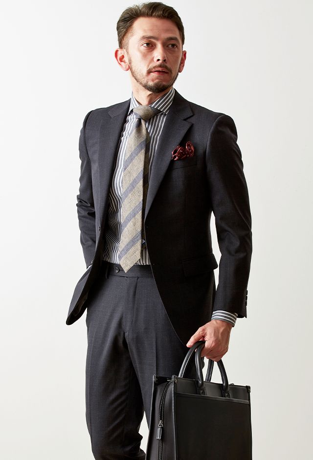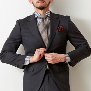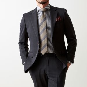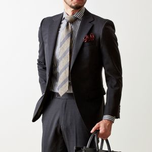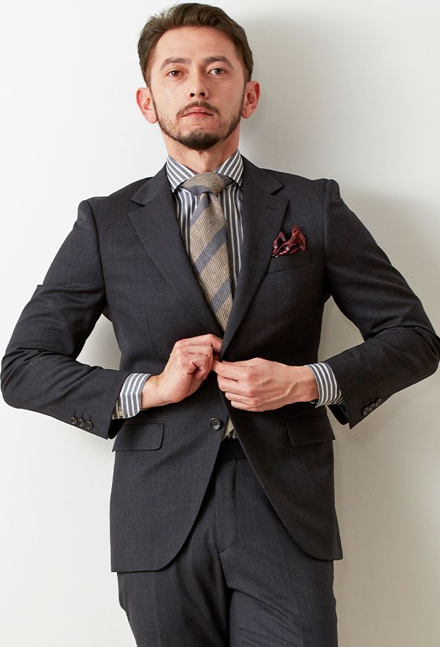柔らかな質感、心地よい肌触り、形態安定性を併せ持つ高機能素材「ソロテックス」で仕立てたスーツです。王道のグレー×無地のビジネスシーンにも最適なスタイルで、オールシーズン着用していただけます。コンパクトな着丈とシャープなフロントのカッタウェイラインが特徴のニュービスポークモデルで仕立てました。パンツの裾はスッキリとしたシングルタイプ。ボタンも同系色をチョイス。グレーシャツや落ち着きあるトーンの小物でまとめて、大人の雰囲気に仕上げたコーデです。※生地在庫は変動いたしますのでご了承くださいませ。