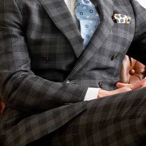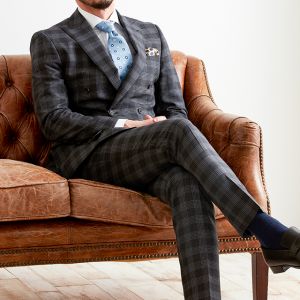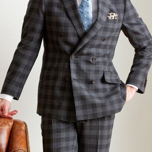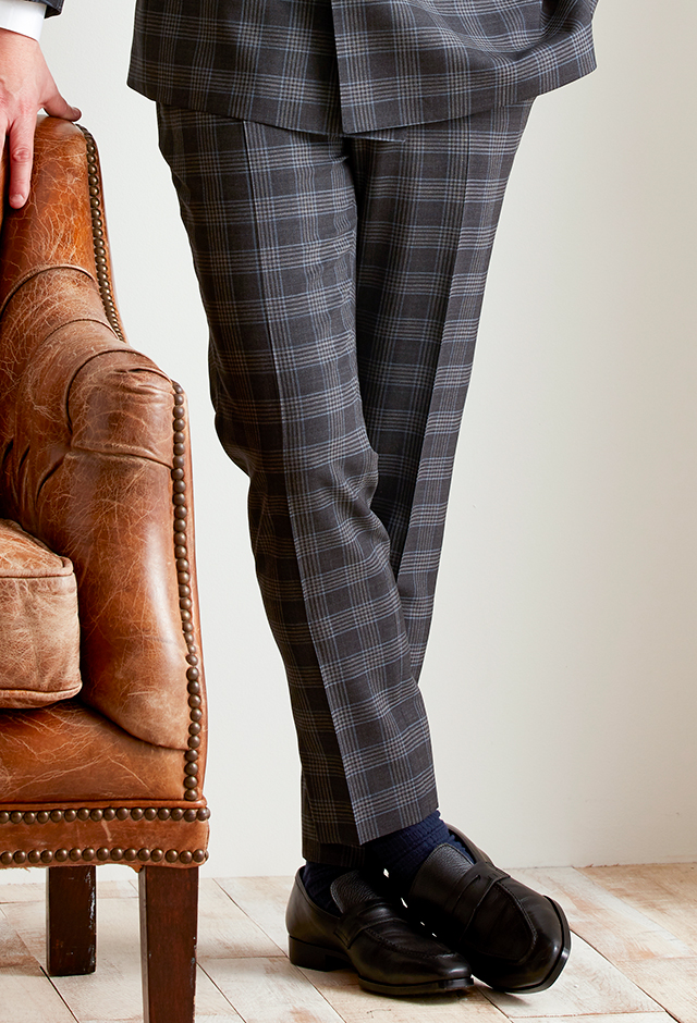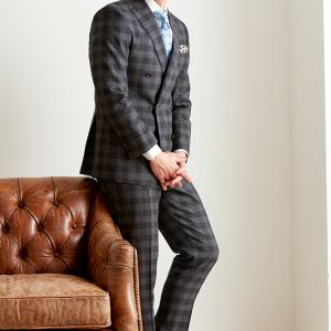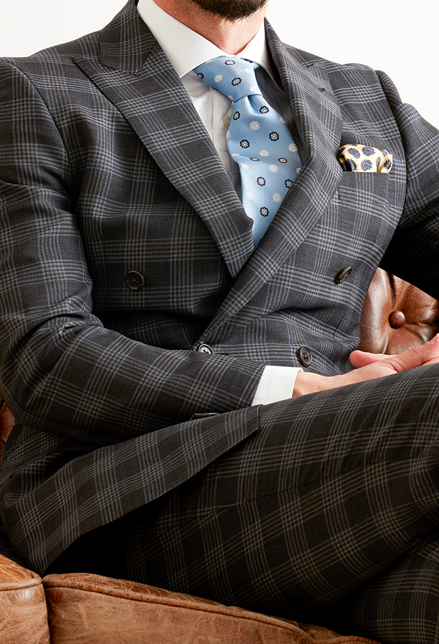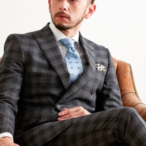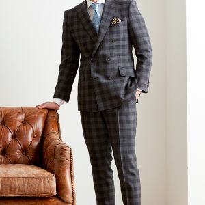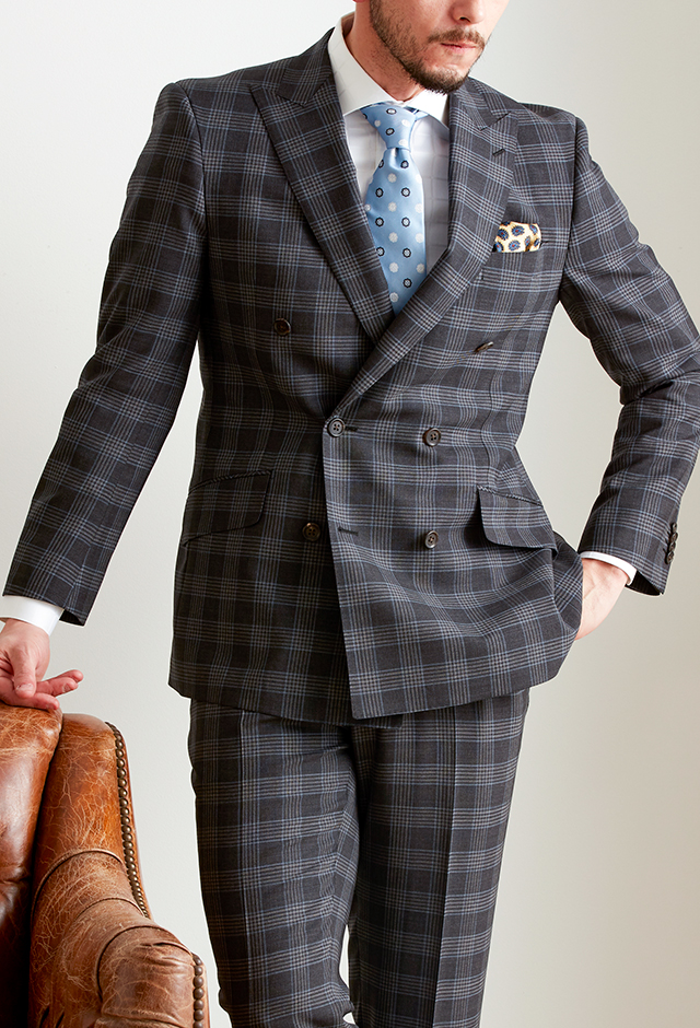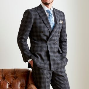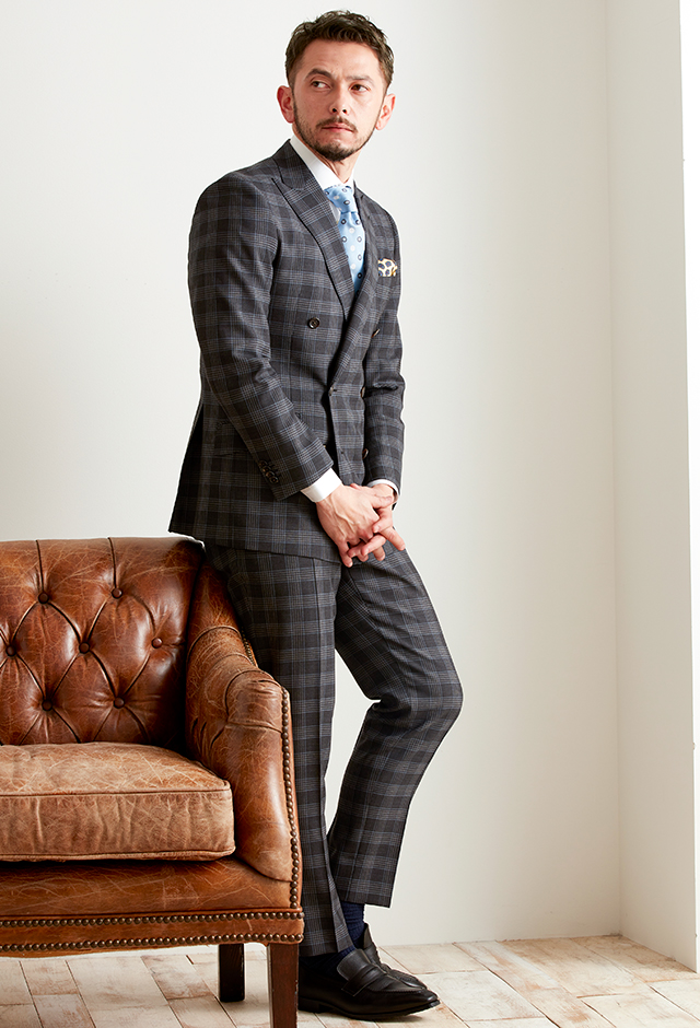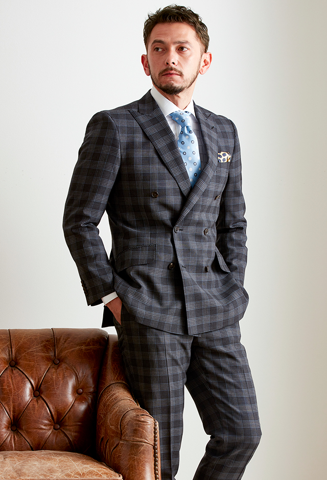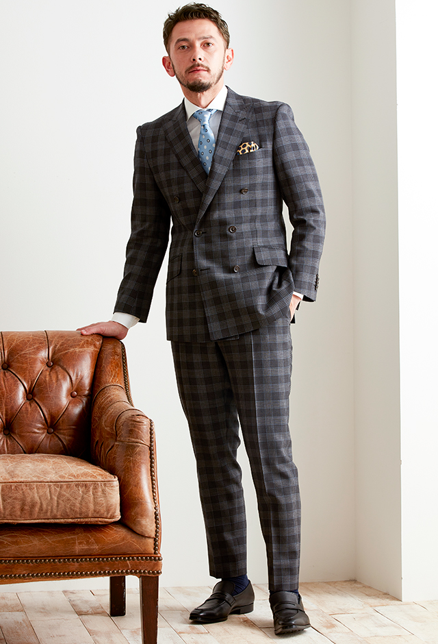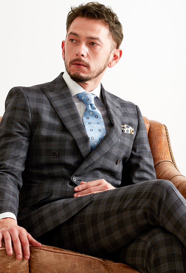 英国生地らしいハリコシが強くしっかりとした生地が人気の「スミス&ウィルソン」で仕立てたスーツです。グレーカラーに特徴的なライトグレーチェックが入ったスタイルで、春夏シーズンの生地になります。大人の色気を醸し出す優美なフォルムが特徴のモダンクラシックモデル(ダブル)で仕立てました。ジャケットの襟は、ダブルスーツで多く採用されるピークドラペルをチョイス。ヘルシーな小物を取り入れた、スーツの色柄を際立たせるコーデです。※生地在庫は変動いたしますのでご了承くださいませ。