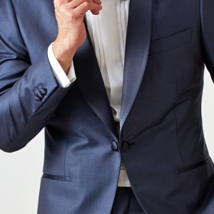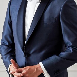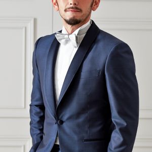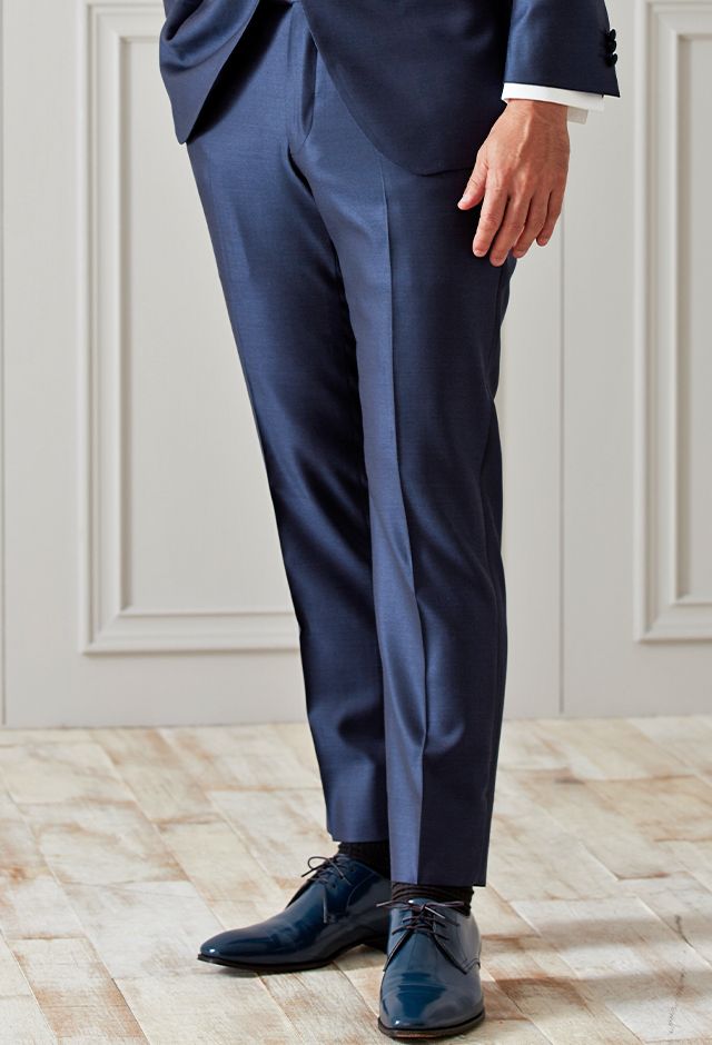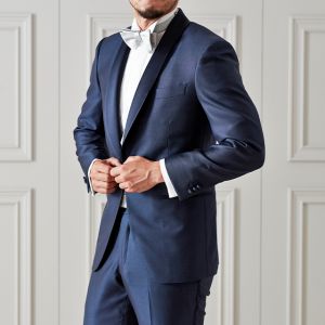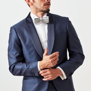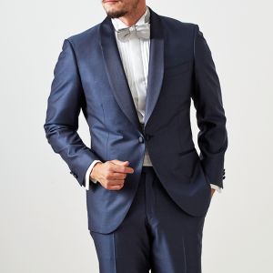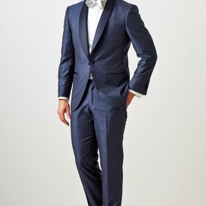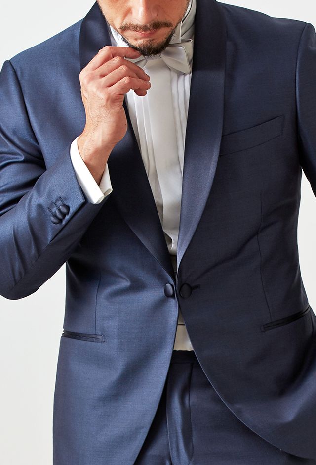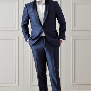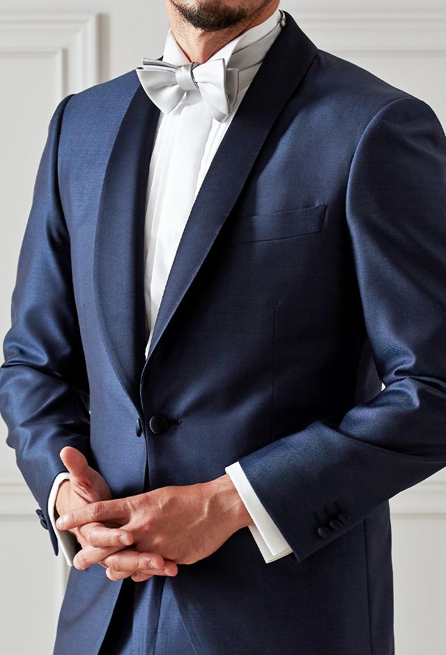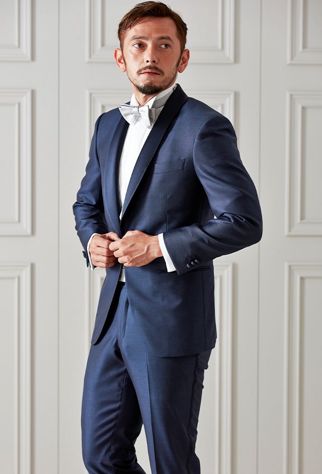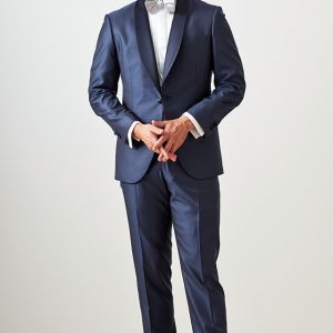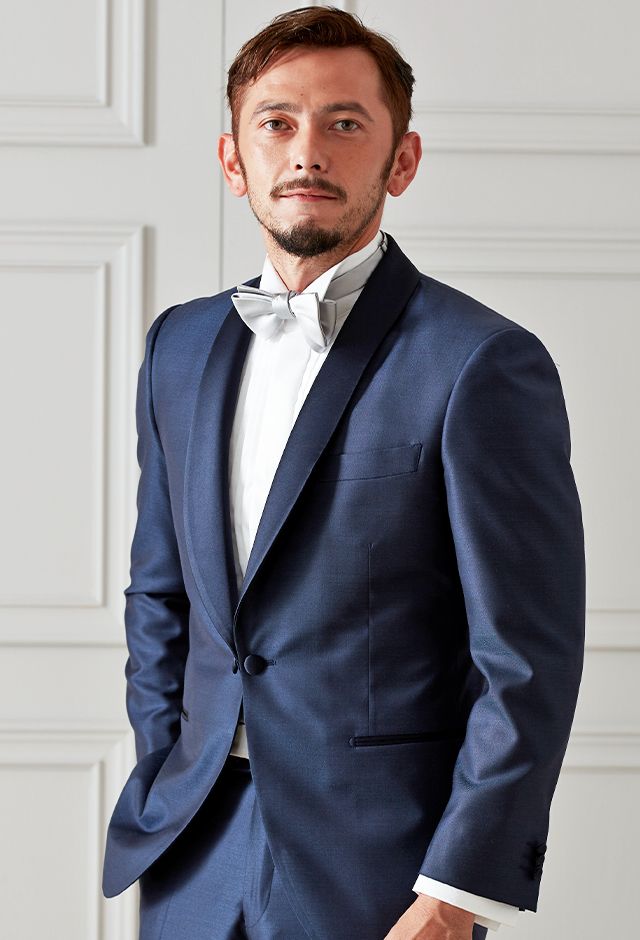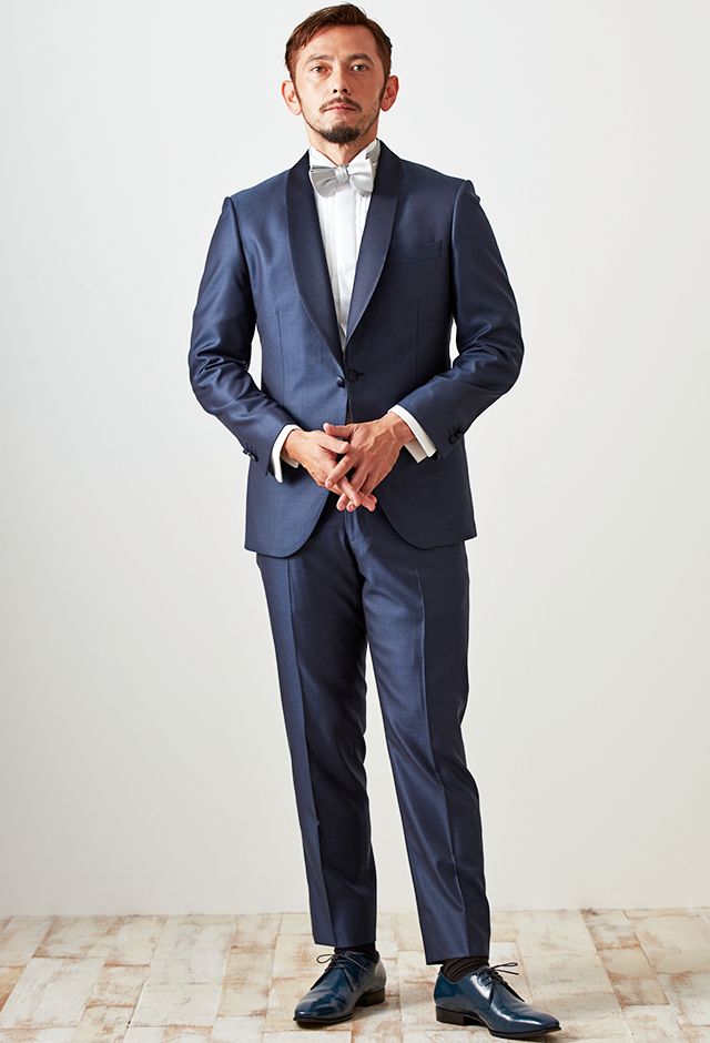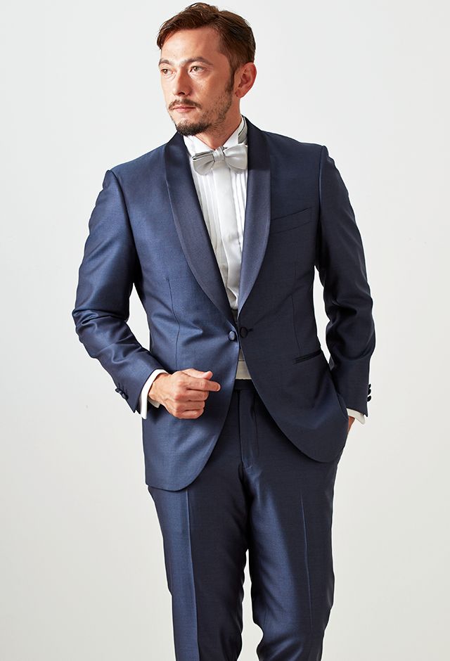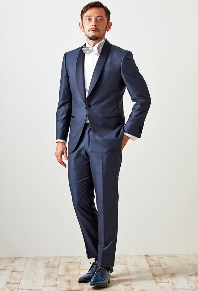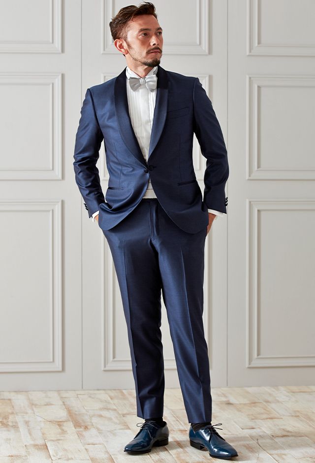 イタリア独自の風合いを活かした織り方に定評のある「タッリア・ディ・デルフィノ」で仕立てたスーツです。光沢感の美しい素材に王道のブルーと無地のスタイルで、オールシーズン着用していただけます。人気の英国系モデル・モダンブリティッシュモデルで仕立てました。ジャケットの襟はショールカラーにすることでより華やかな印象に。ウィングカラーの白シャツに蝶ネクタイを合わせた、礼服・パーティー用スーツとして重宝するコーデです。※生地在庫は変動いたしますのでご了承くださいませ。