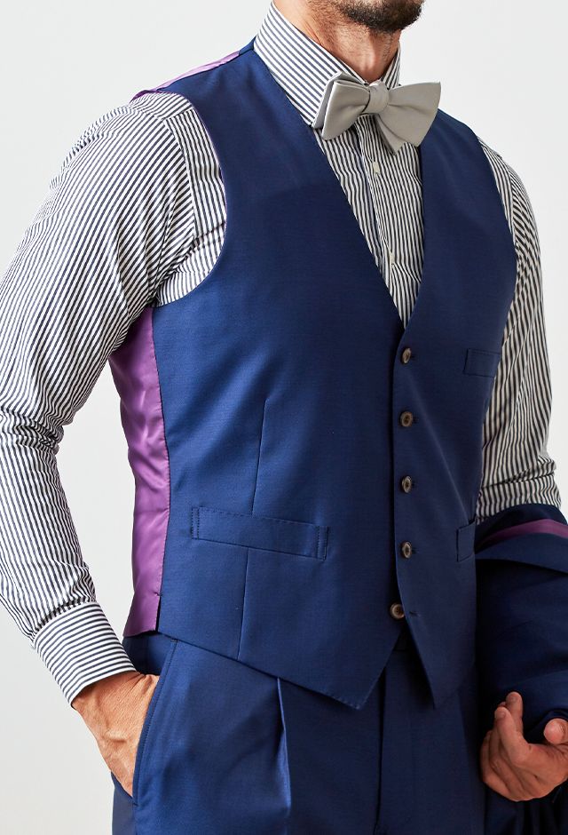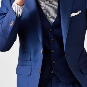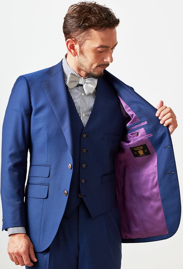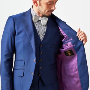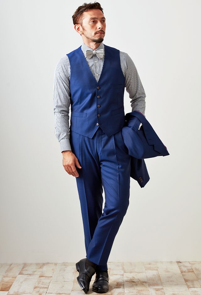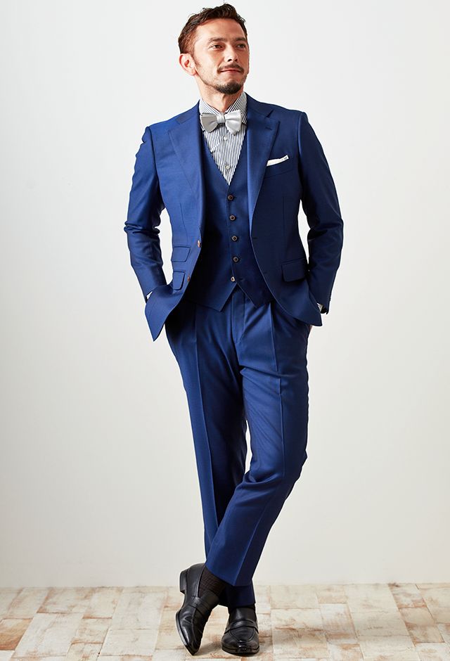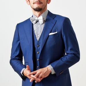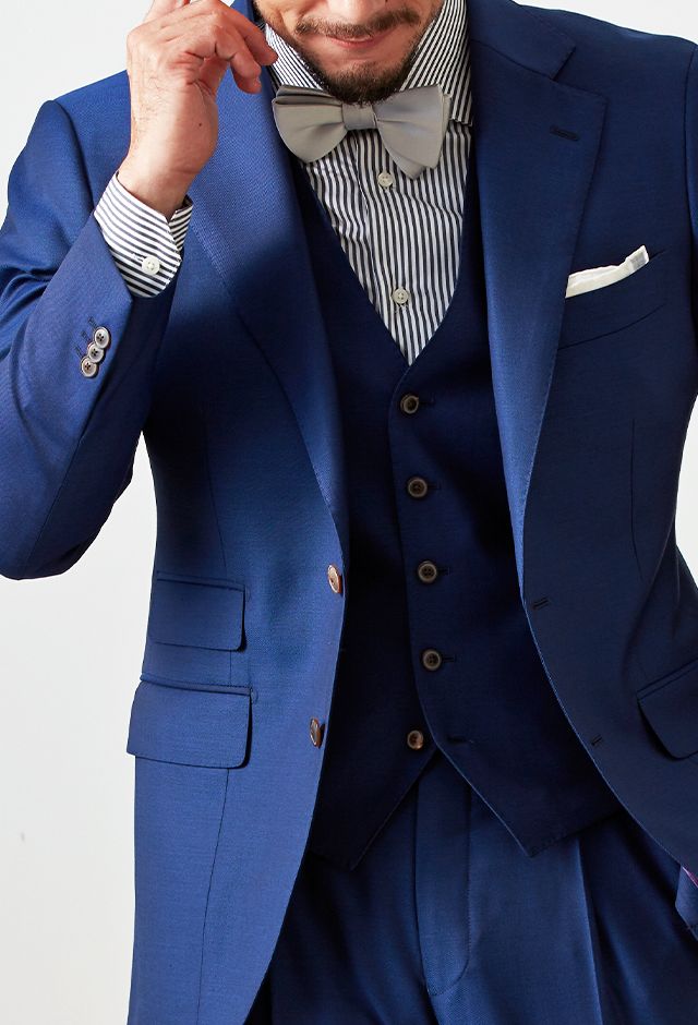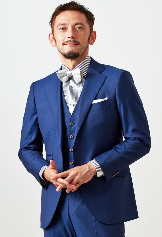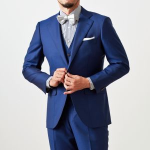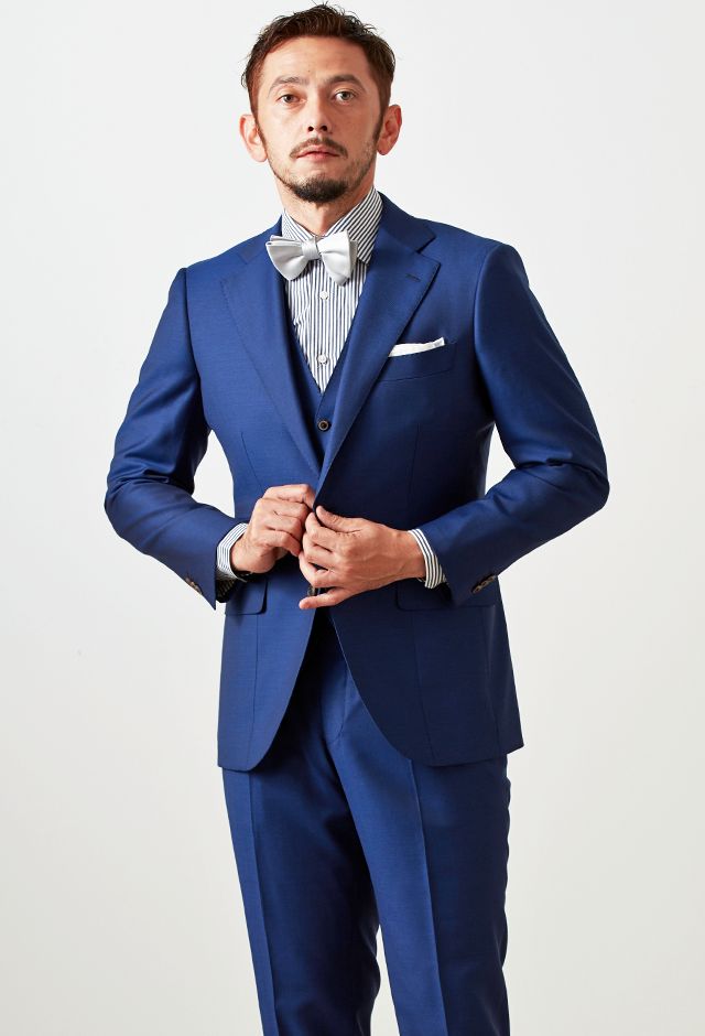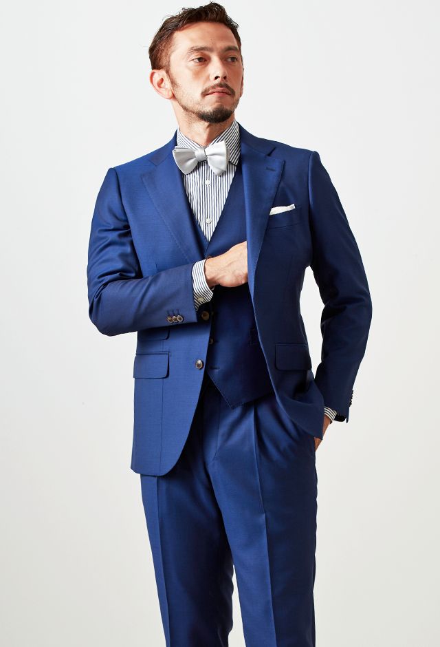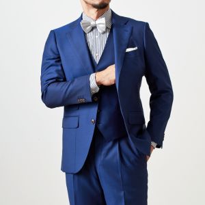 ストレッチ性の高い生地が大好評のイタリアブランド「トラバルド・トーニャ」で仕立てたスーツです。シンプルな無地が発色の綺麗なブルーカラーを際立たせるスタイルで、オールシーズン着用していただけます。最高峰グレードの「サルトリアモデル」で極上の着心地を味わうことが出来ます。裏地には色気のある紫色をチョイス、ポケットはチェンジポケットでオーダーならではの仕上がりに。ストライプシャツに蝶ネクタイを合わせた、パーティー用スーツとして重宝するコーデです。※生地在庫は変動いたしますのでご了承くださいませ。