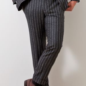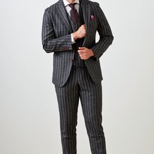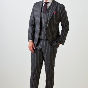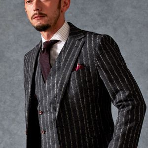 高品質でコストパフォーマンスに優れたイタリアブランド「カノニコ」で仕立てたスーツです。雰囲気のあるグレーに印象的なストライプ柄が入ったお洒落なスタイルで、秋冬シーズンの生地になります。肩パットや芯地を極力排したアンコンモデルでジャケットを仕立てました。ダブルベストのスリーピースにすることでフォーマル感をアップ。ジャケットを脱いでもきちんとした印象に。裏地は冬を彩るタータンチェック柄で季節感のある仕上がりに。ネクタイの色で全体を引き締めつつ、小物は同系色でまとめたコーデです。※生地在庫は変動いたしますのでご了承くださいませ。