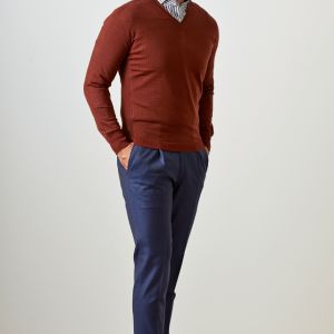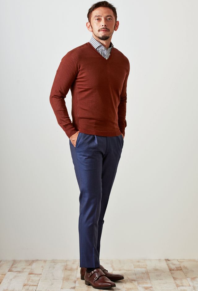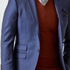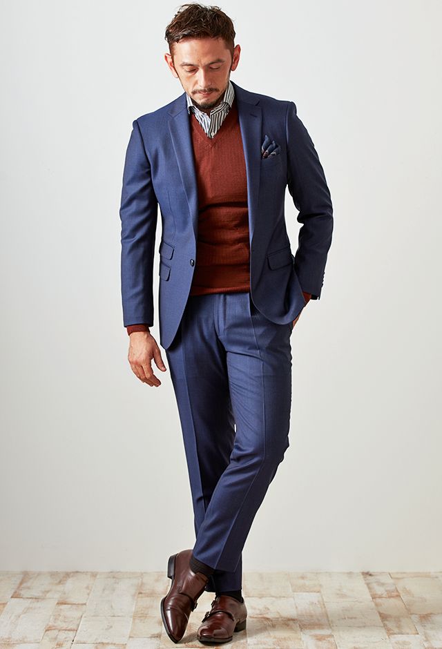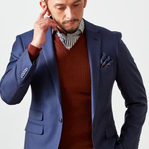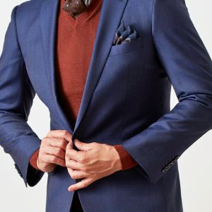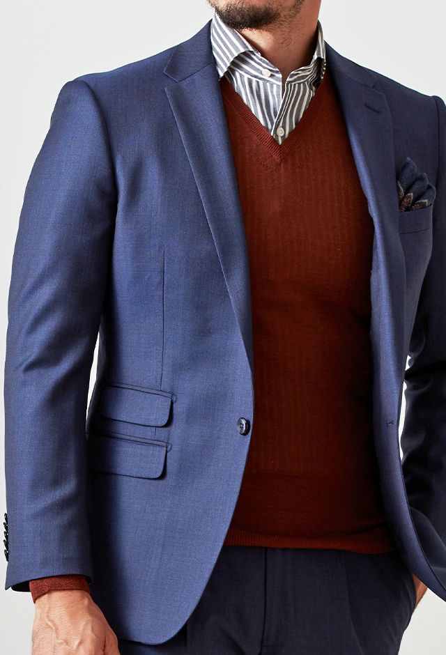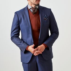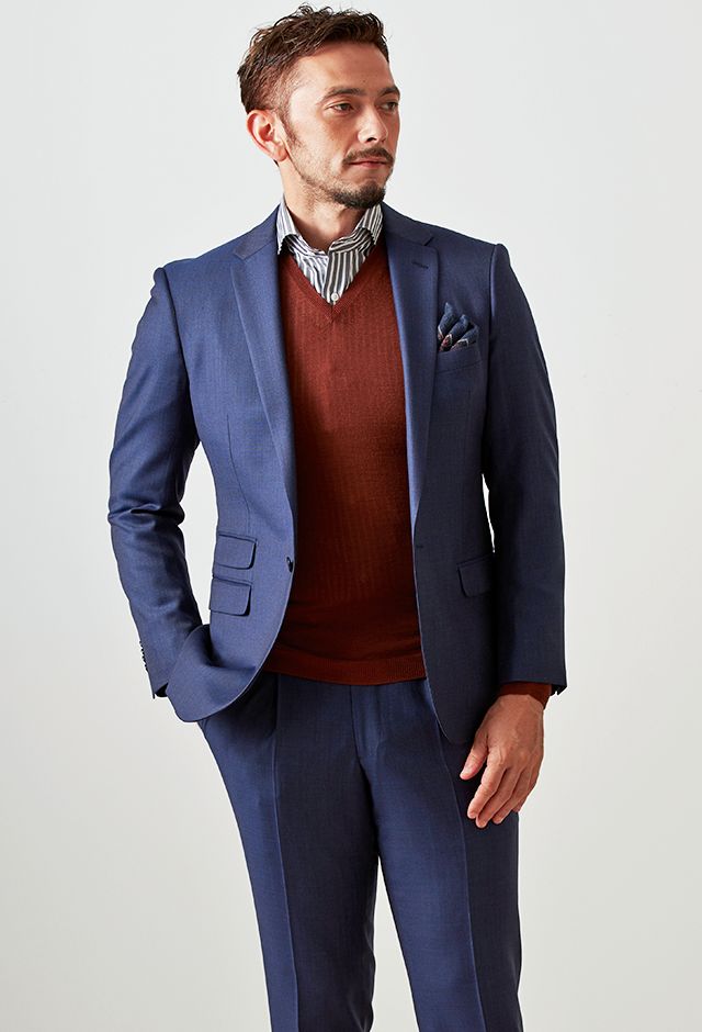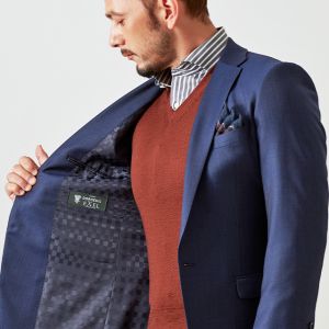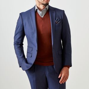 80ケ国以上にファンを持つ世界的なイギリスブランド「ドーメル」で仕立てたスーツです。滑らかな質感と存在感の強いネイビーカラーのスタイルでオールシーズン着用していただけます。モードな空気感を醸し出すことが出来るスリムフィットモデルでお仕立てしました。小さいポケットが追加されたチェンジポケットオプションで、オーダーならではのお洒落を。表地に合わせネイビーの市松模様の裏地でさりげない華やかさをプラス。エンジのニットをアクセントにした、温かみのある雰囲気を醸し出すコーデに仕上げました。※生地在庫は変動いたしますのでご了承くださいませ。