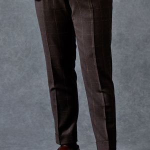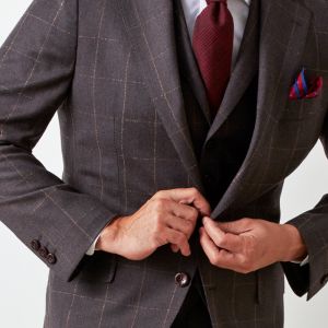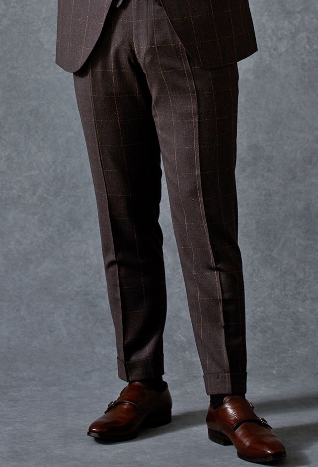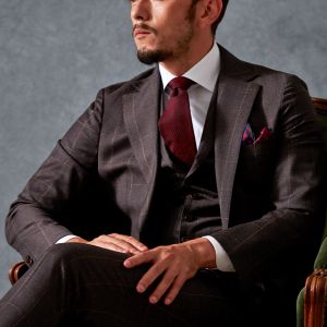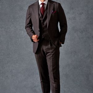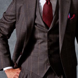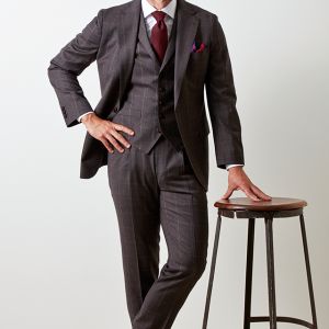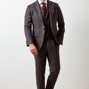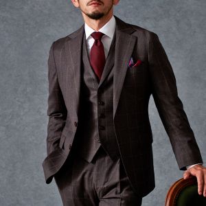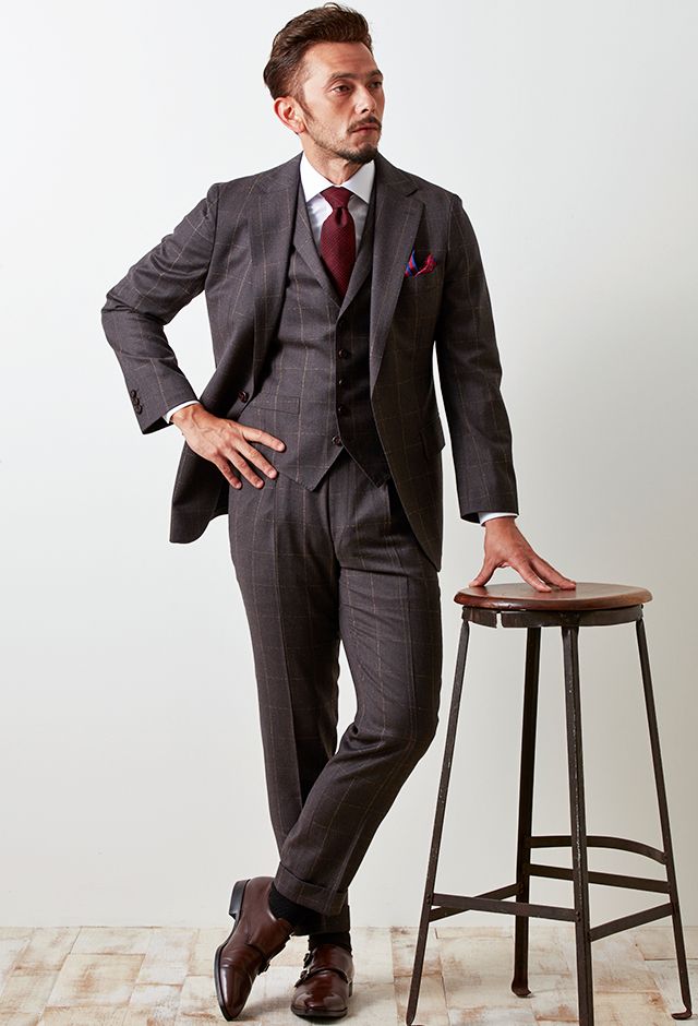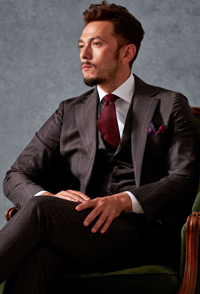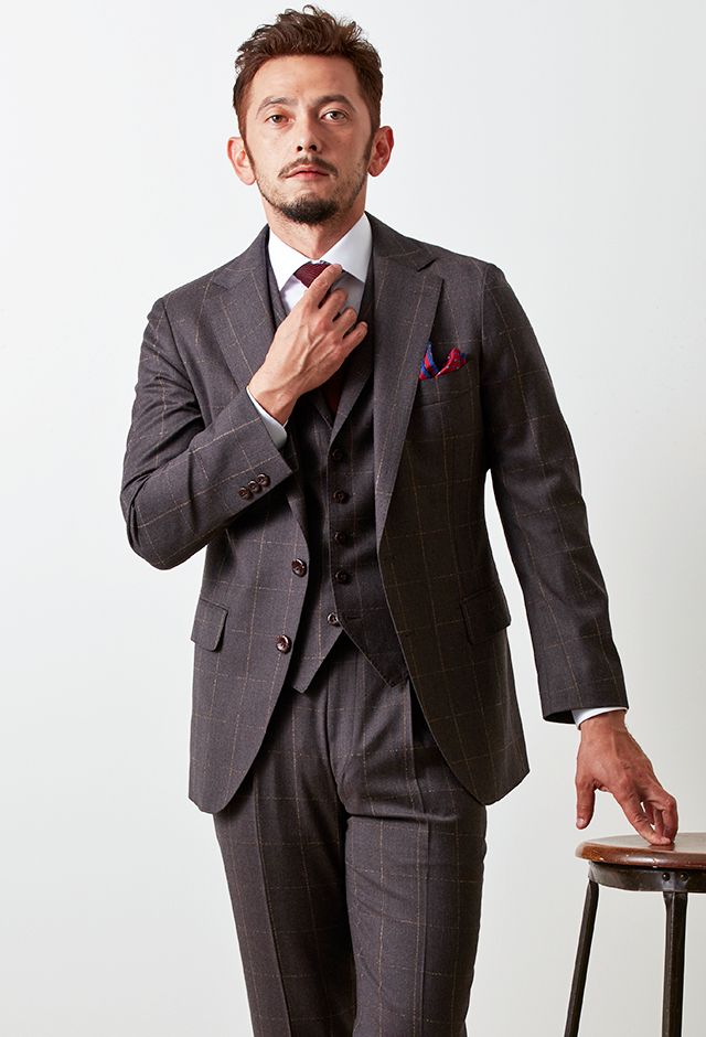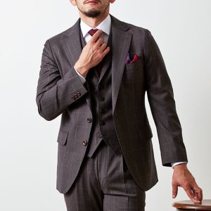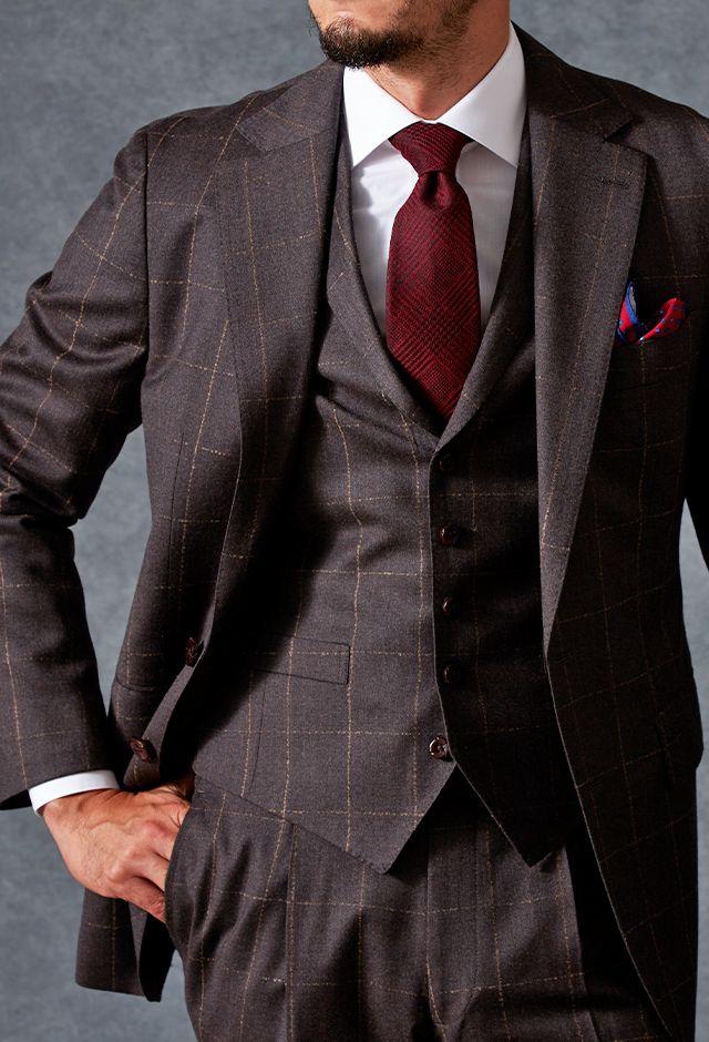 ストレッチ性の高い生地が大好評のイタリアブランド「トラバルド・トーニャ」で仕立てたスーツです。トレンドのブラウンカラーに同系色の上品なチェック柄が入ったスタイルで、秋冬シーズンの生地になります。肩パットや芯地を極力排したアンコンモデルでジャケットを仕立てました。スリーピースのベストには襟付きのラペルドベストをチョイスして立体感のある仕上がり。ブラウンと相性の良いワインレッドカラーをセットにした、存在感あるコーデです。※生地在庫は変動いたしますのでご了承くださいませ。